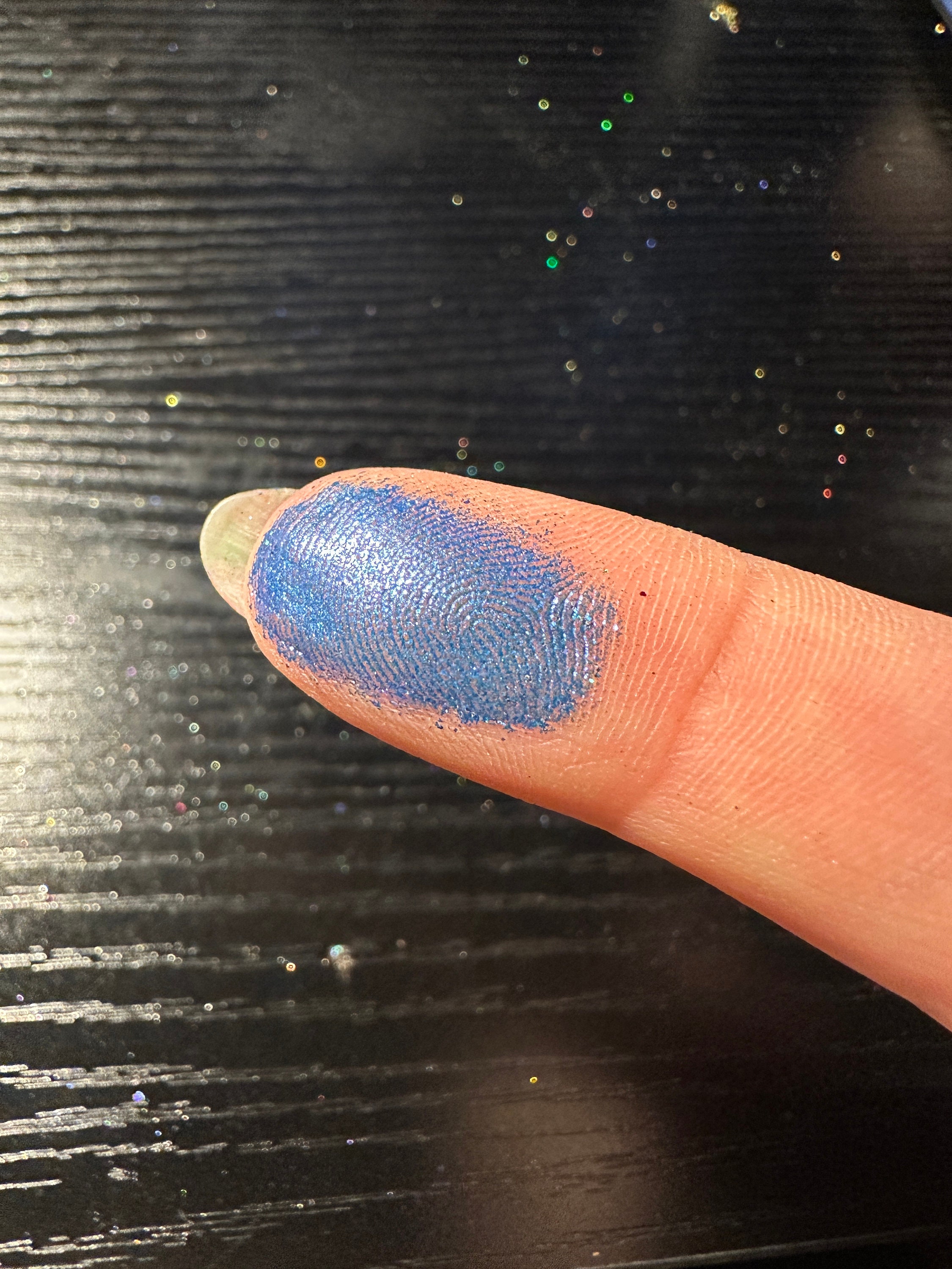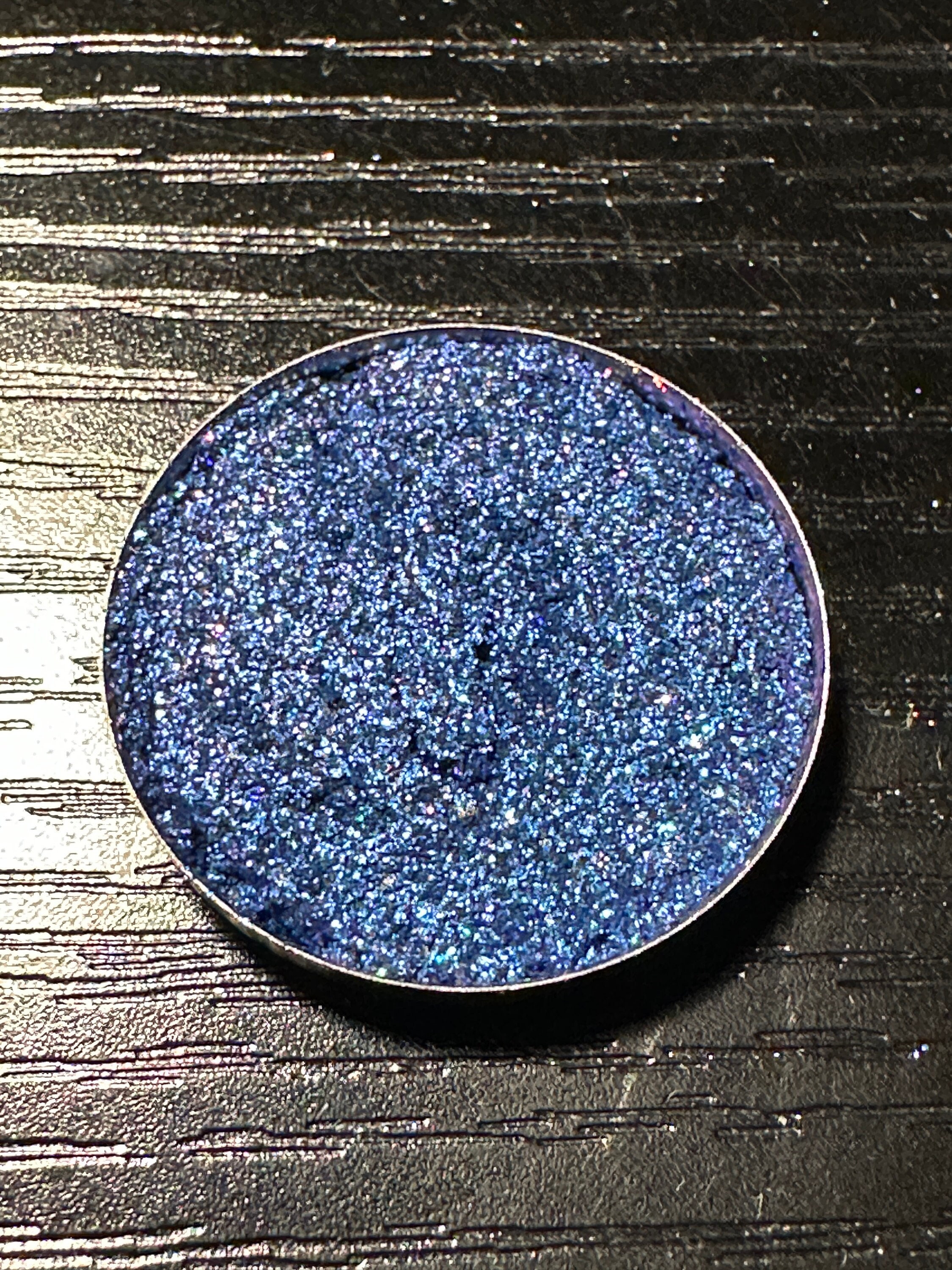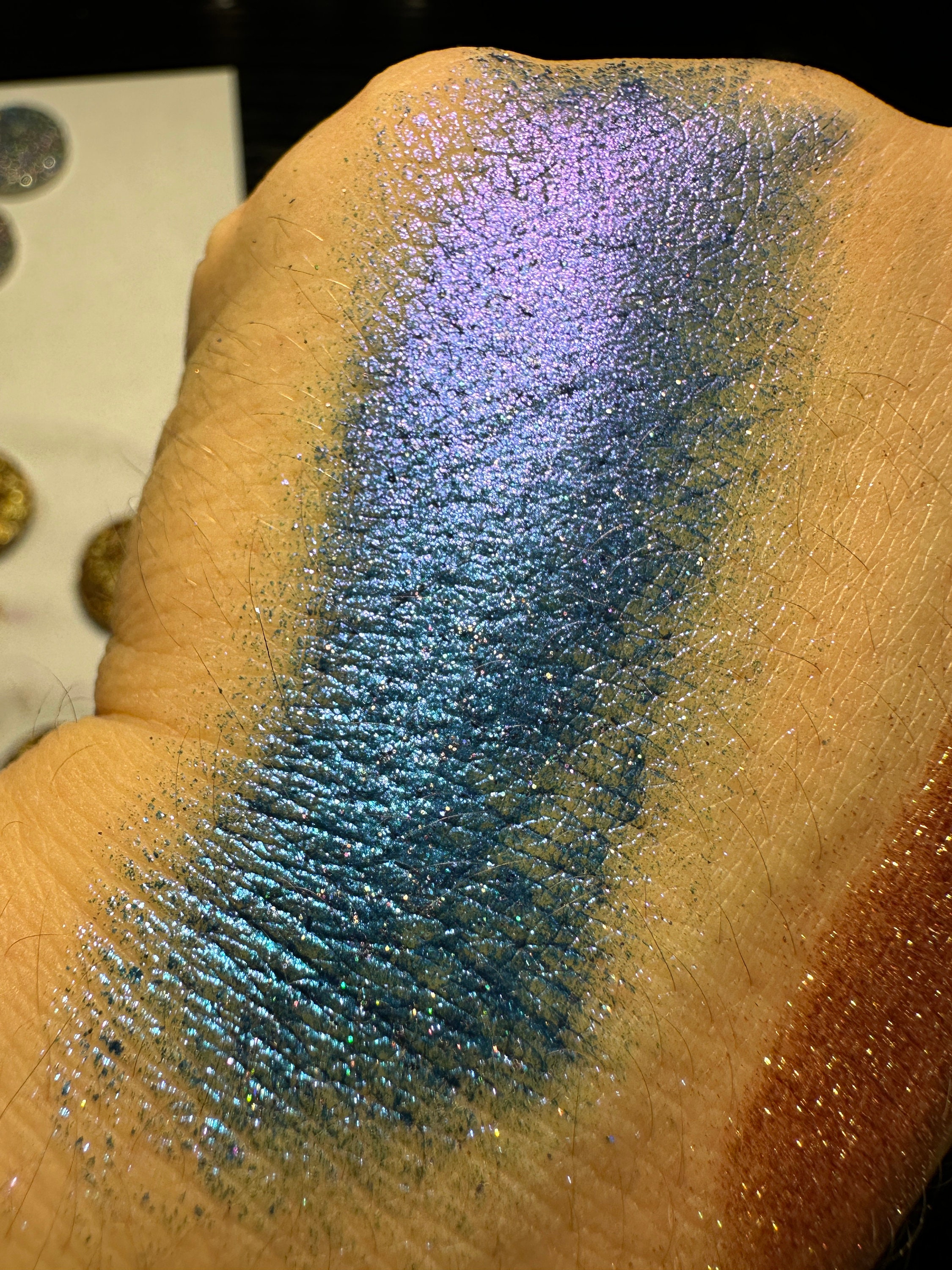 I mix, pour, and press each eyeshadow individually and by hand, which means they are all small batch. These are not made with machines and as such, minor flaws on the surface may appear. All the shadows weigh the same, and any flaw does not affect the performance at all. Photographing glitter is hard, so I do try my best, but remember that different lighting conditions and screen settings may make each shade slightly different in person.