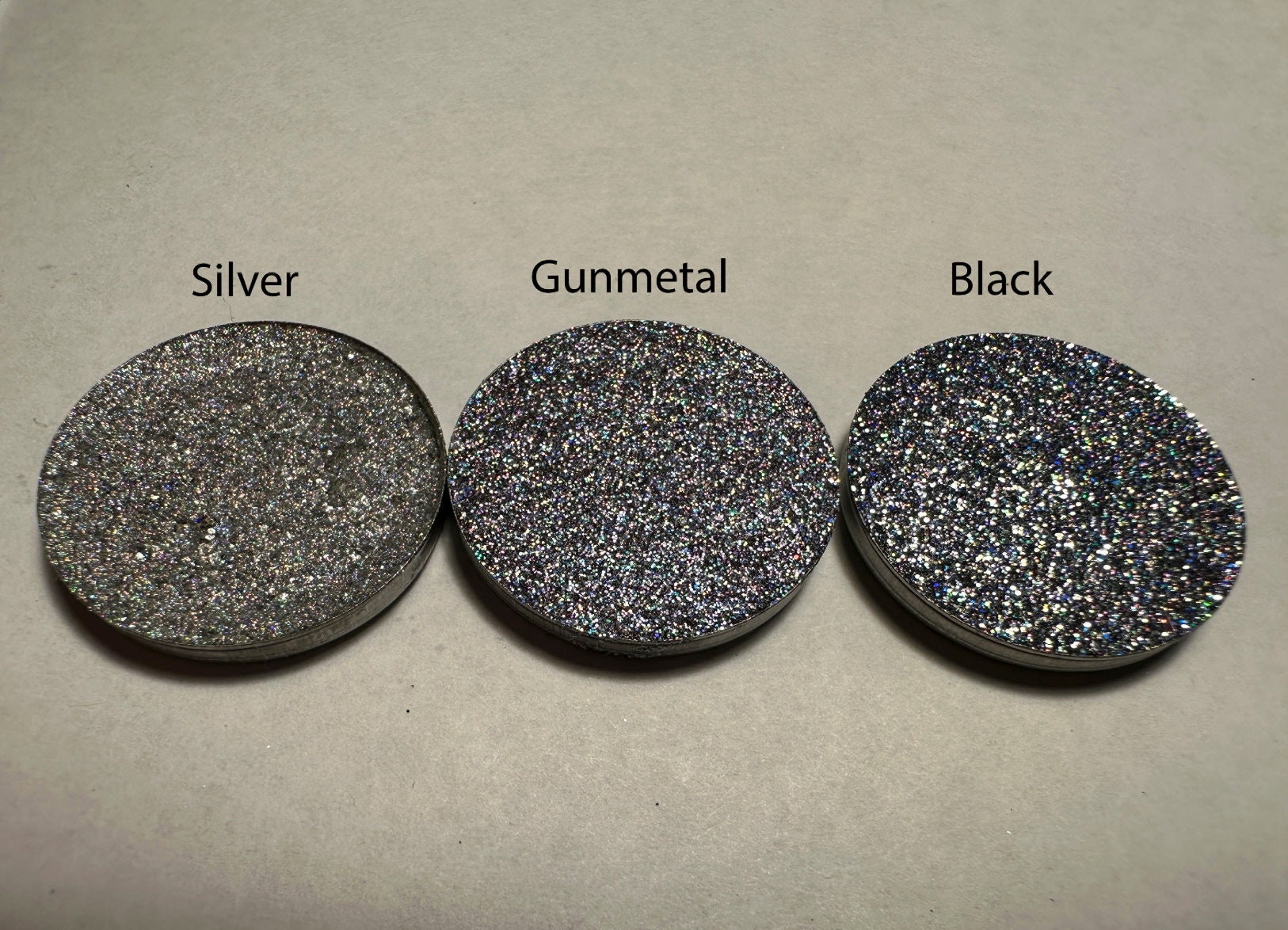 I mix, pour, and press each eyeshadow individually and by hand, which means they are all small batch. These are not made with machines and as such, minor flaws on the surface may appear. All the shadows weigh the same, and any flaw does not affect the performance at all. Photographing glitter is hard, so I do try my best, but remember that different lighting conditions and screen settings may make each shade slightly different in person.