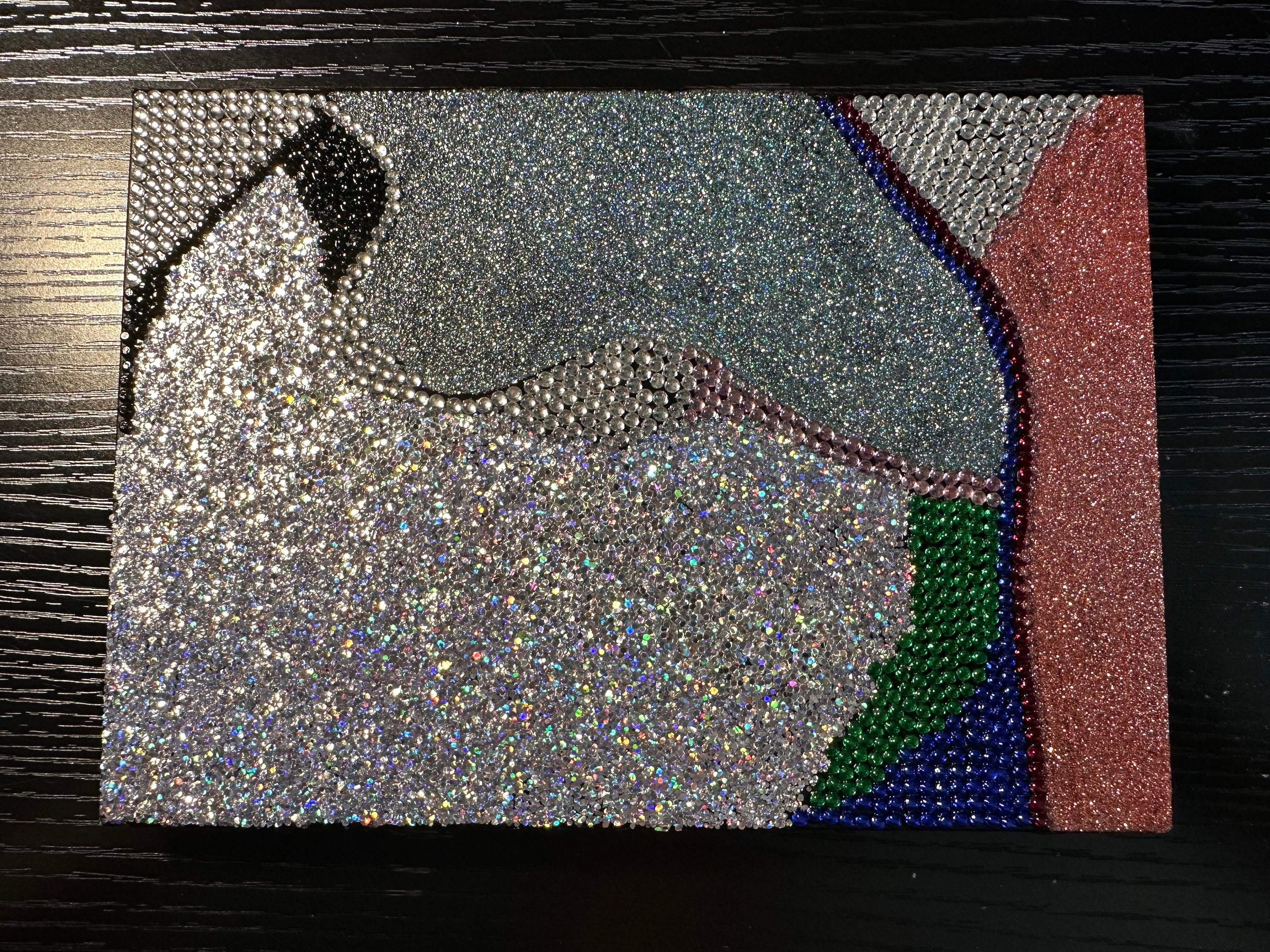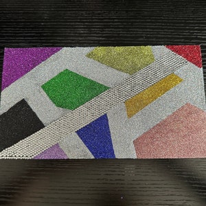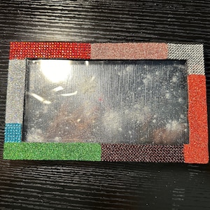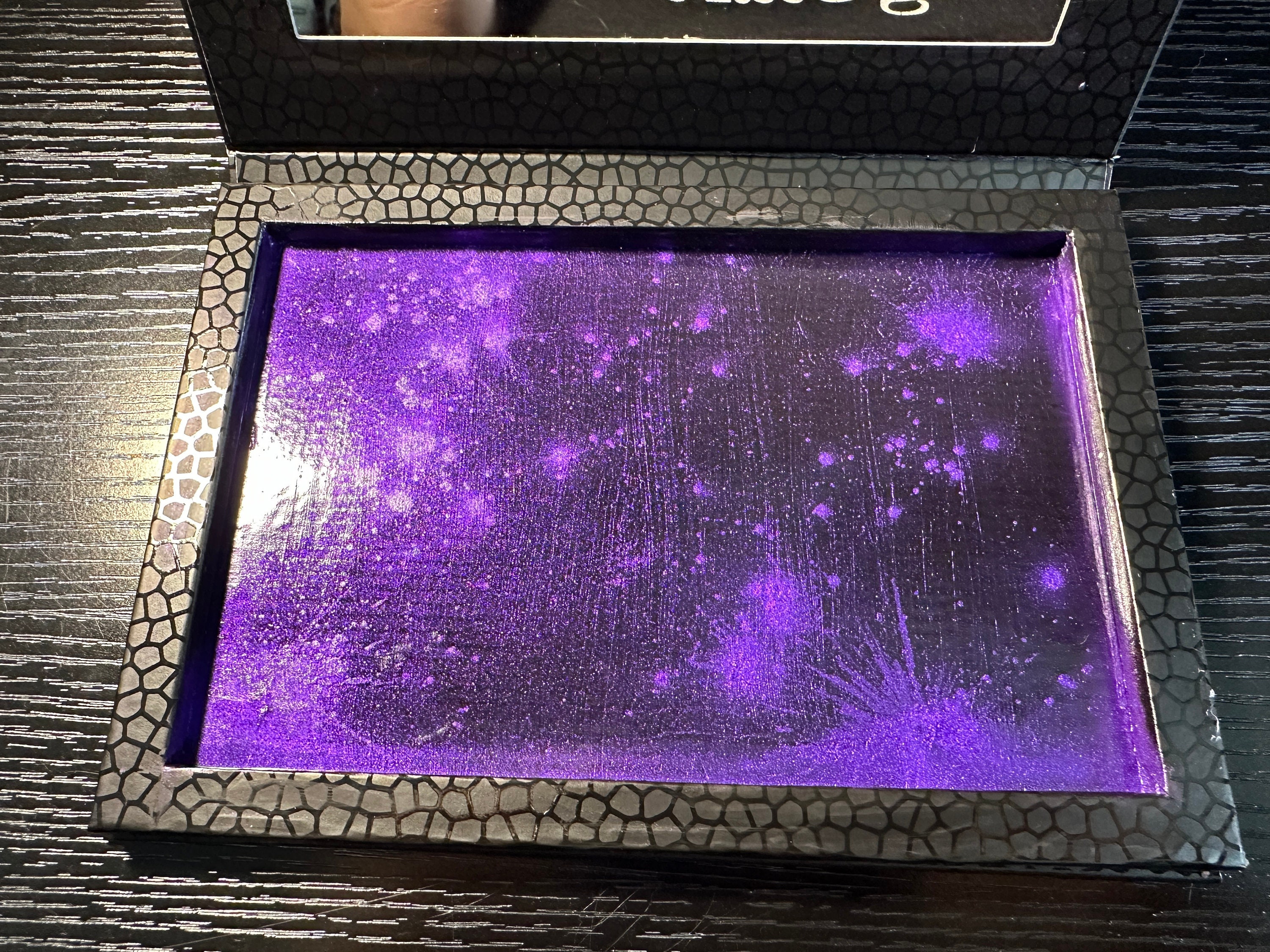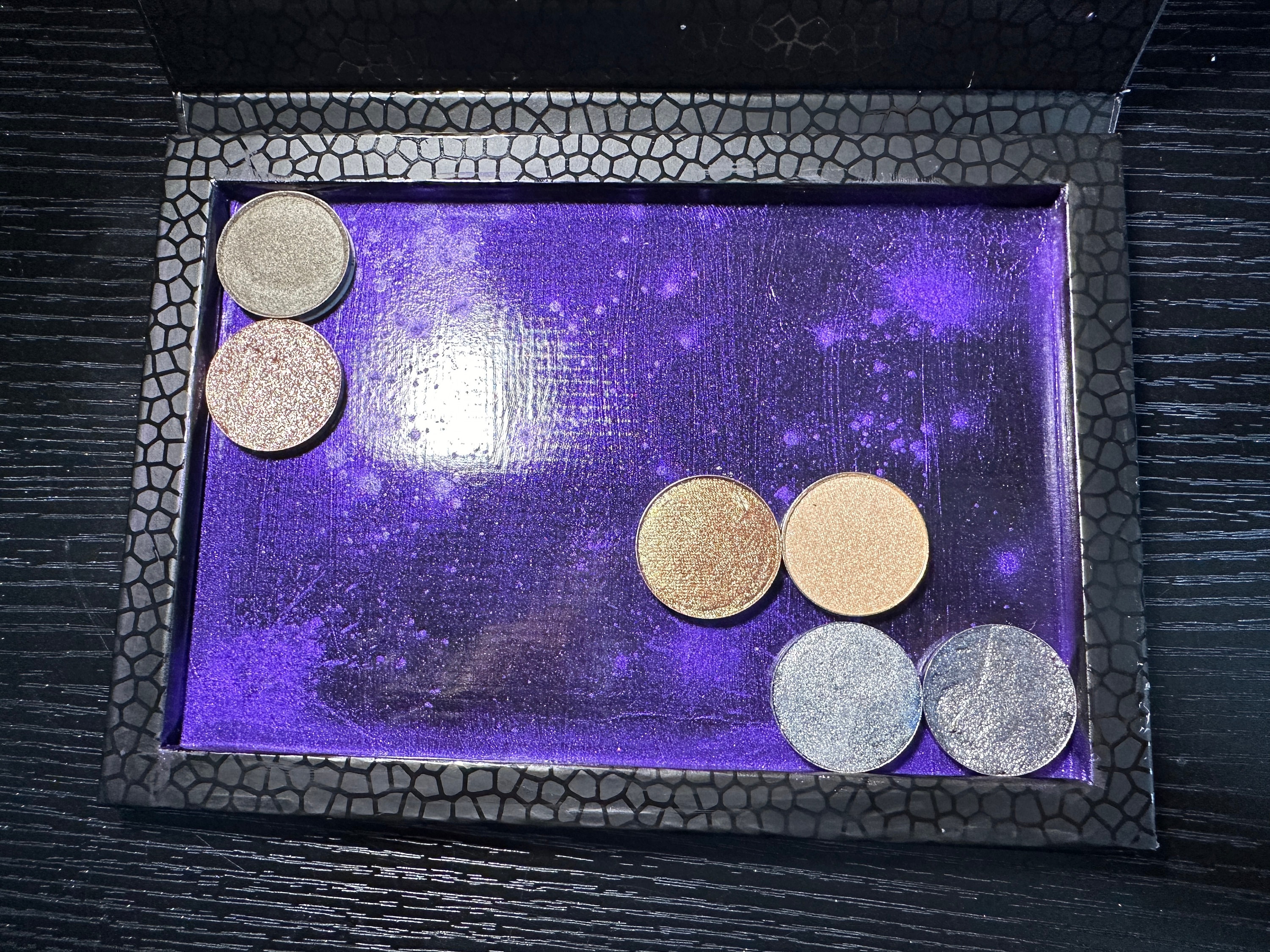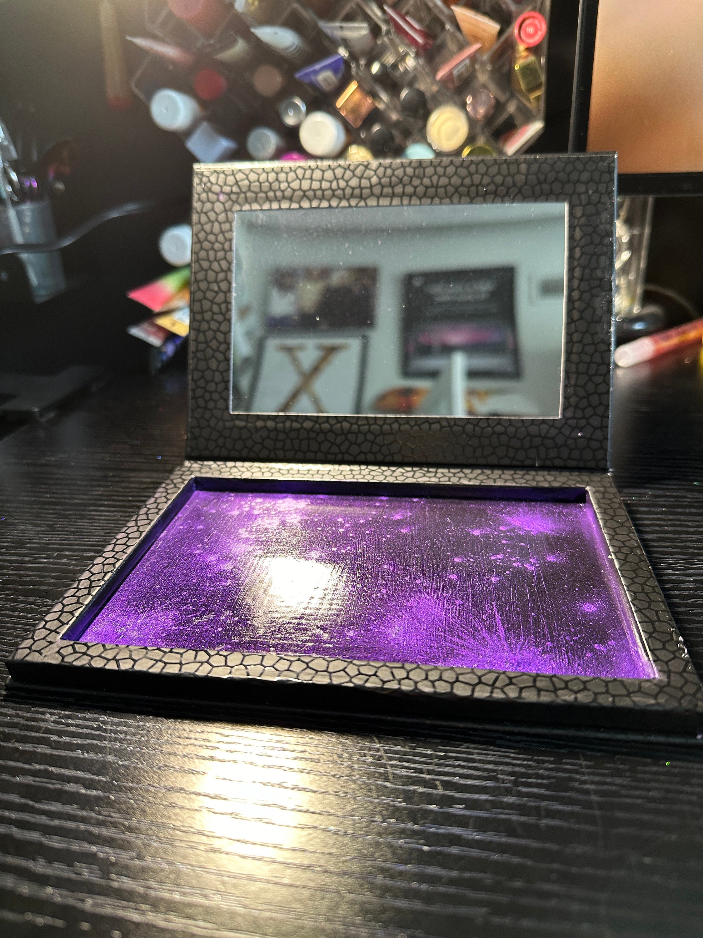 This makeup palette is decorated with glitter and over 400 hand-set rhinestones. It has been sealed with clear Krylon to ensure very little glitter fallout, if any. It holds 24x magnetic 26mm pans. It measures 9 1/4" by 7 1/4" when closed. The magnetic portion where the makeup goes has been splattered with purple mica and sealed. The makeup in the photo is not included. Just the case.