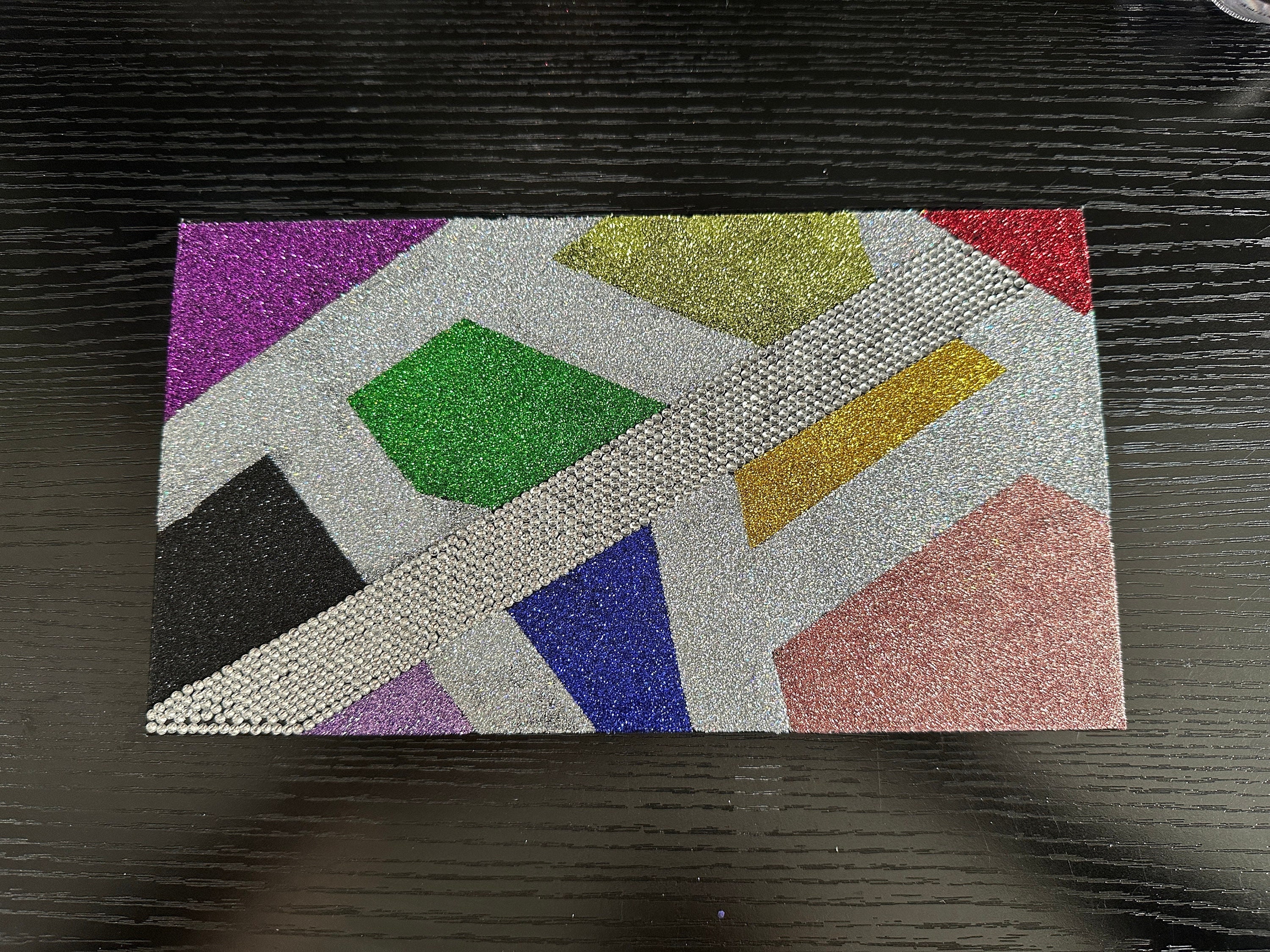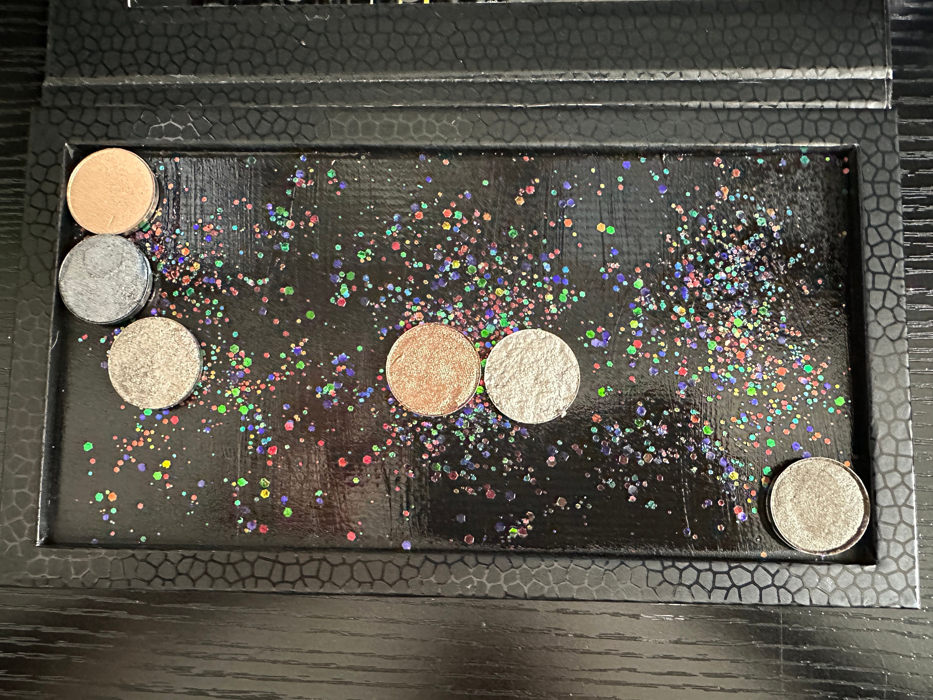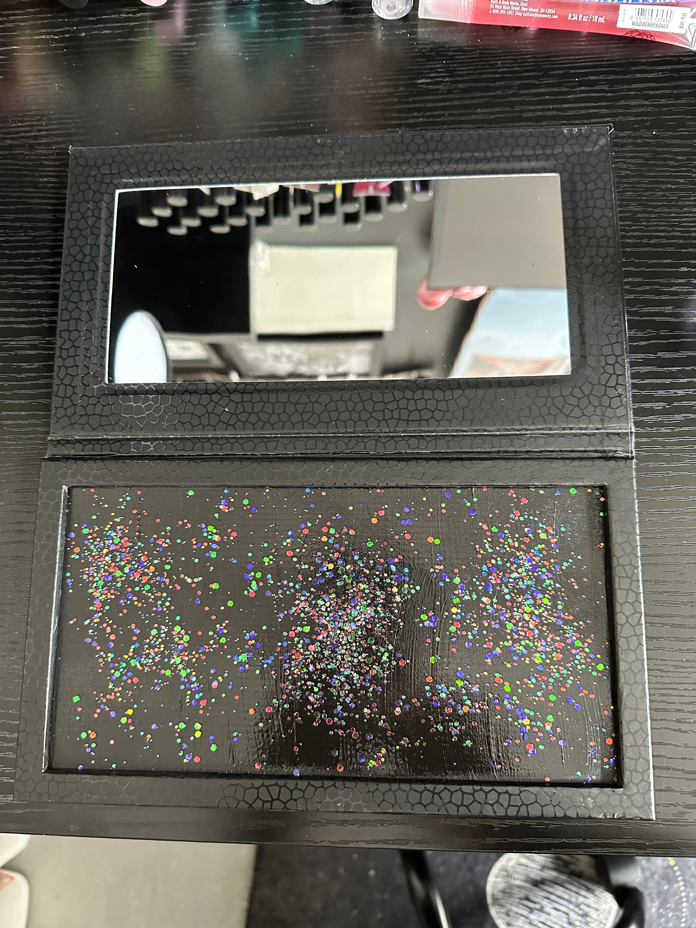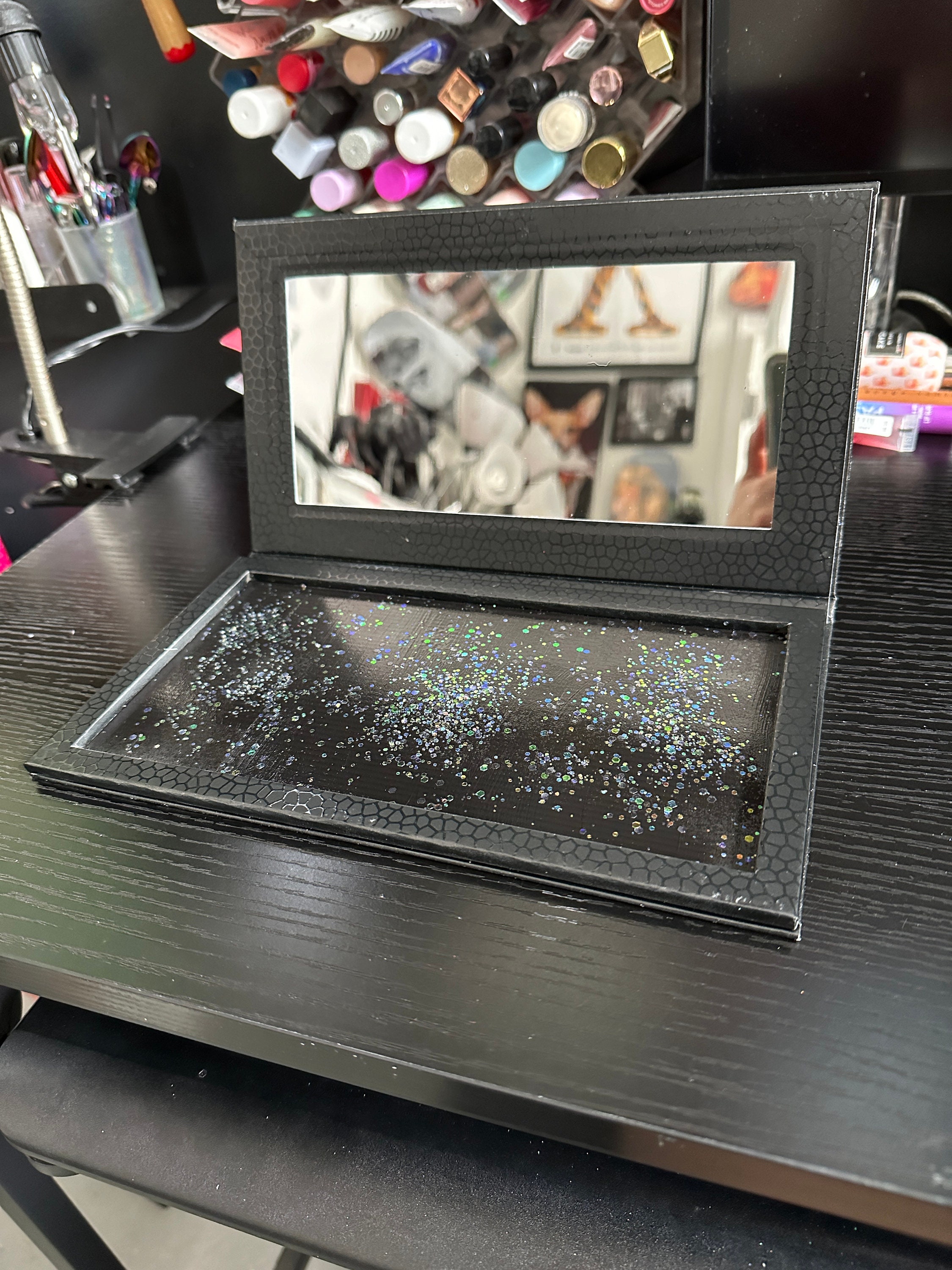 This makeup palette is decorated with rainbow and silver holographic glitter and over 850 hand-set rhinestones. It has been sealed with clear Krylon to ensure very little glitter fallout, if any. It holds 32x magnetic 26mm pans. It measures 9 3/4" by 5 1/2" when closed. The magnetic portion where the makeup goes has been splattered with iridescent glitter and sealed while the back has been coated in black glitter and sealed. The makeup in the photo is not included. Just the case.