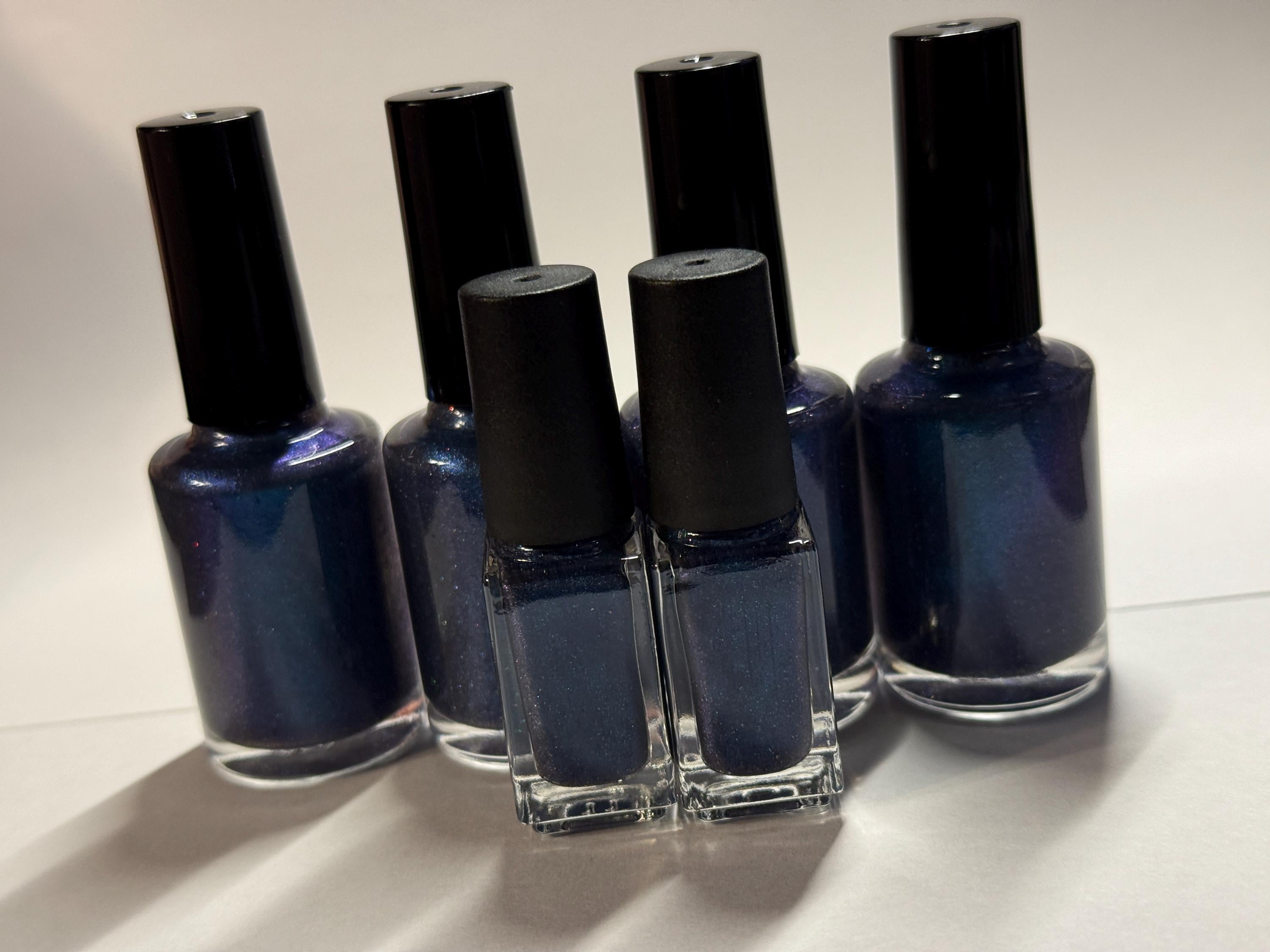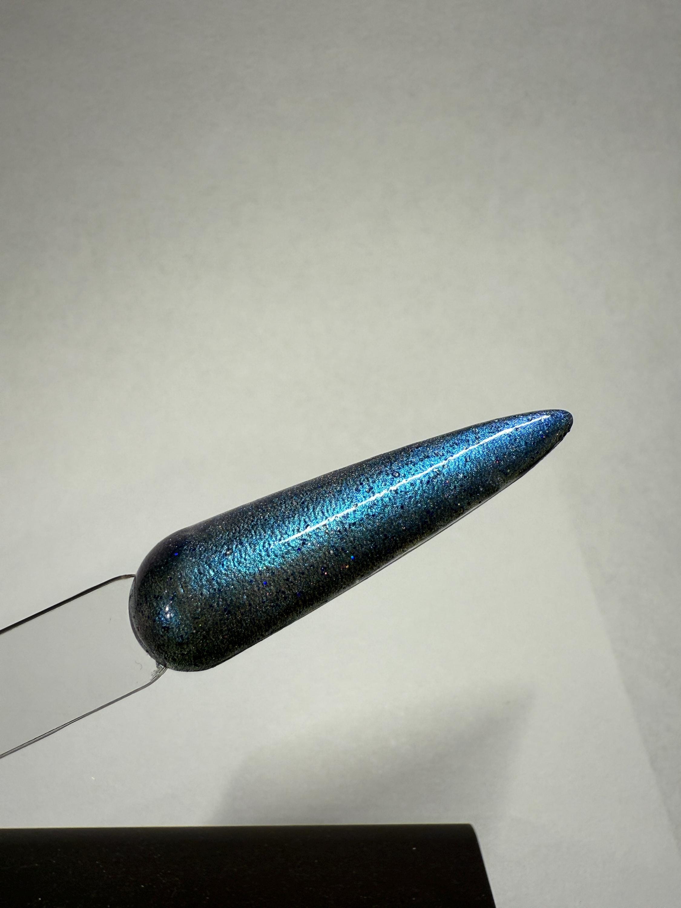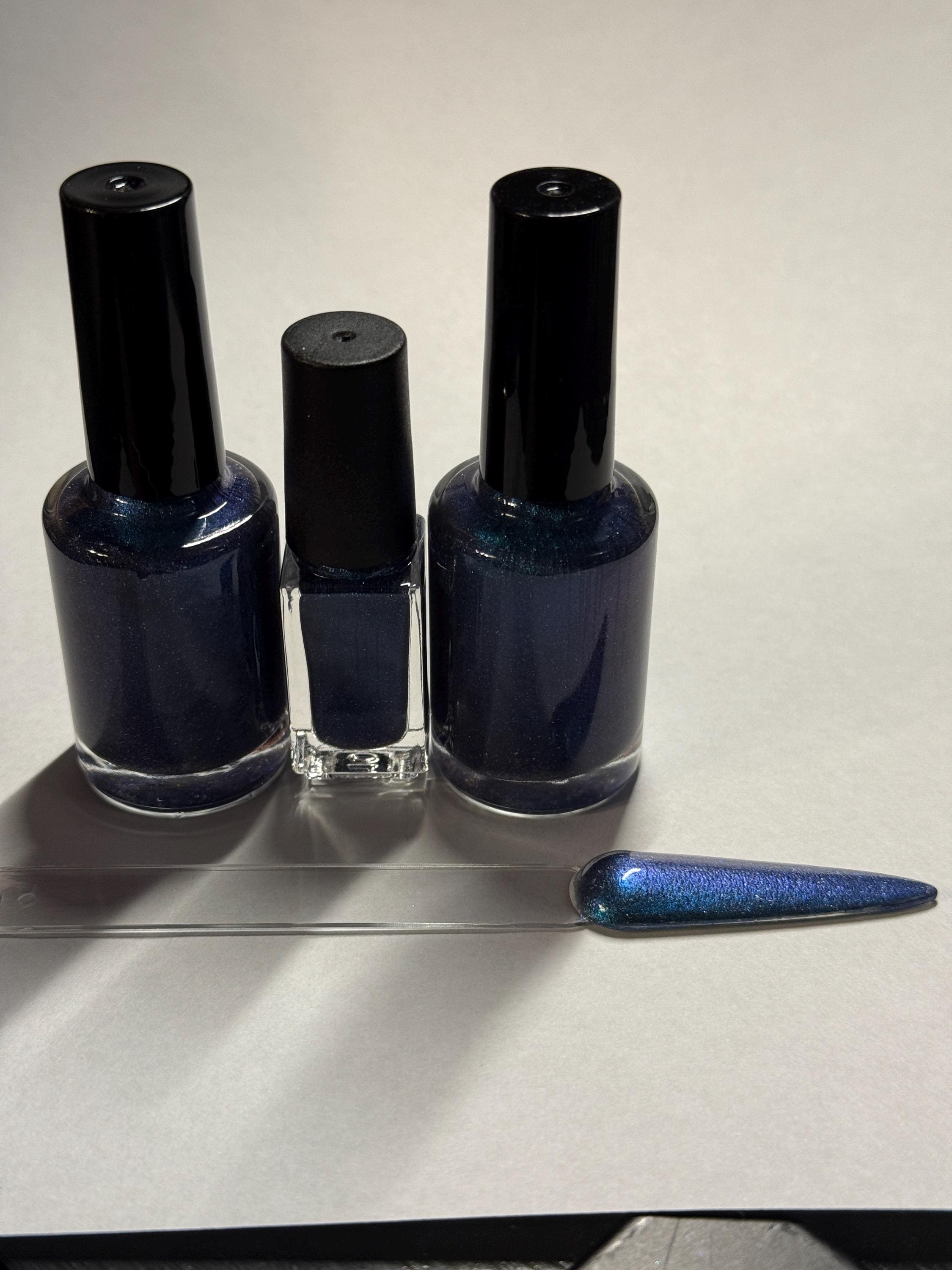 This nail polish comes in either 5 or 15ml bottles and is a blue/green duochrome shift with a fine silver holographic base. You will need a magnet to take advantage of the magnetic properties within. It does not come with a magnet but if you'd like me to include one for $1, please check my other listings.