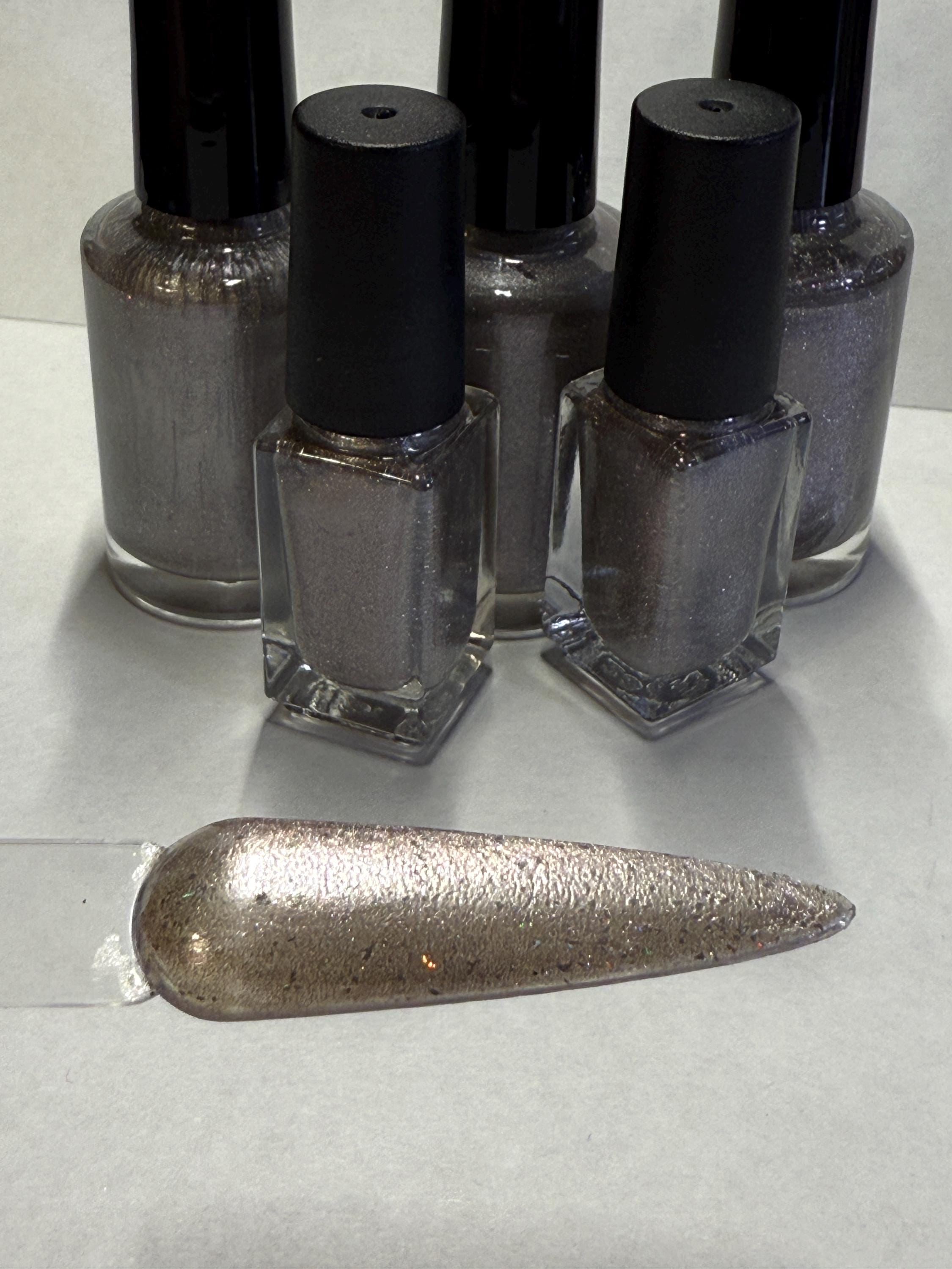 This nail polish comes in either 5 or 15ml bottles and is a grayish beige with a fine silver holographic base. You will need a magnet to take advantage of the magnetic properties within. It does not come with a magnet but if you'd like me to include one for $1, please check my other listings.