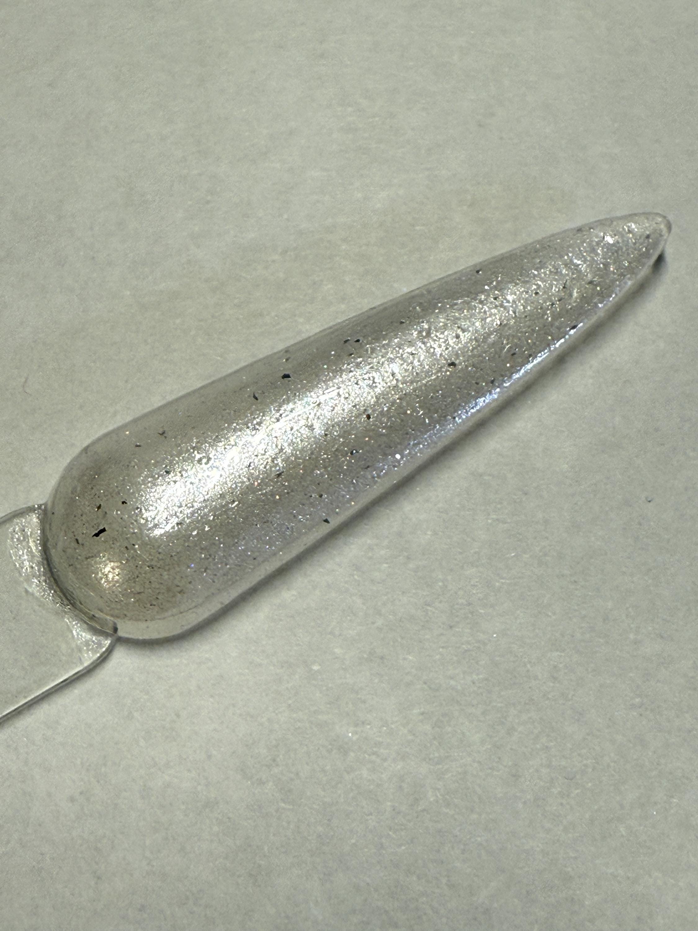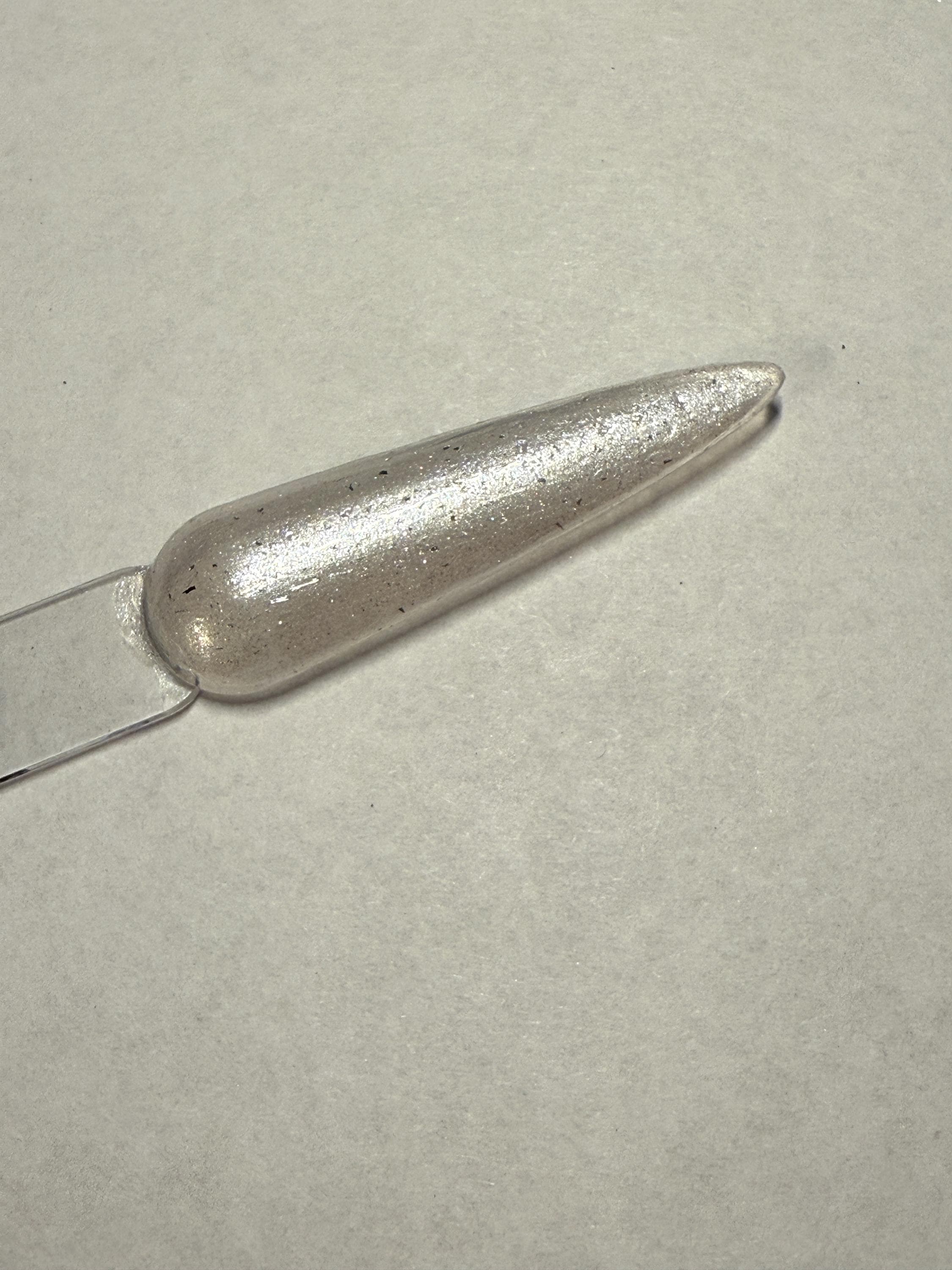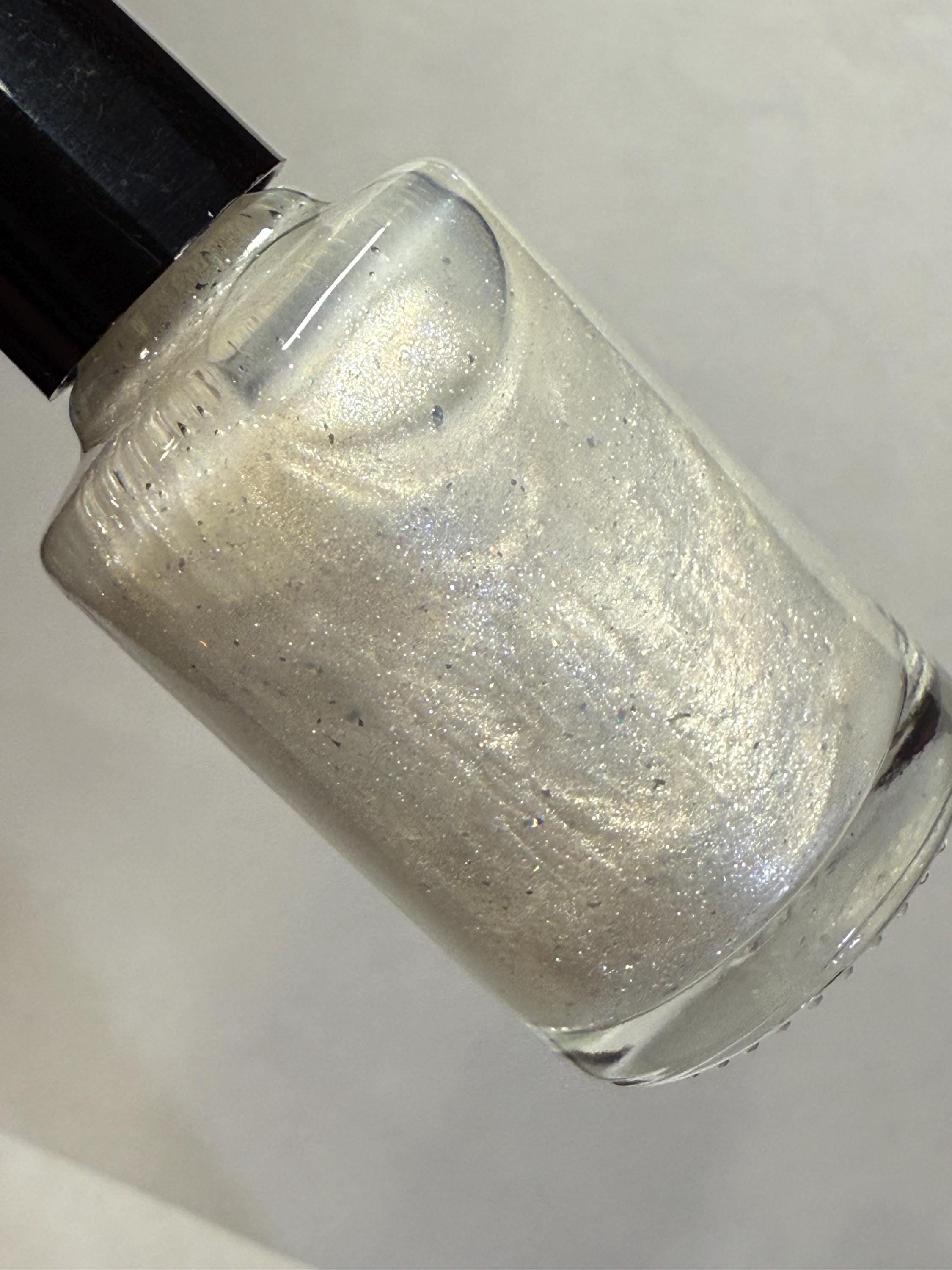 This nail polish comes in either 5 or 15ml bottles and is a barely-there white shimmer with a touch of silver holo mixed in as well.