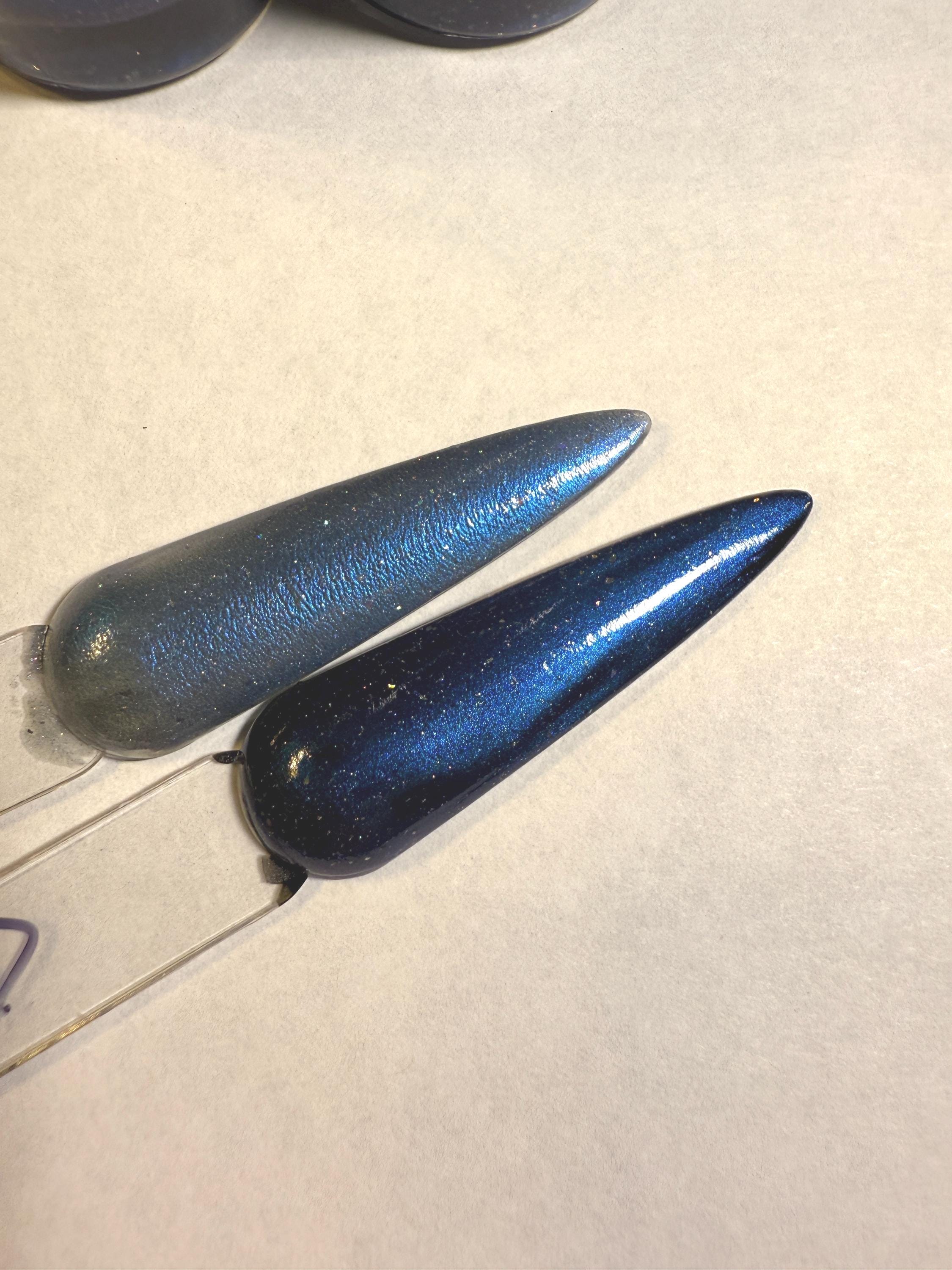 This nail polish comes in either 5 or 15ml bottles and is a cobalt blue with fine holographic flakes on a fine silver holographic base. You will need a magnet to take advantage of the magnetic properties within. It does not come with a magnet but if you'd like me to include one for $1, please check my other listings.