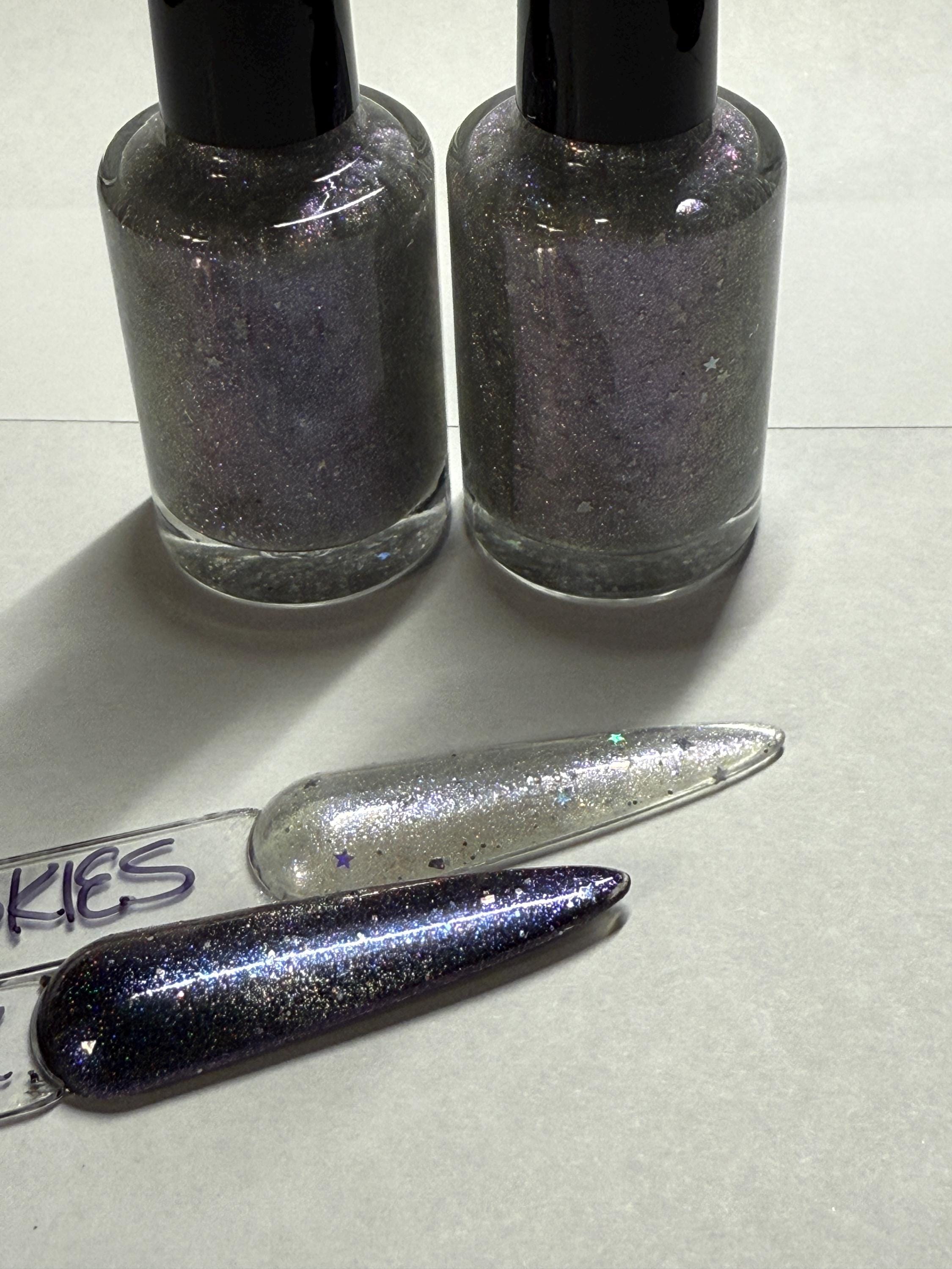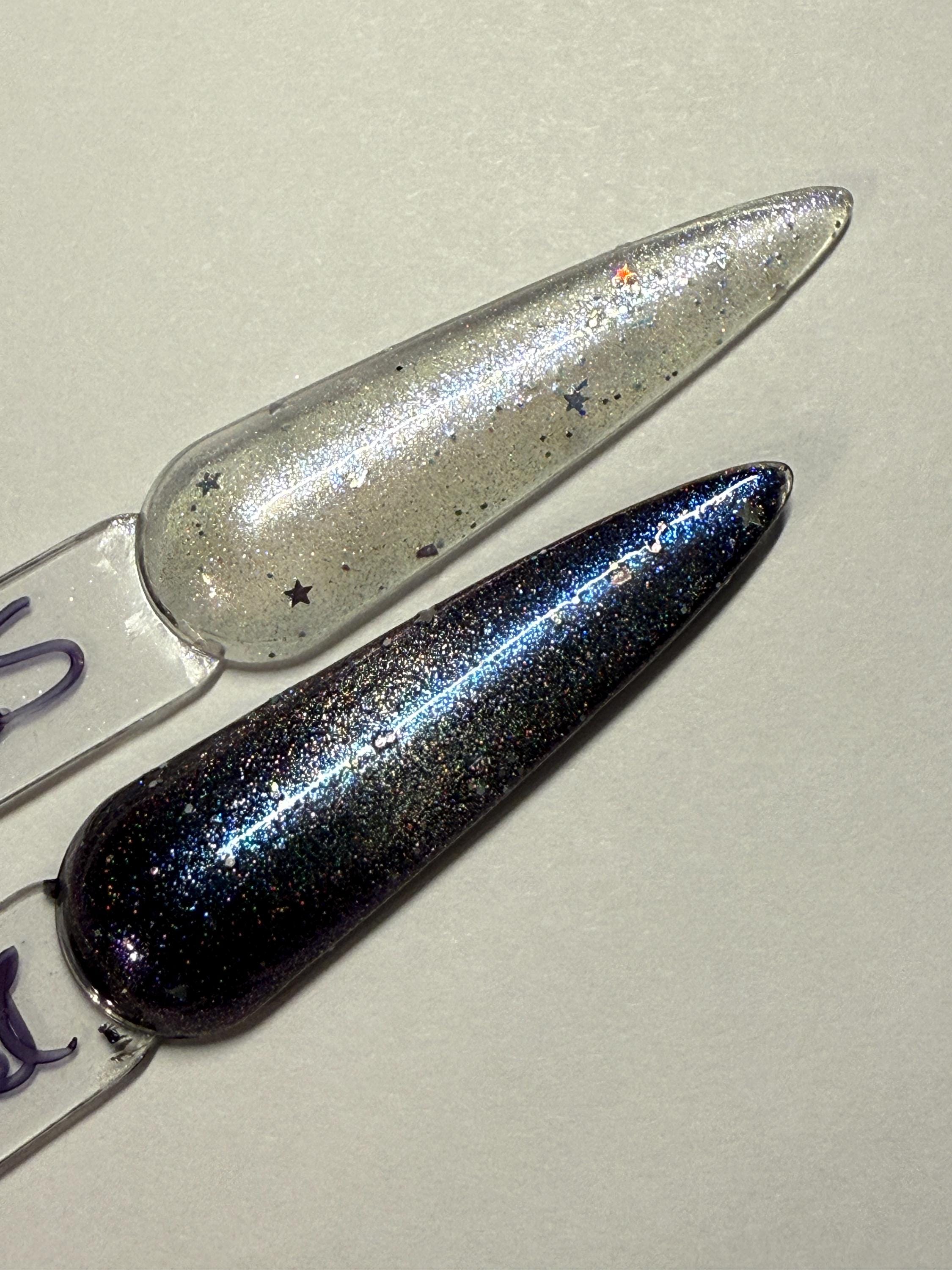 This nail polish comes in either 5 or 15ml bottles and is a purple/blue/silver chameleon with 1mm silver holographic stars. You will need a magnet to take advantage of the magnetic properties within. It does not come with a magnet but if you'd like me to include one for $1, please check my other listings.