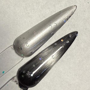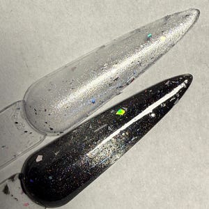 The photos/videos is one coat of Crystal Skies over a black base and magnetized using the bead method, and the other is two coats of Crystal Skies velvetized.