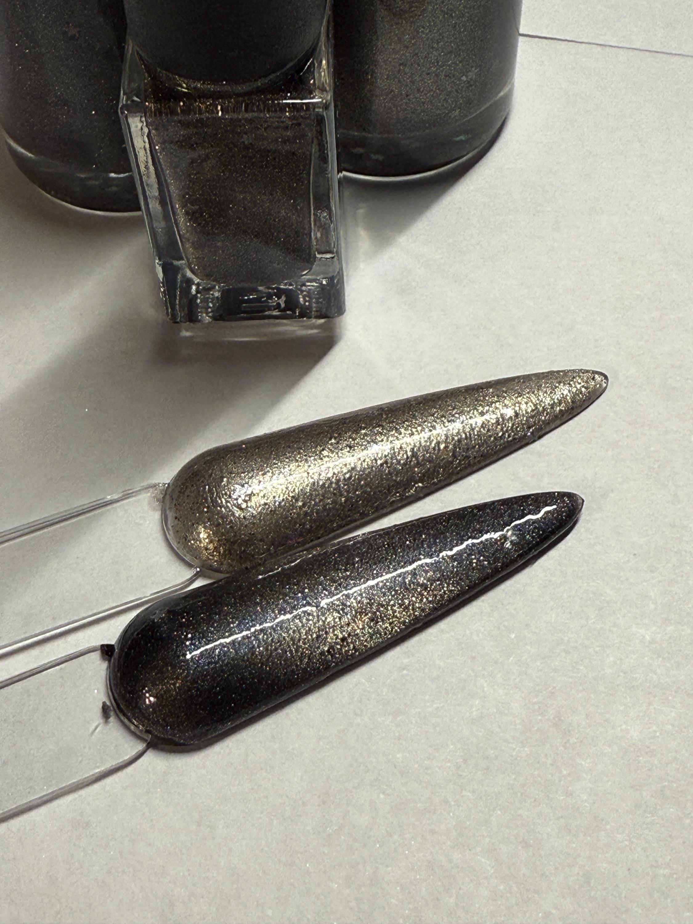 This nail polish comes in either 5 or 15ml bottles and is a silvery bronze with 1mm silver holographic stars in a fine silver holographic base. You will need a magnet to take advantage of the magnetic properties within. It does not come with a magnet but if you'd like me to include one for $1, please check my other listings.