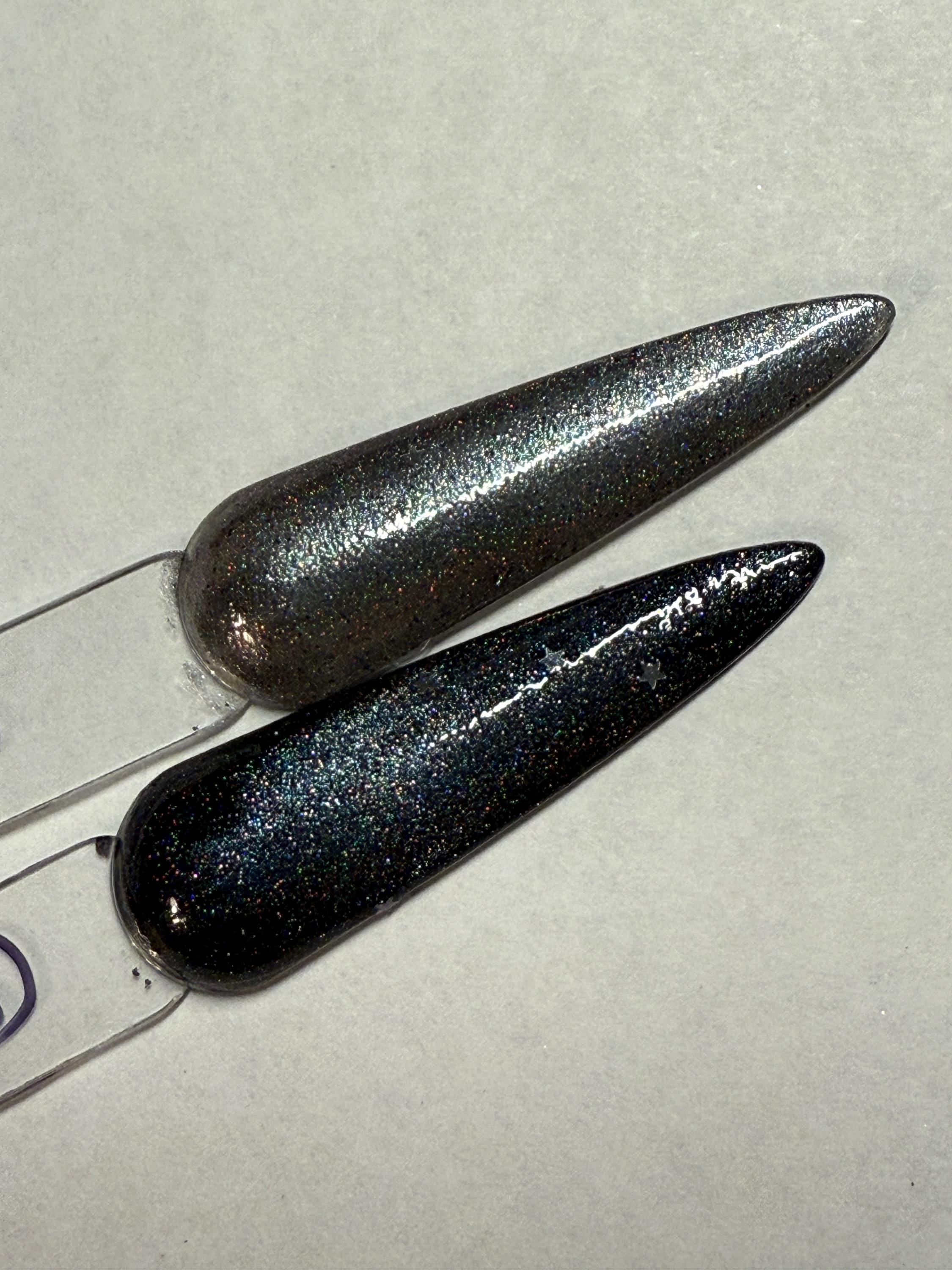 This nail polish comes in either 5 or 15ml bottles and is a black/silver with 1mm silver holographic stars in a fine blackr holographic base. You will need a magnet to take advantage of the magnetic properties within. It does not come with a magnet but if you'd like me to include one for $1, please check my other listings.