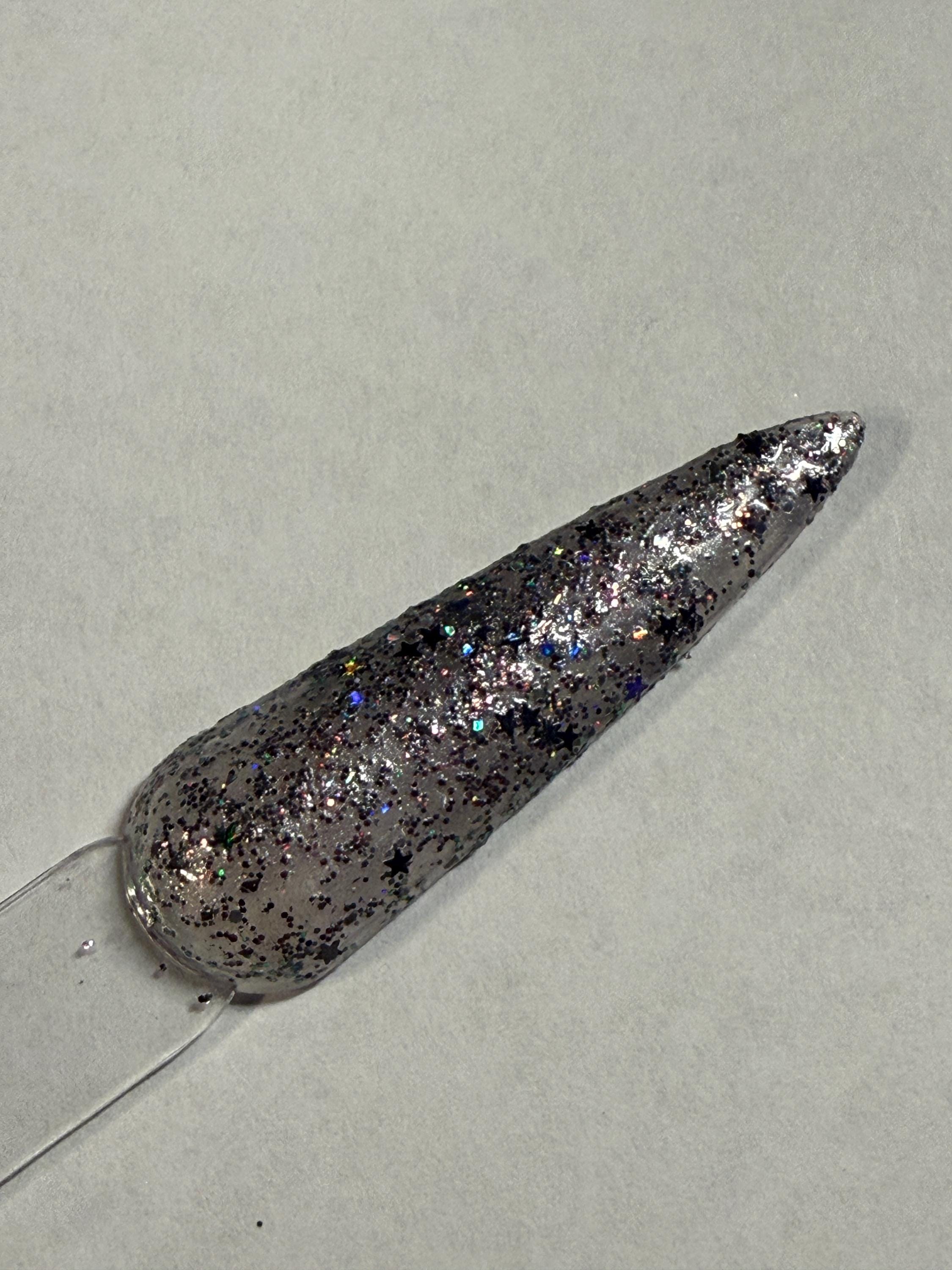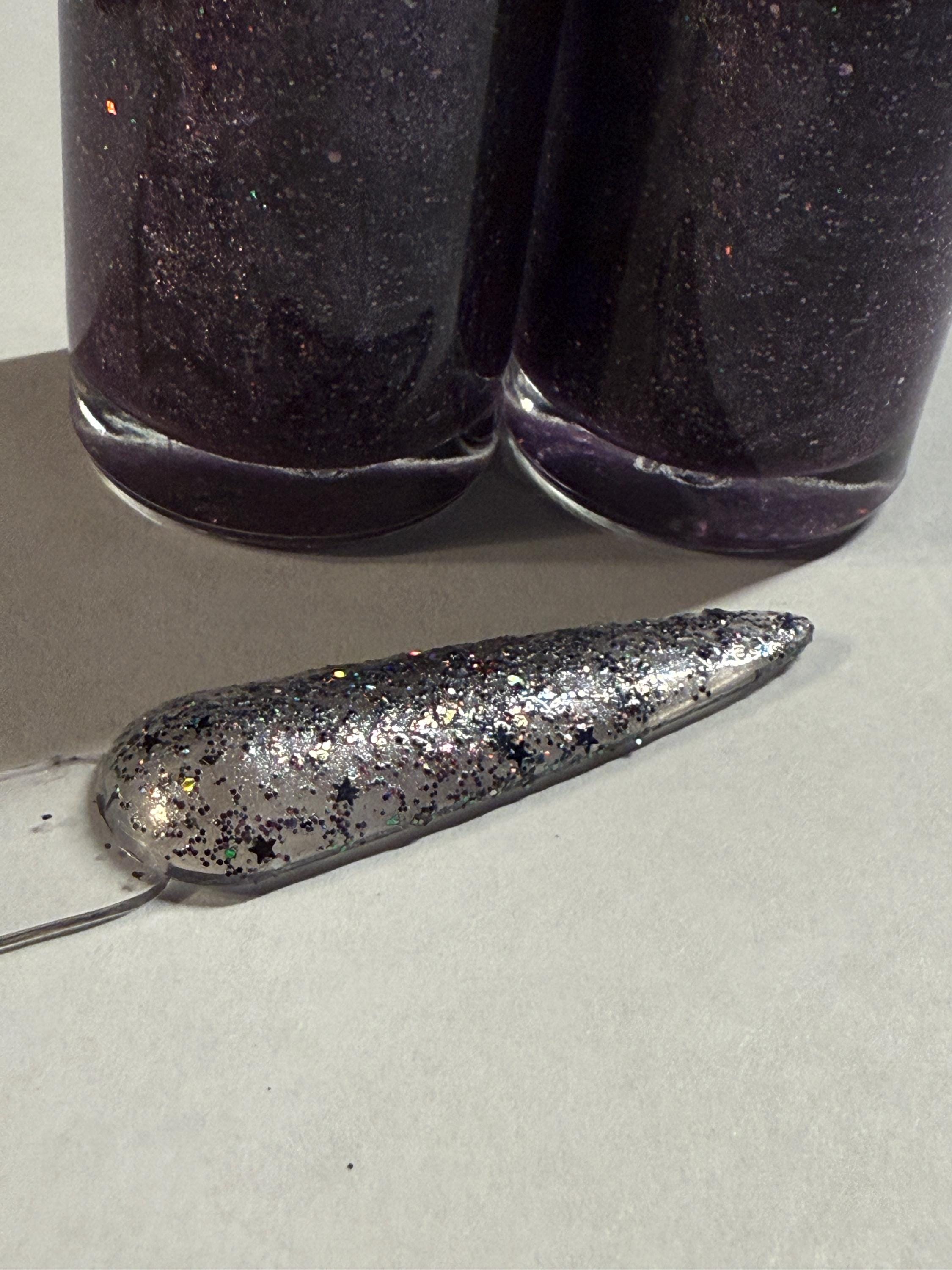 This nail polish comes in either 5 or 15ml bottles and has holographic and iridescent glitter with 1mm black holo stars in it on a light purple base..