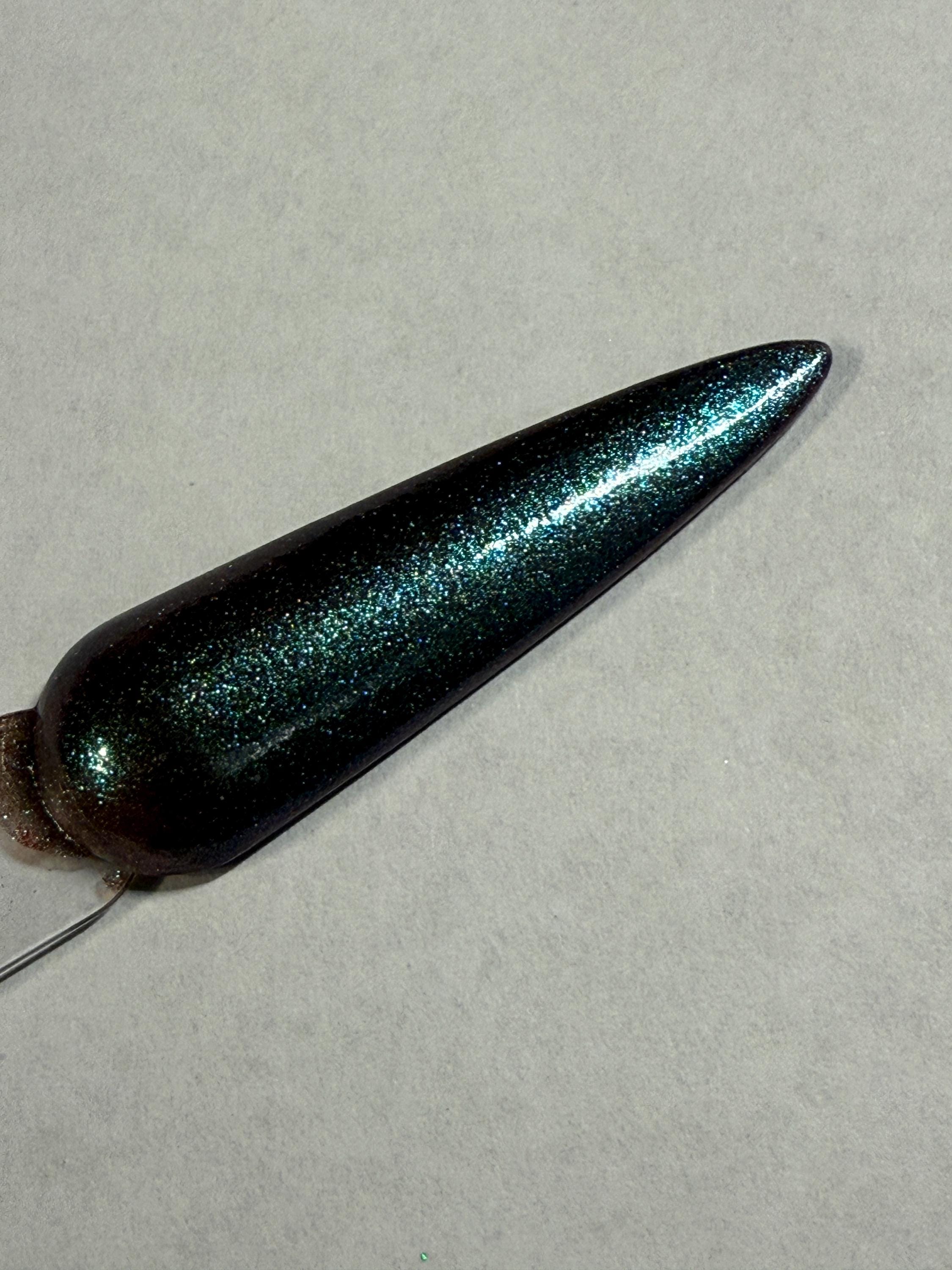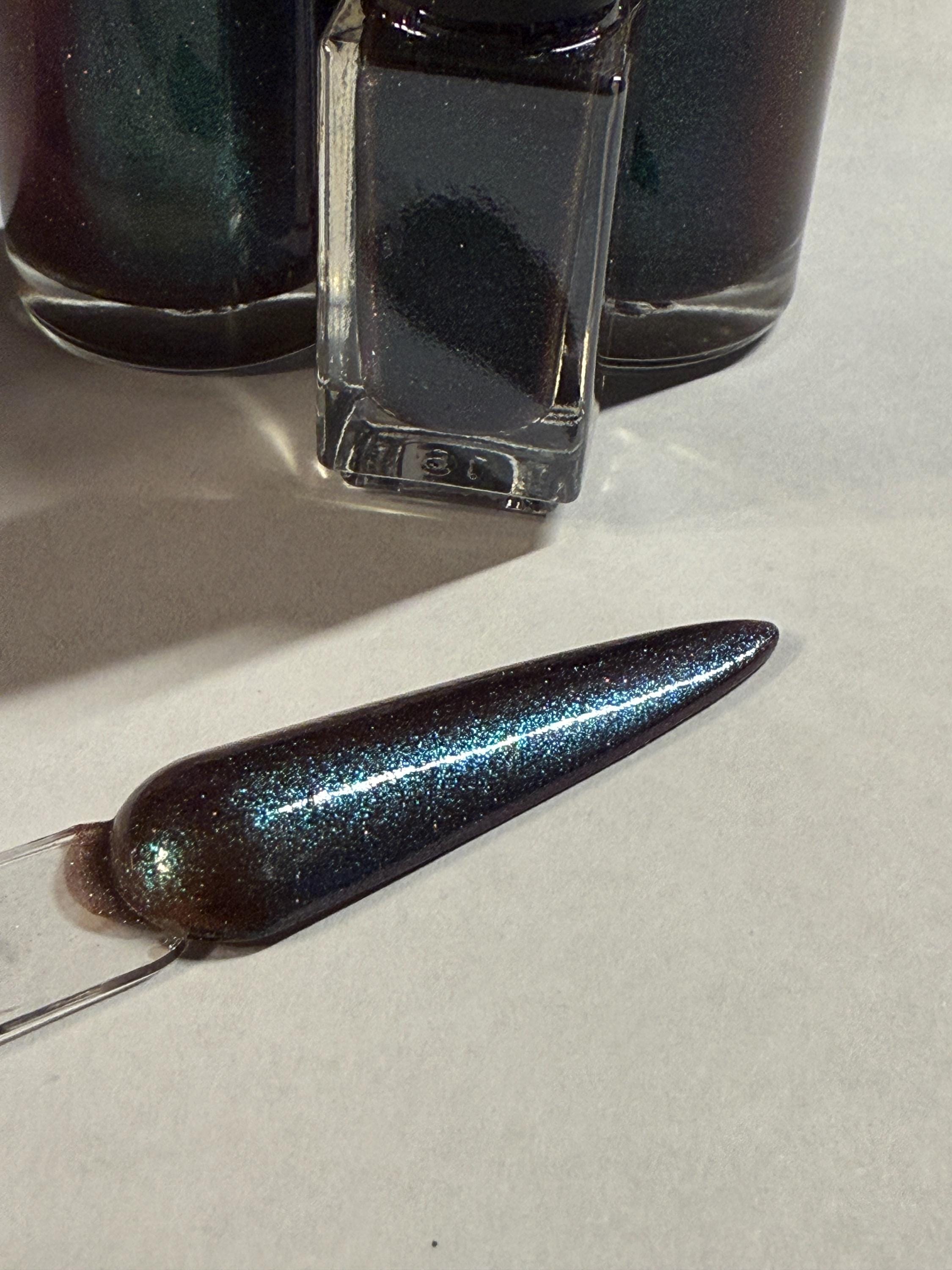 This nail polish comes in either 5 or 15ml bottles and its a blackened peach duochrome. This polish is technically magnetic but its very weak