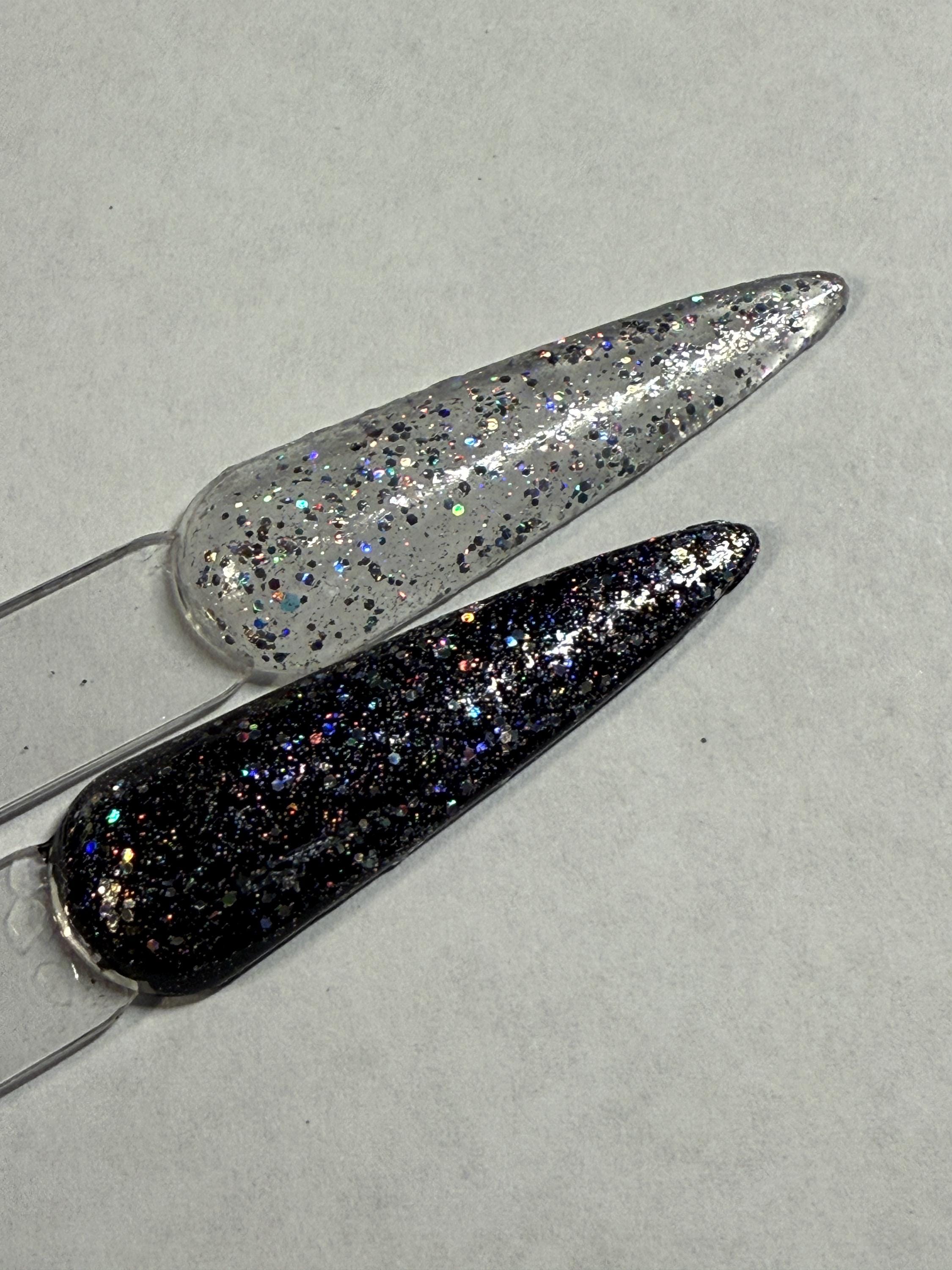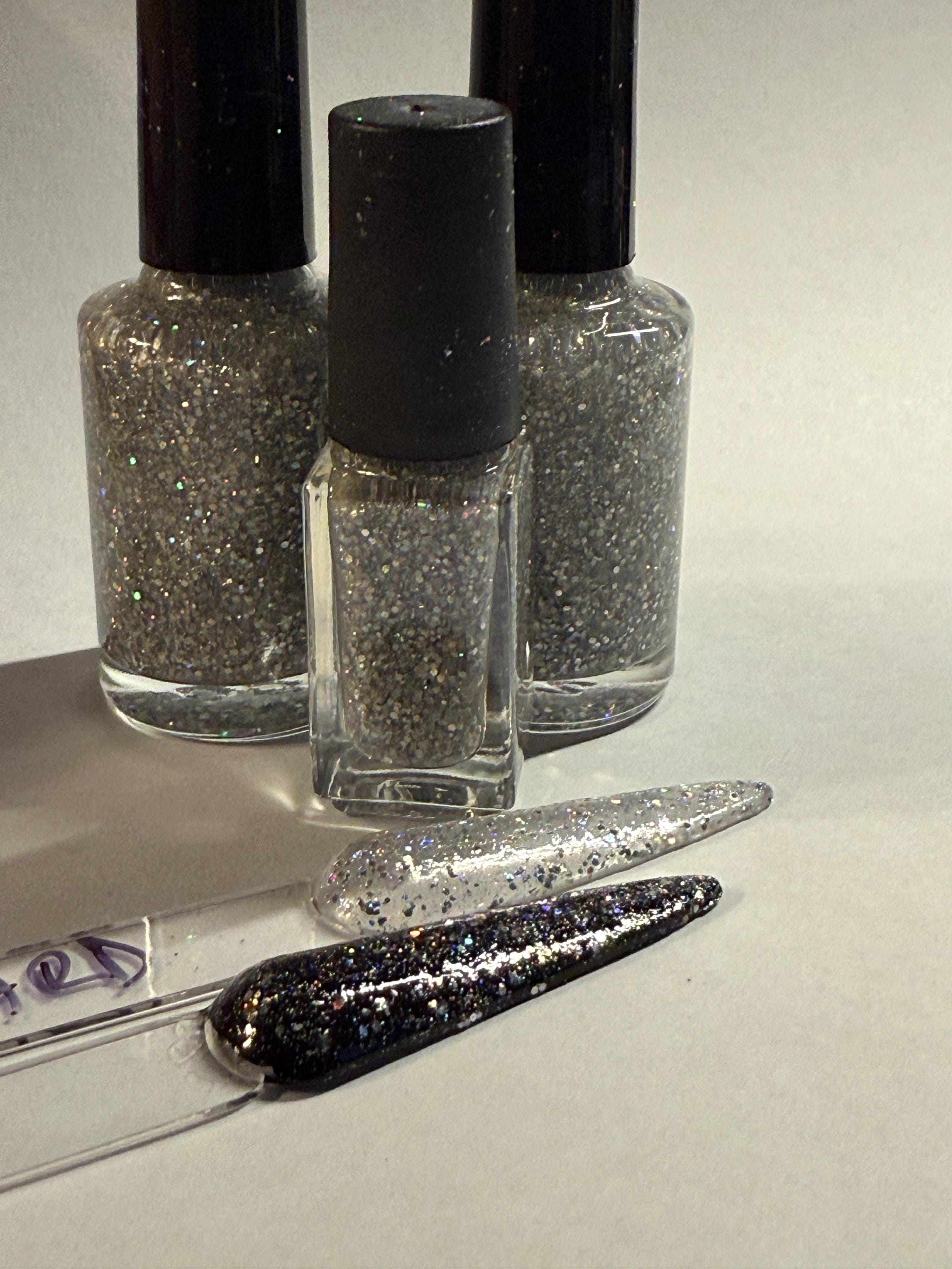 This nail polish comes in either 5 or 15ml bottles and has 3 sizes of silver holographic glitter in it. The swatches are two coats over clear and one coat over black.
