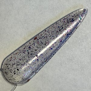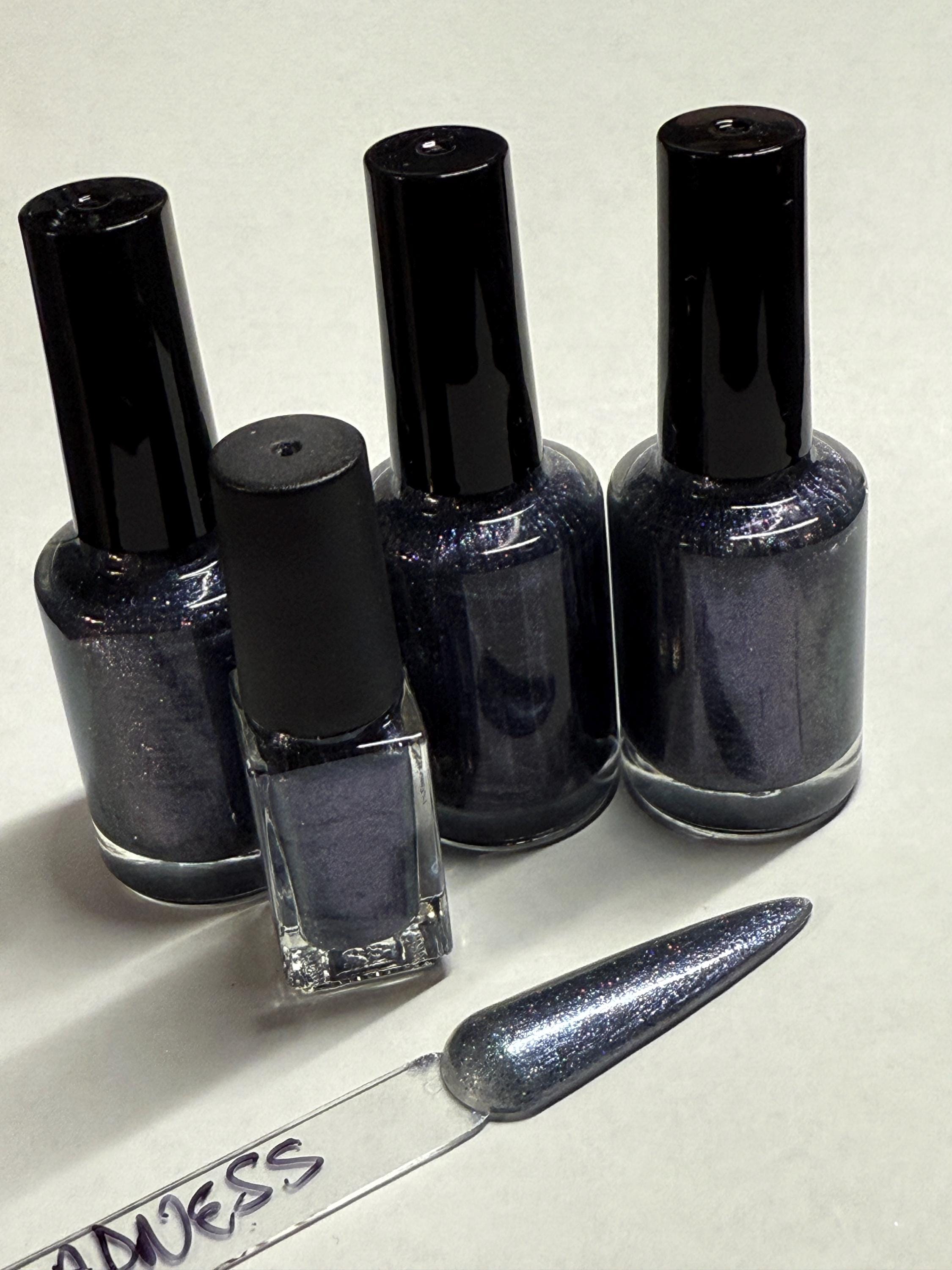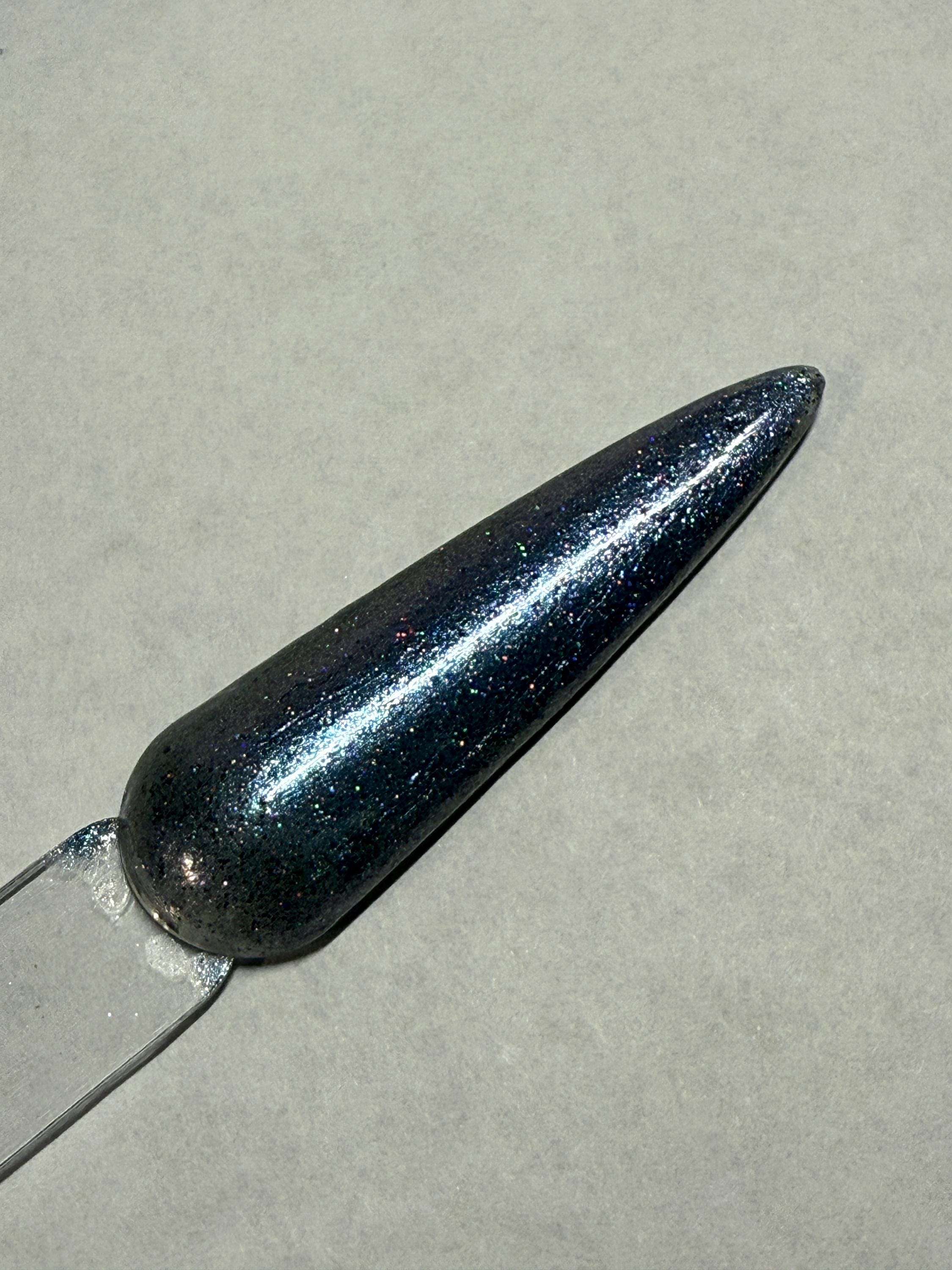 This nail polish comes in either 5 or 15ml bottles and its a denim blue with a purple and silver shift with fine holographic glitter.