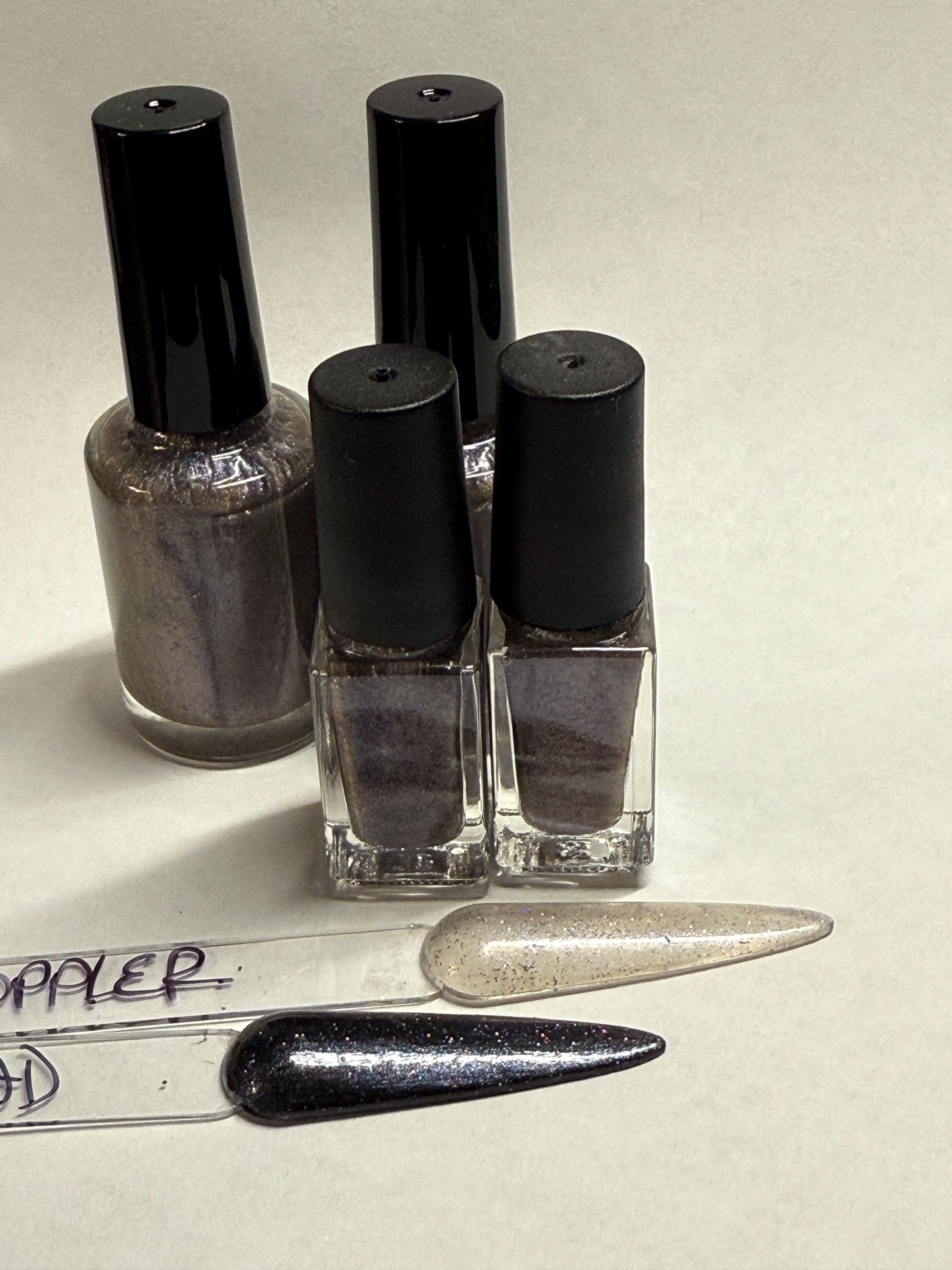 The photos/videos is one coat of Doppler over a black base and magnetized using the bead method, and the other is two coats of Doppler velvetized.