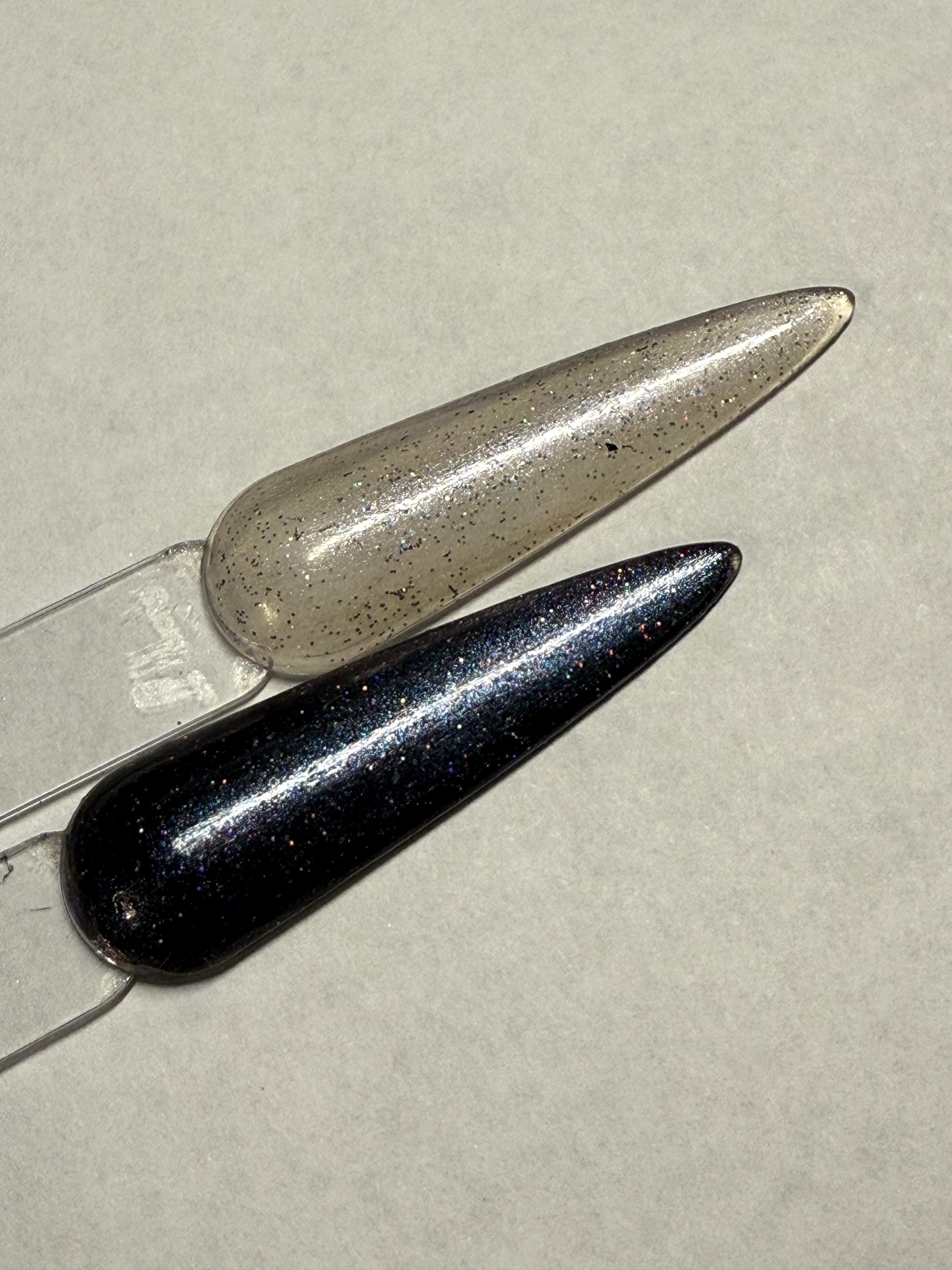 This nail polish comes in either 5 or 15ml bottles and is a grayish silver magnetic with a fine silver holographic base. You will need a magnet to take advantage of the magnetic properties within. It does not come with a magnet but if you'd like me to include one for $1, please check my other listings.
