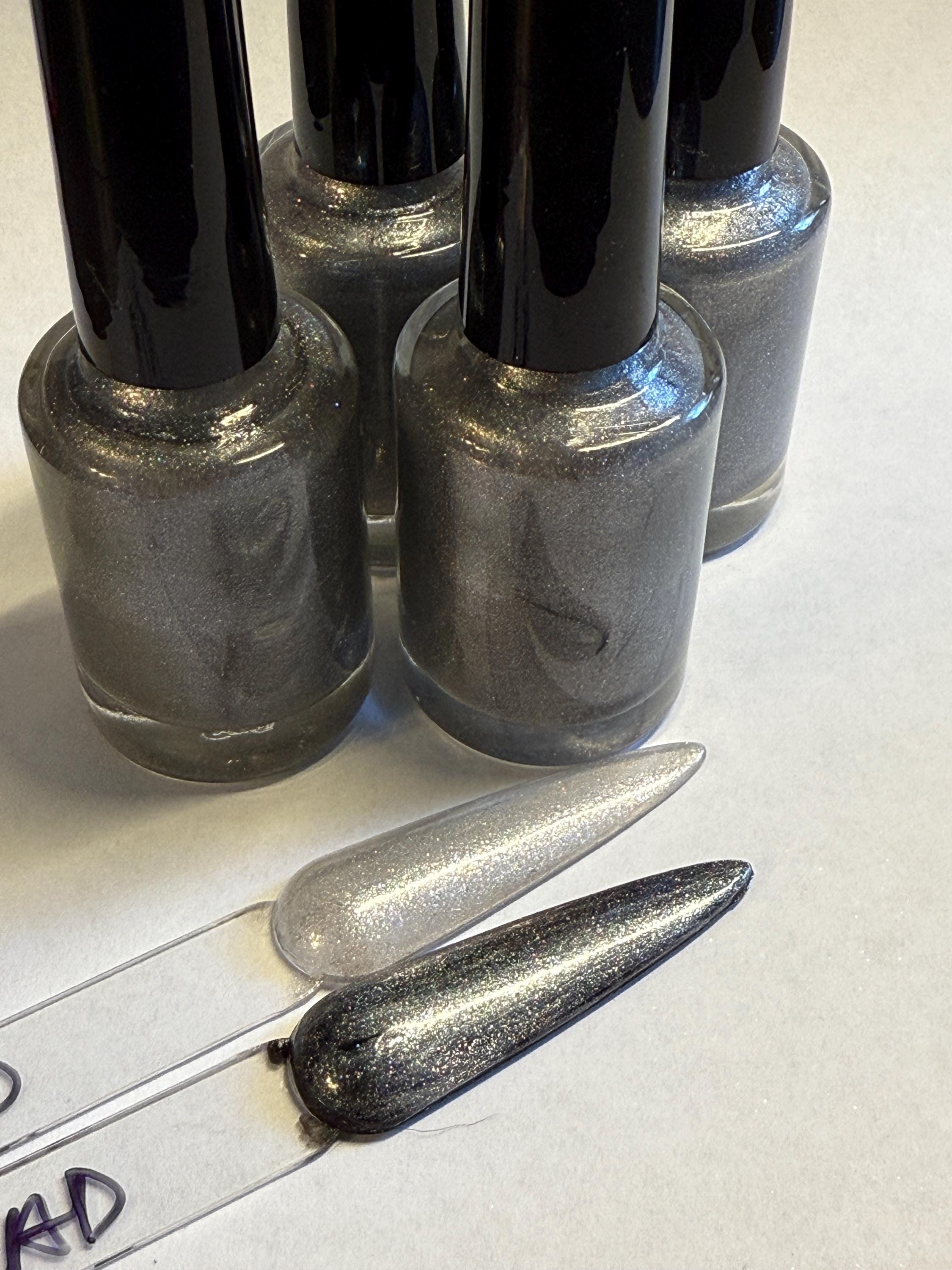This nail polish comes in either 5 or 15ml bottles and is a silver holographic magnetic with a pink/gray shift. You will need a magnet to take advantage of the magnetic properties within. It does not come with a magnet but if you'd like me to include one for $1, please check my other listings.
