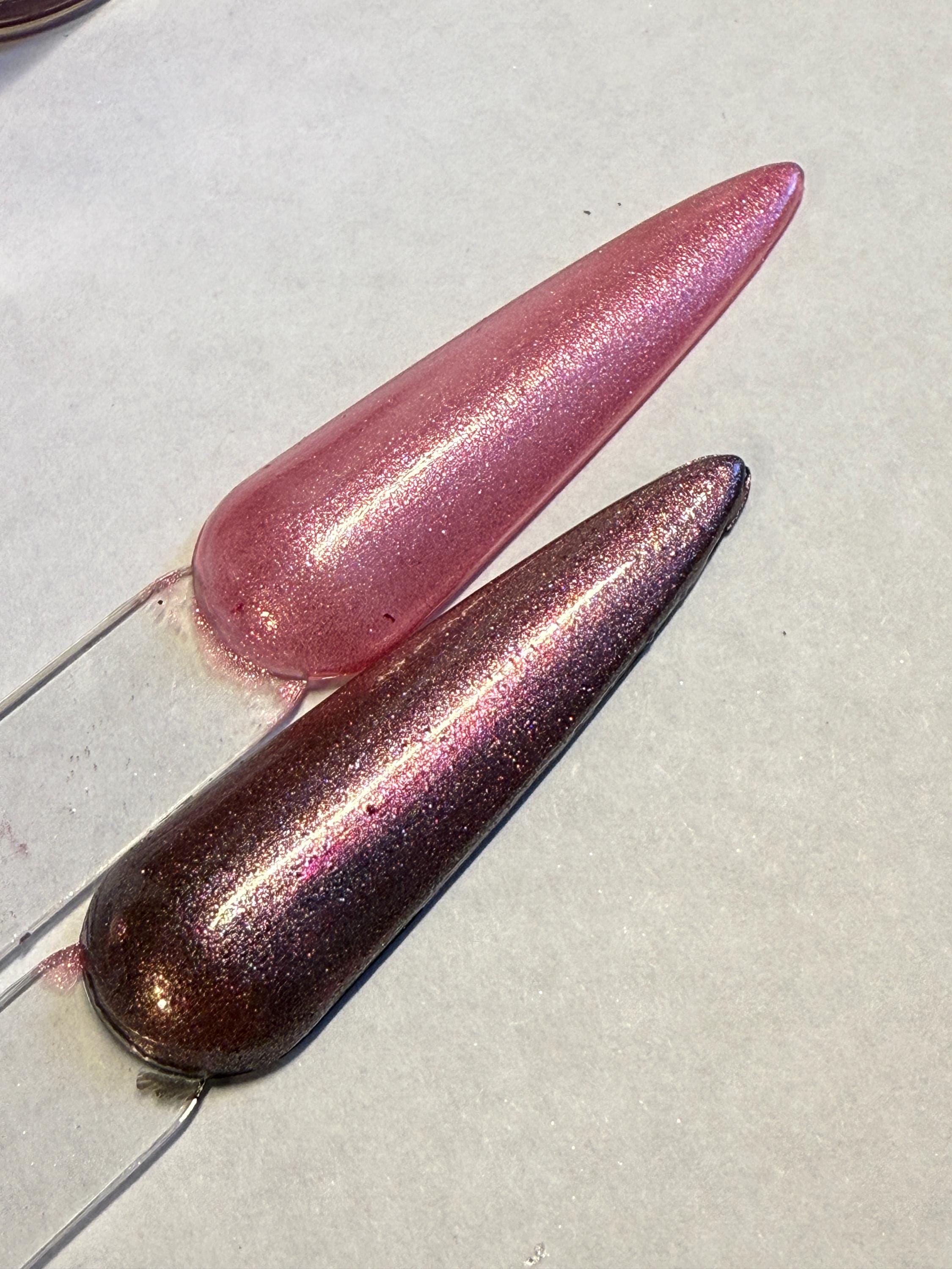This nail polish comes in either 5 or 15ml bottles and is a pink duochrome magnetic with a touch of very fine holo. You will need a magnet to take advantage of the magnetic properties within. It does not come with a magnet but if you'd like me to include one for $1, please check my other listings.