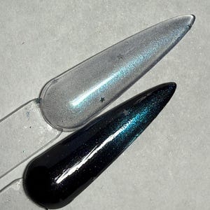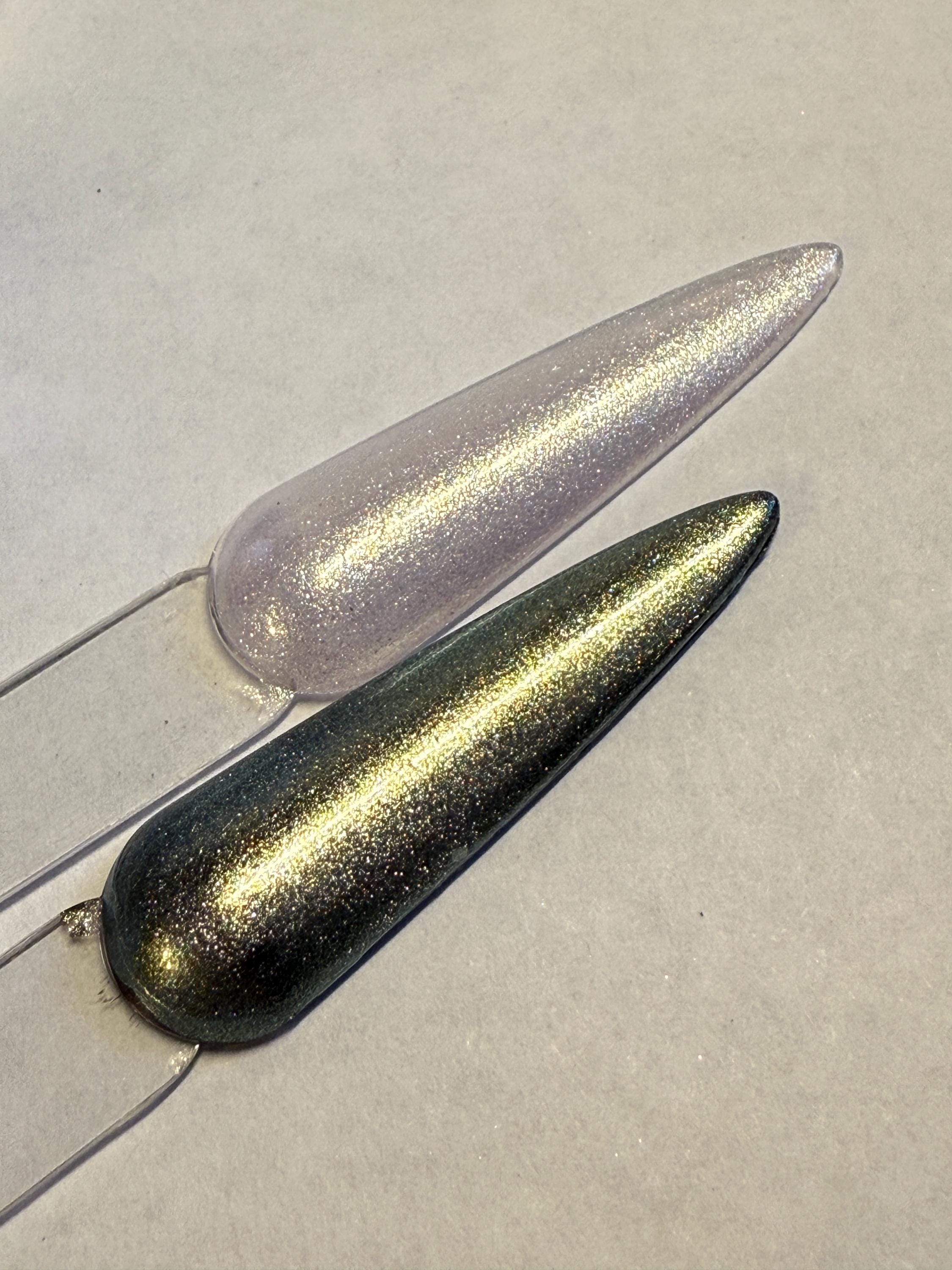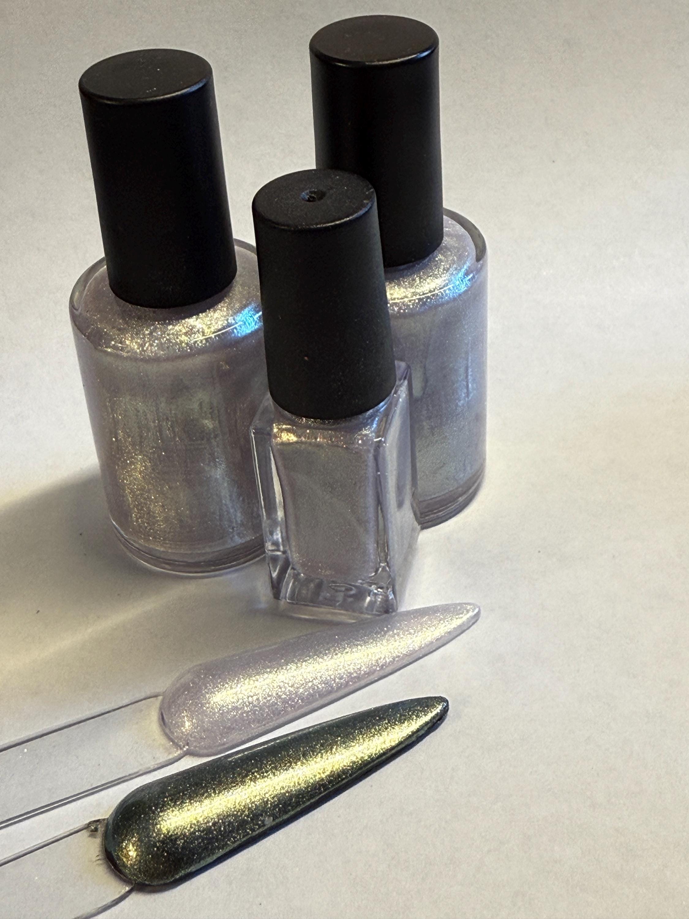 This nail polish comes in either 5 or 15ml bottles and is a white/green duochrome magnetic. You will need a magnet to take advantage of the magnetic properties within. It does not come with a magnet but if you'd like me to include one for $1, please check my other listings.