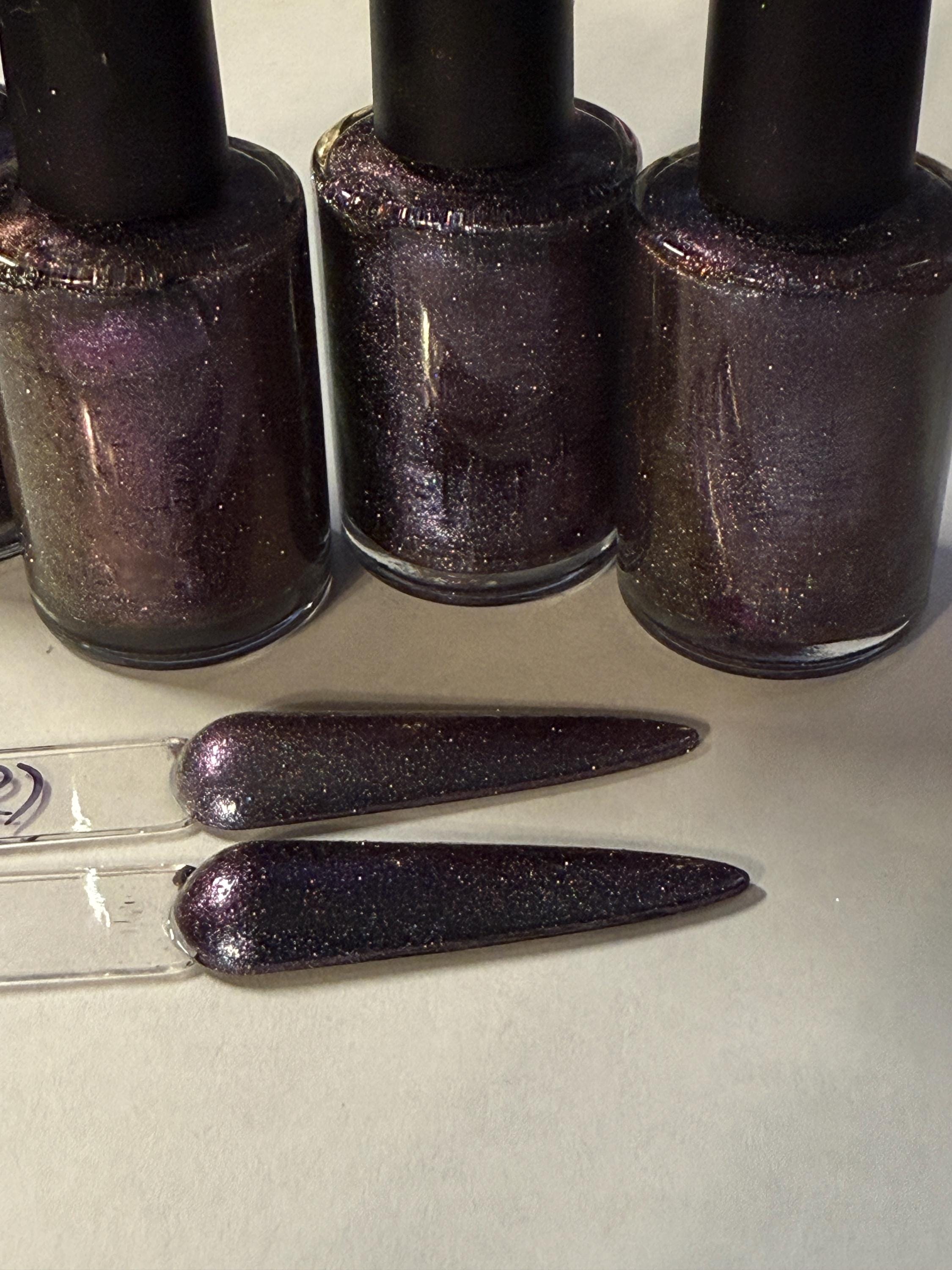 This nail polish comes in either 5 or 15ml bottles and is a Purple/silver magnetic duochrome with a silver holographic base and reflective glitter. You will need a magnet to take advantage of the magnetic properties within. It does not come with a magnet but if you'd like me to include one for $1, please check my other listings.