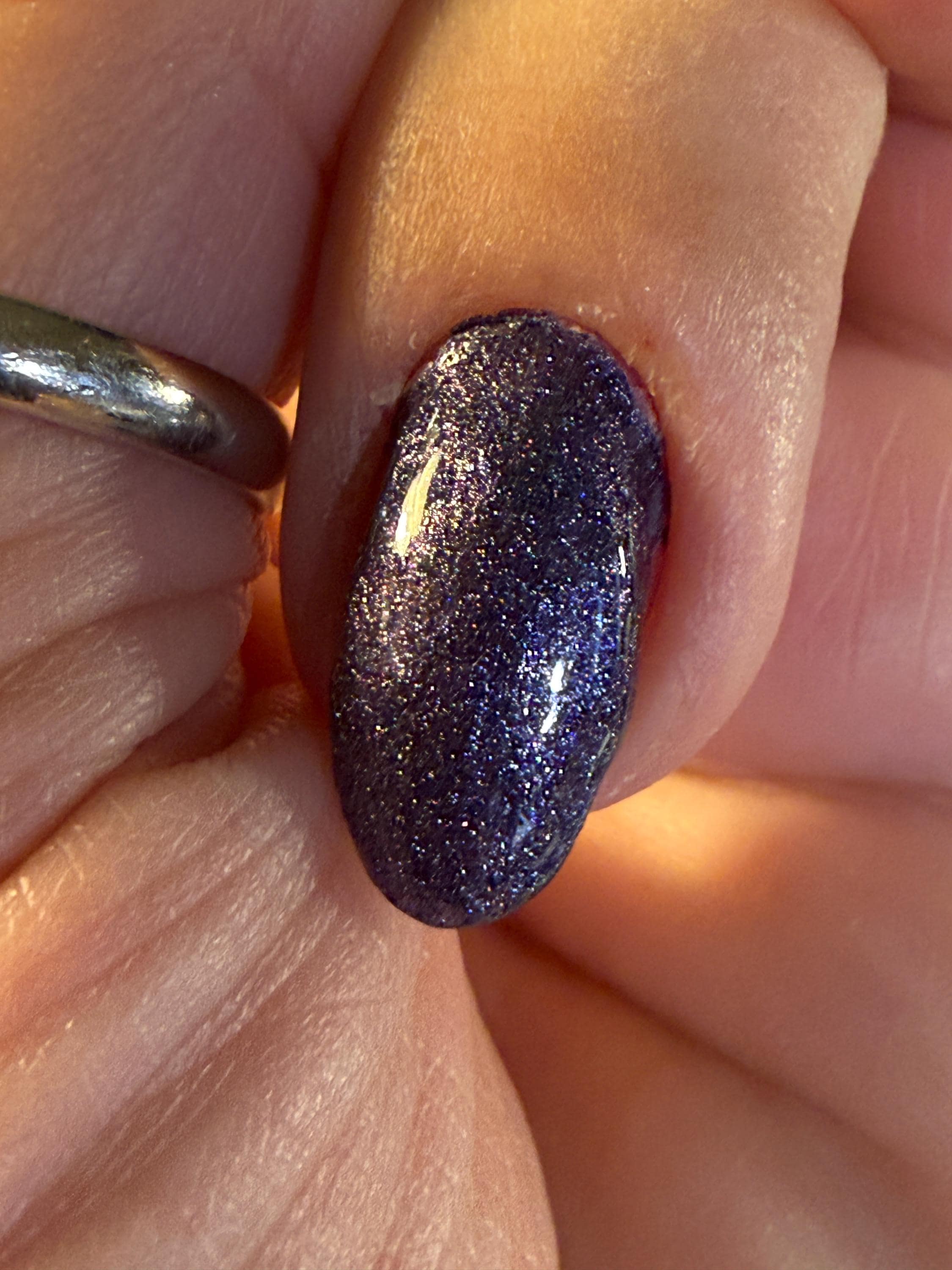 This nail polish comes in either 5 or 15ml bottles and is a blue/silver duochrome with reflective silver glitter.