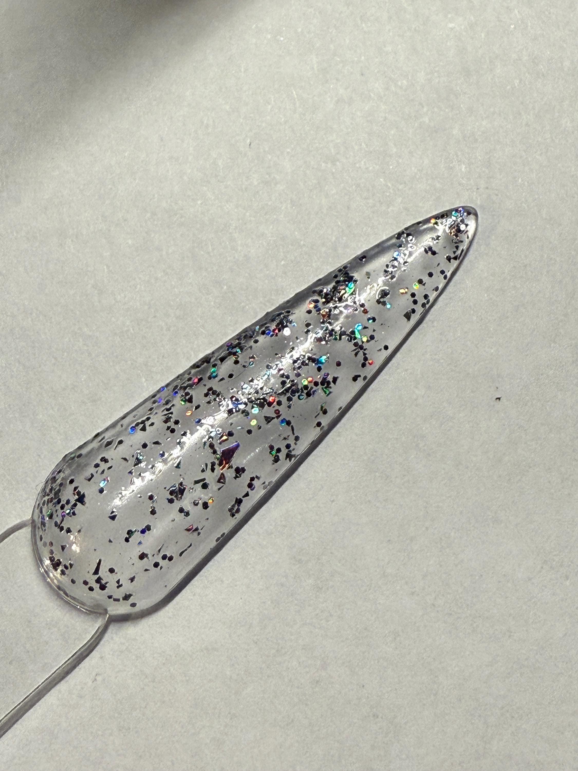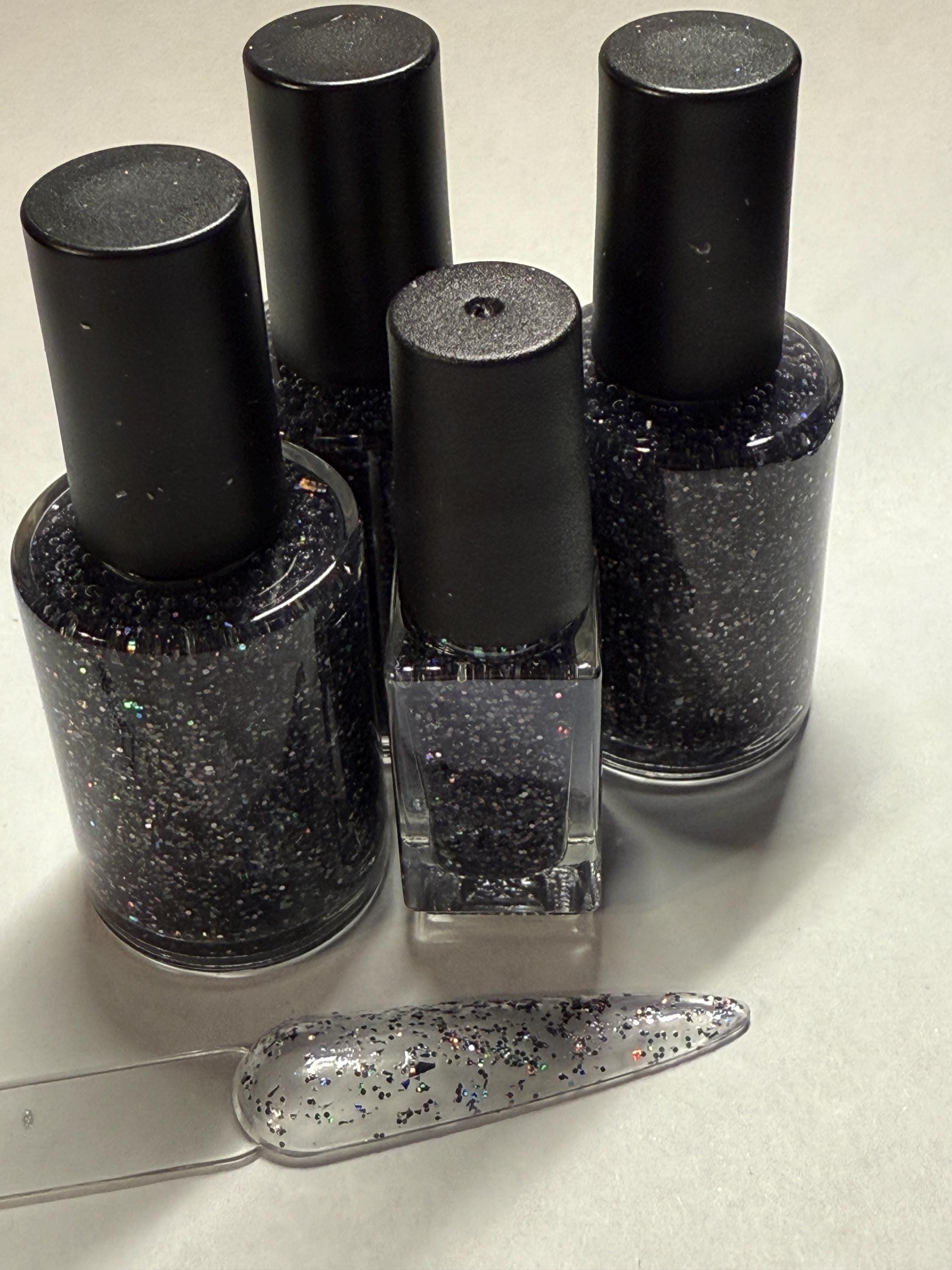This nail polish comes in either 5 or 15ml bottles and has black holographic glitter and grey holographic flakes in a sheer black base.