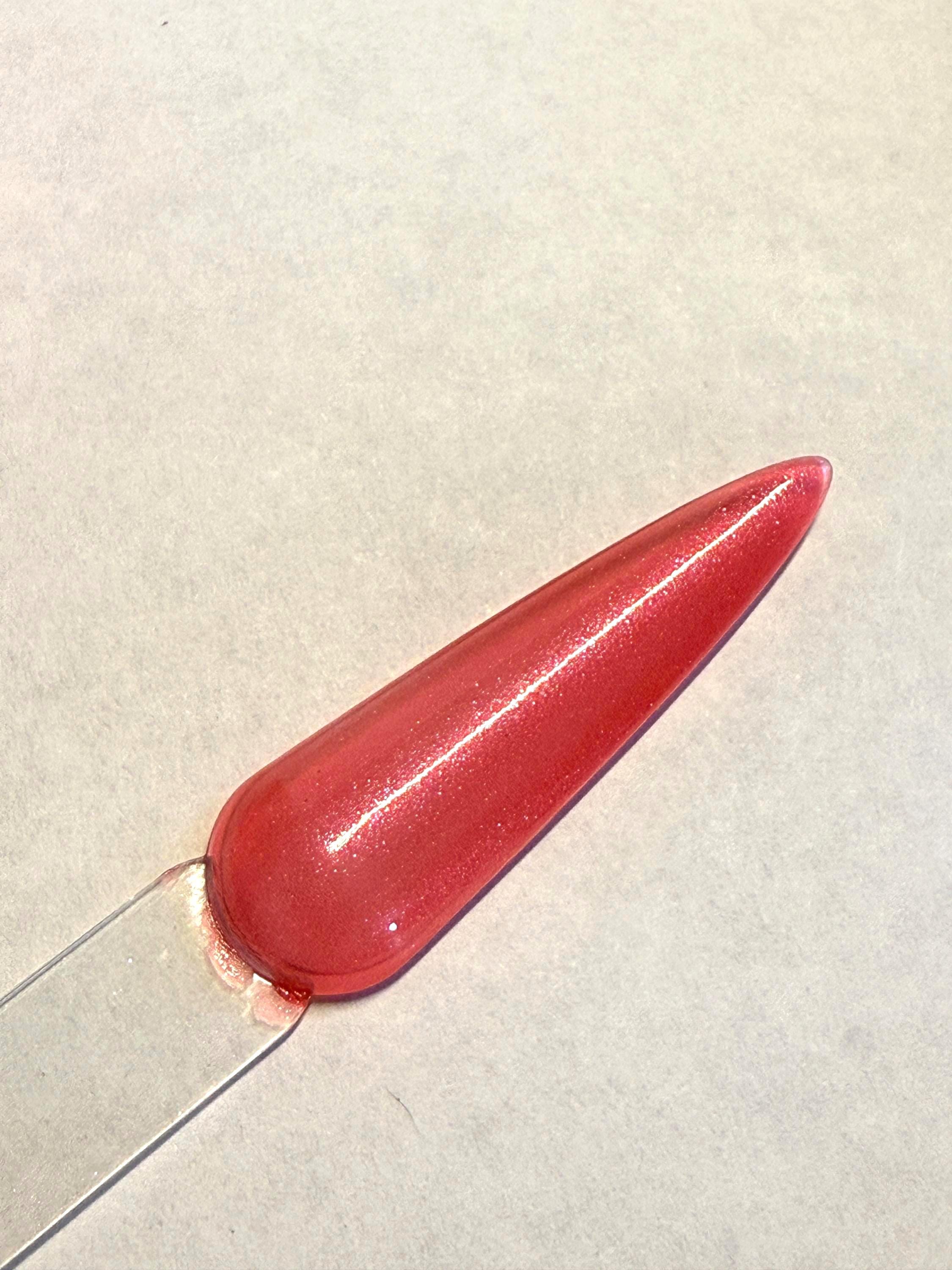 This nail polish comes in either 5 or 15ml bottles and is a red with a light shimmer and pink flash.