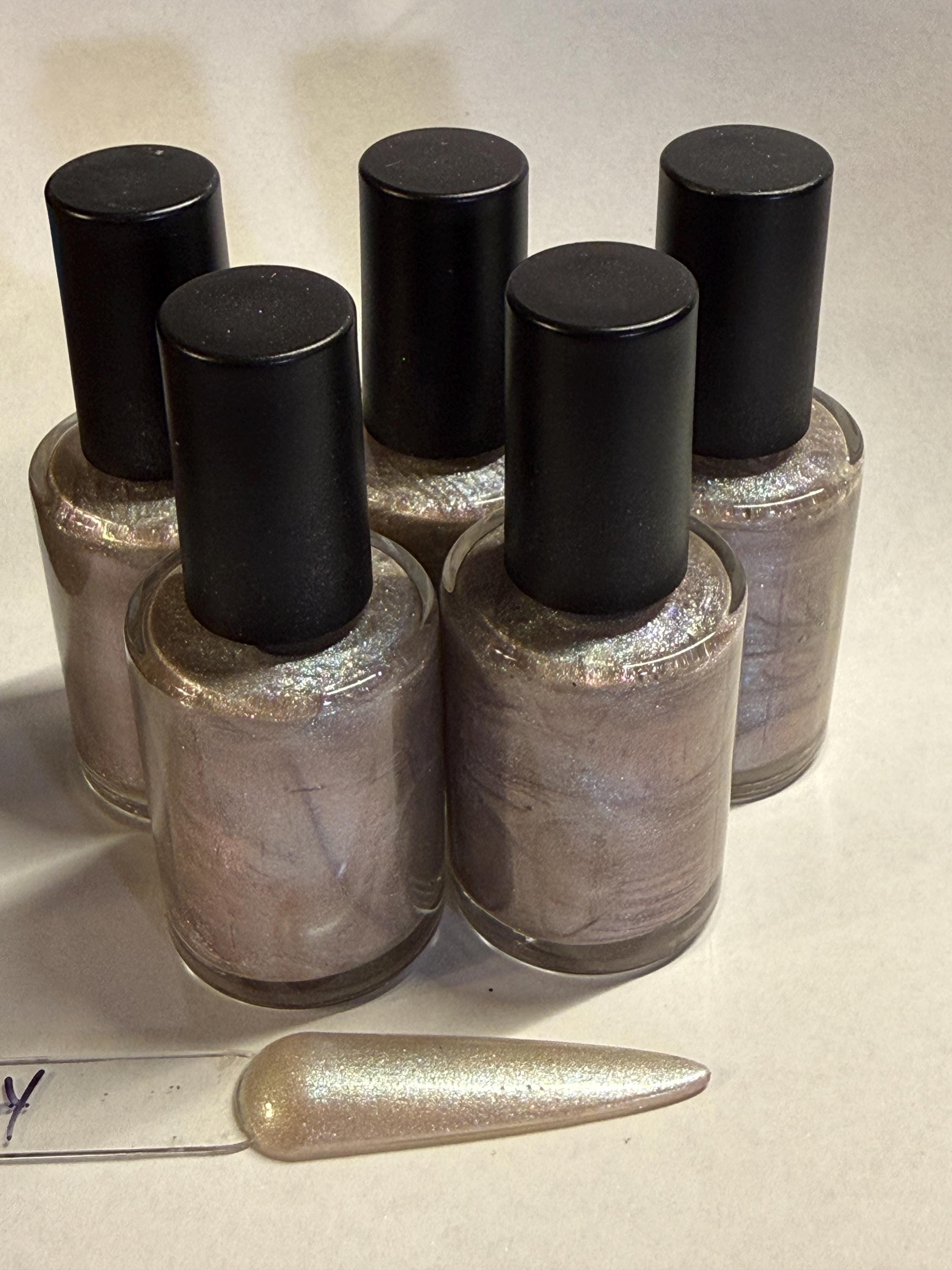 This nail polish comes in either 5 or 15ml bottles and is a beige duochrome with a lime green flash.