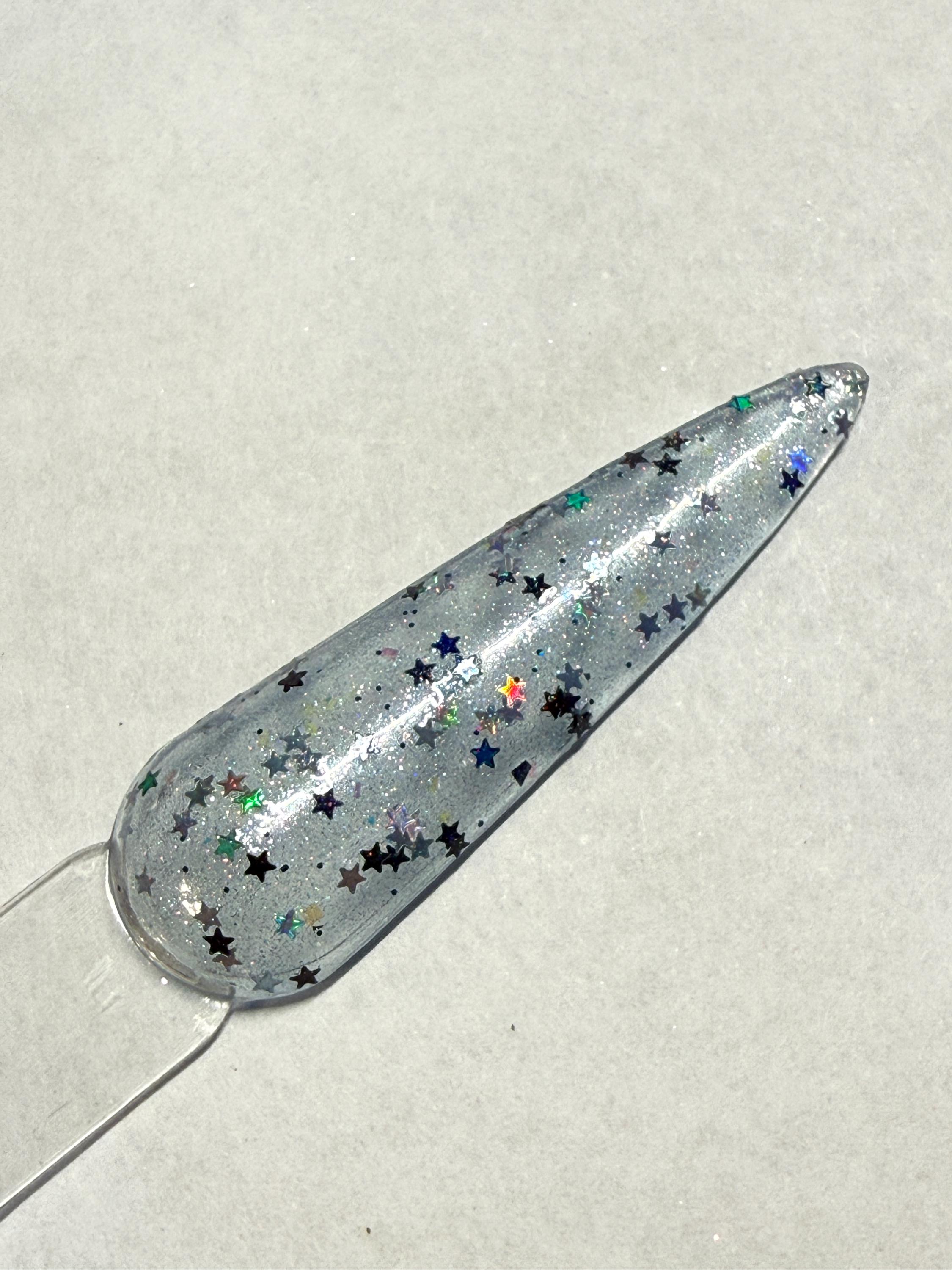 This nail polish comes in either 5 or 15ml bottles and has black and silver holographic stars in a blue holographic base.