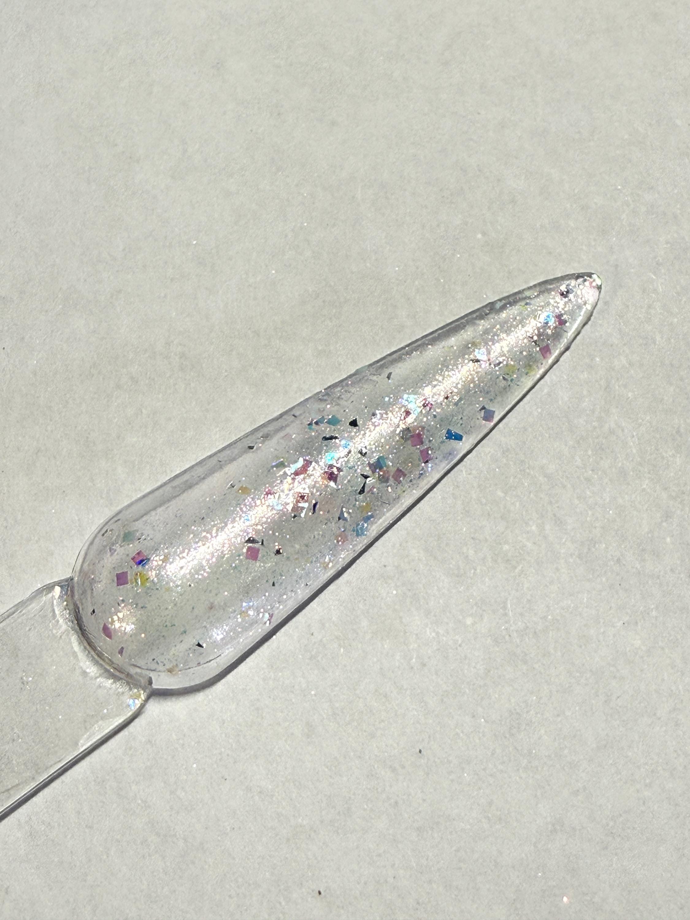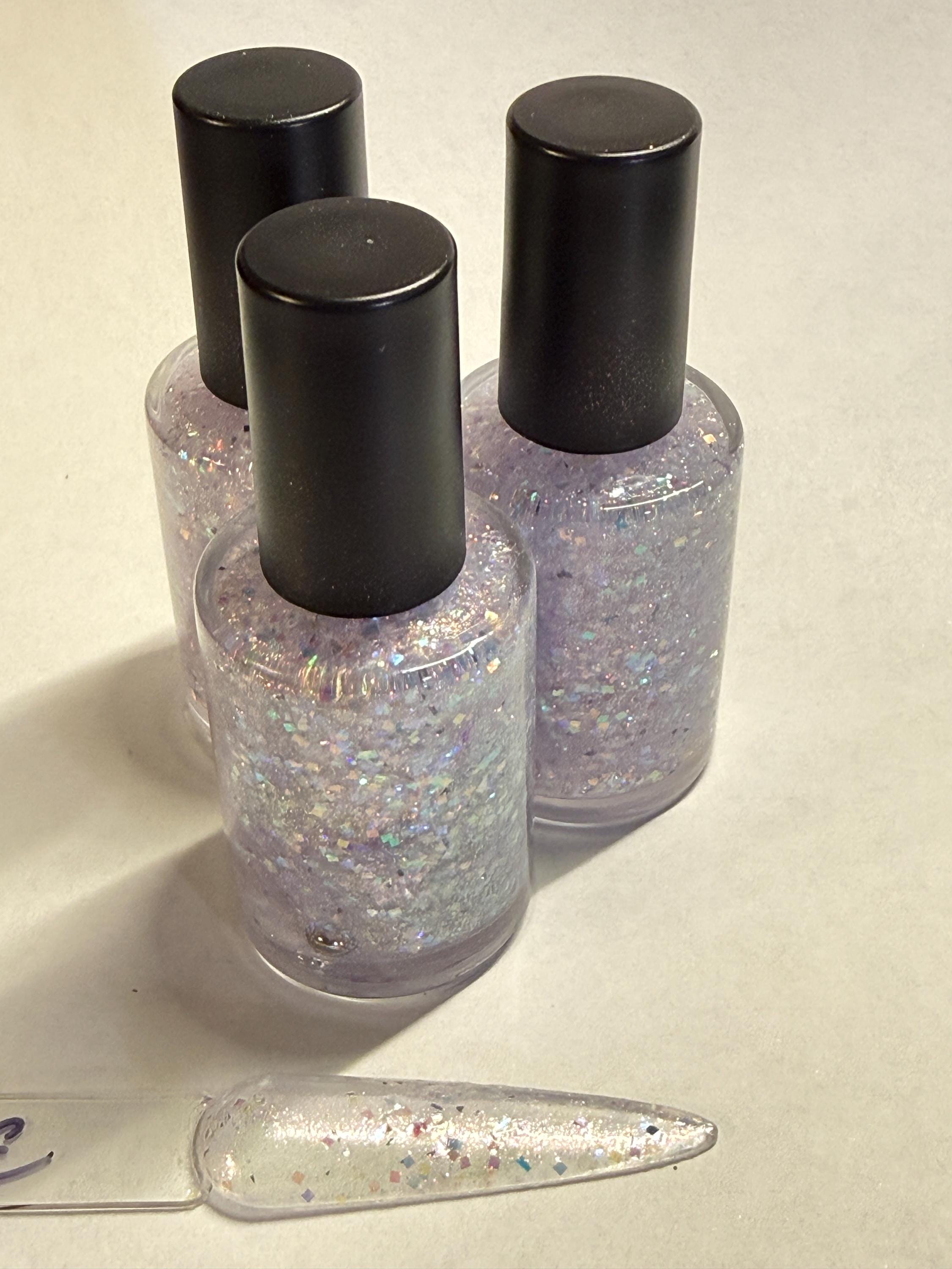 This nail polish comes in either 5 or 15ml bottles and has white iridescent flakes in a green/yellow/pink chameleon base.