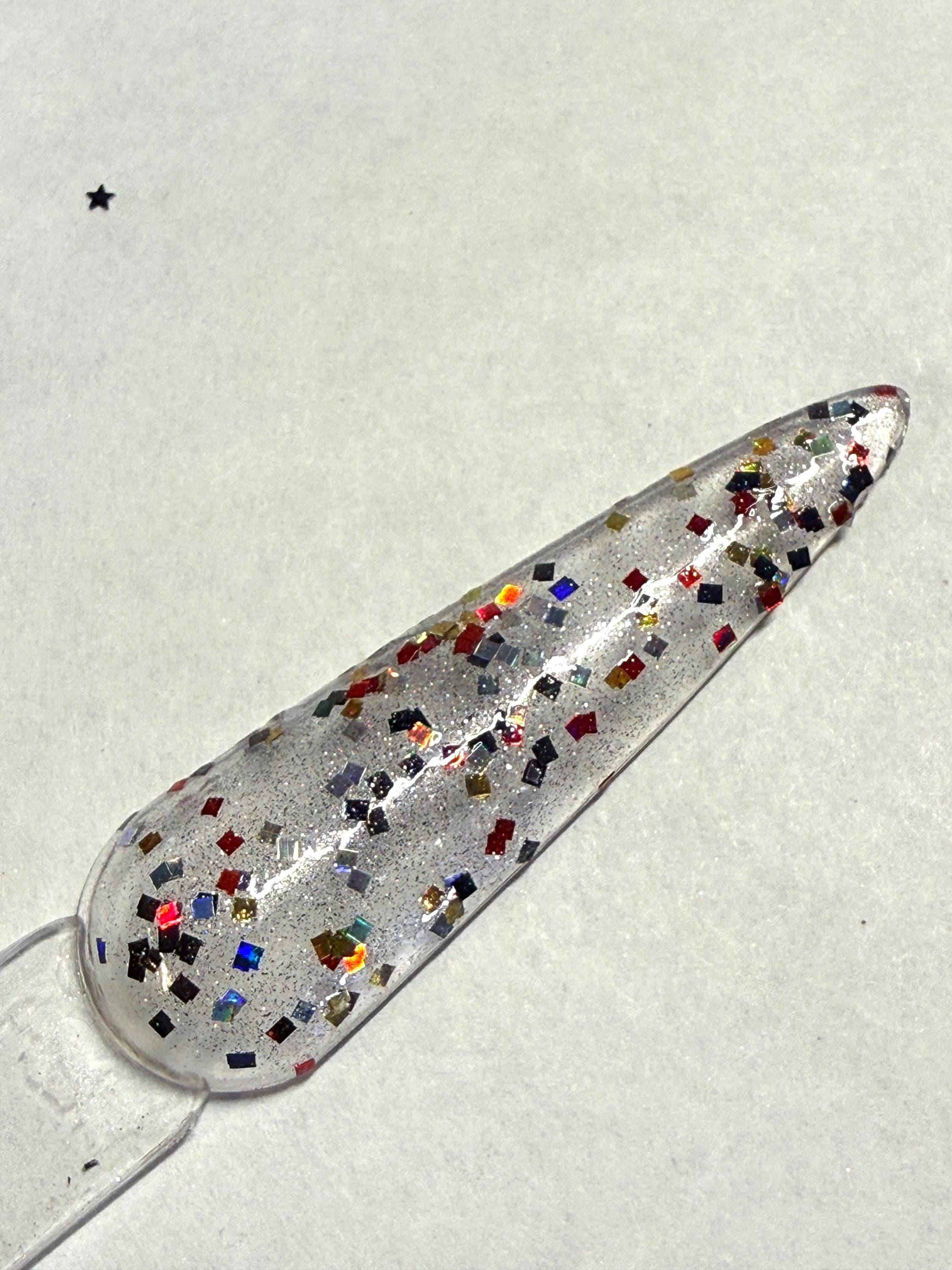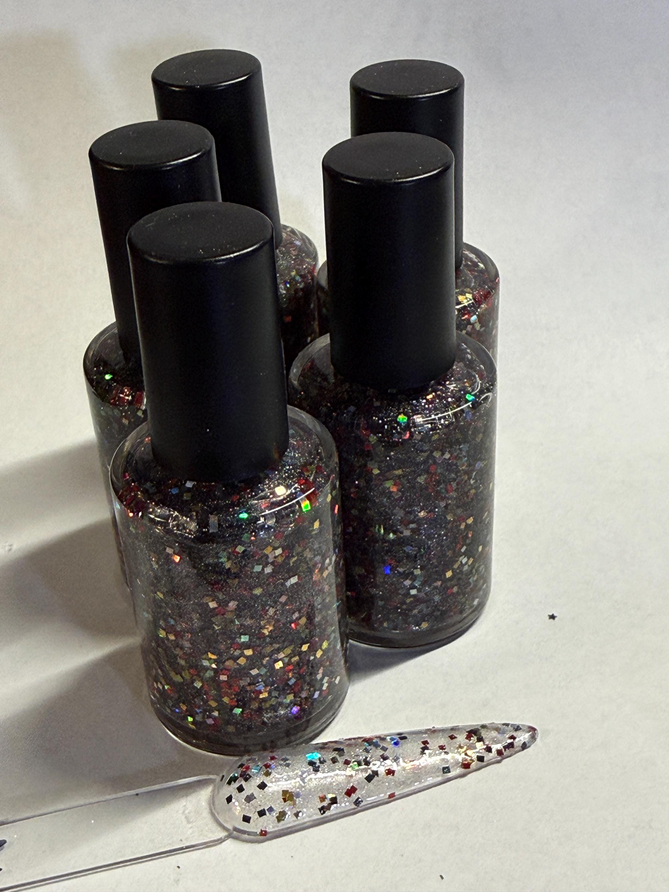 This nail polish comes in either 5 or 15ml bottles and has red, black, gold, and silver holographic squares in a holographic shimmery base.