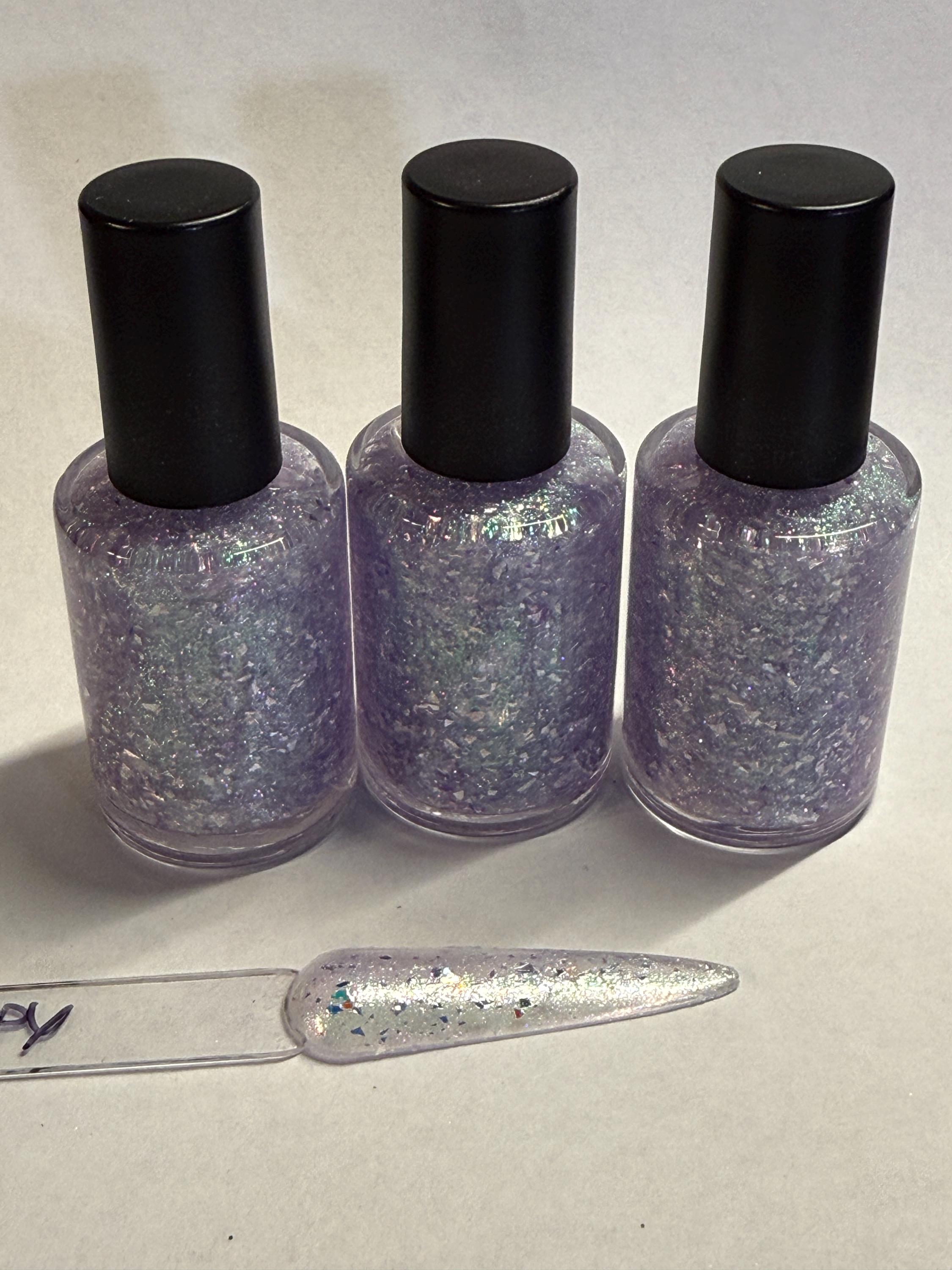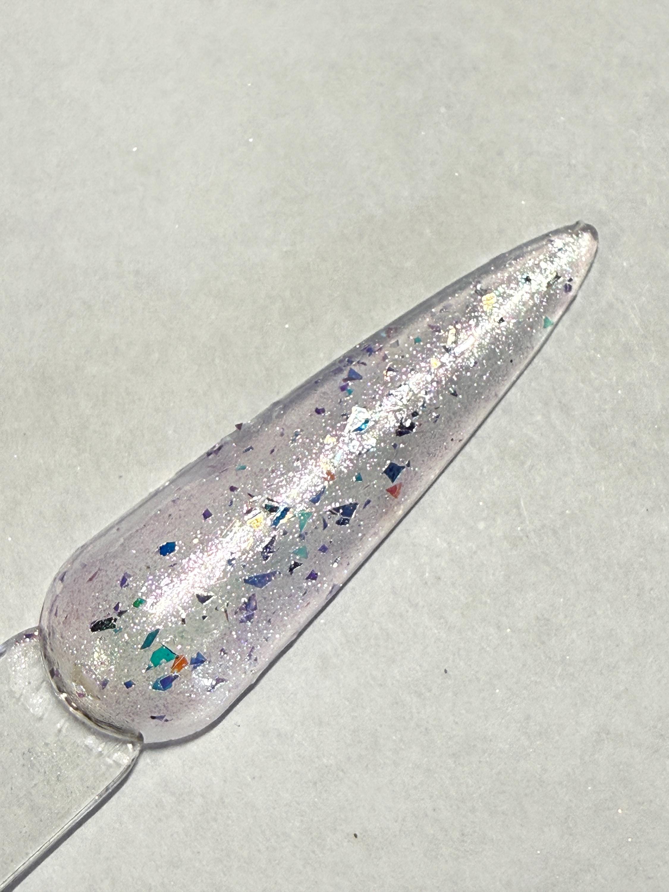 This nail polish comes in either 5 or 15ml bottles and has white iridescent flakes in a green/purple/pink chameleon base.