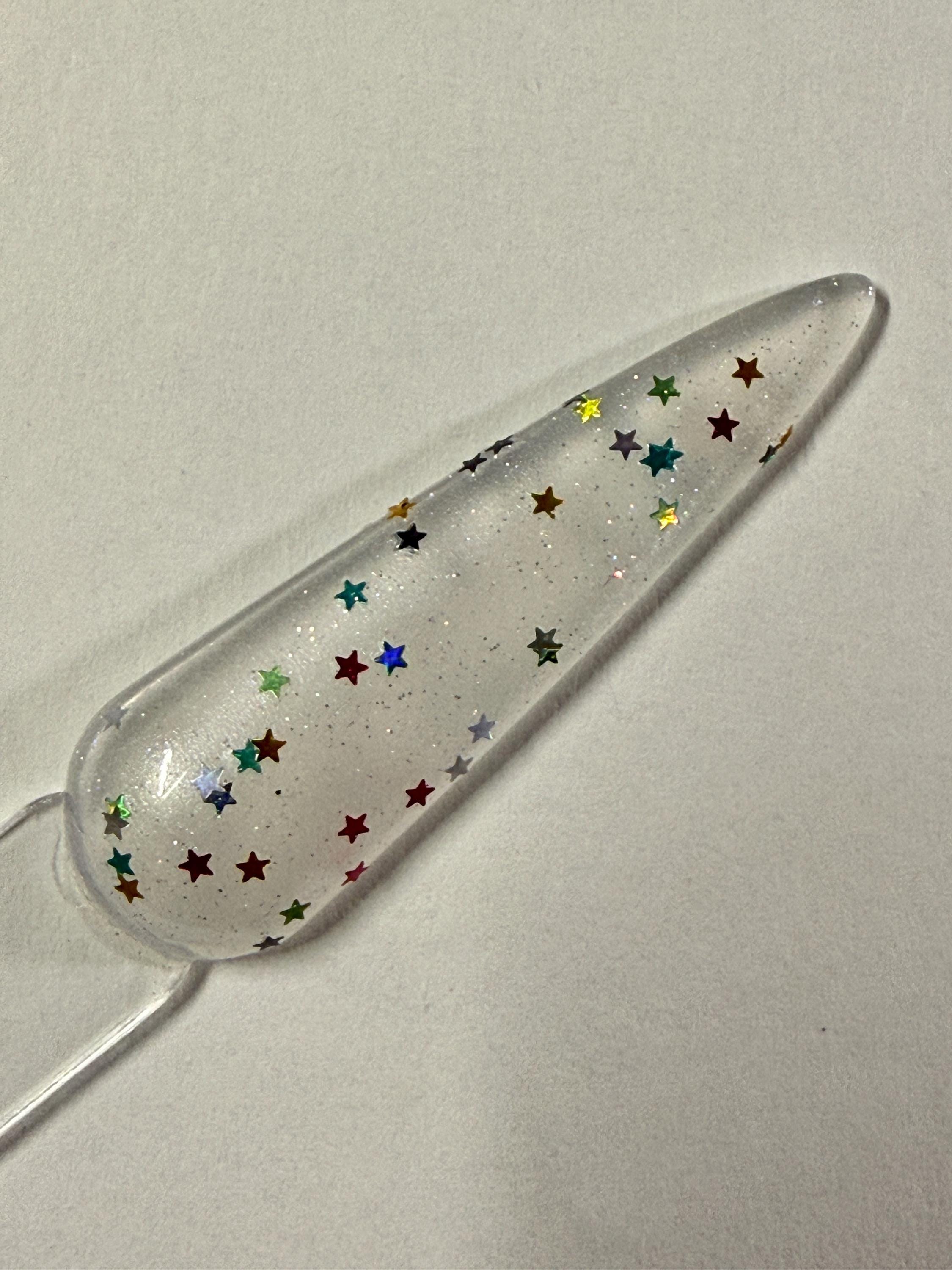 This nail polish comes in either 5 or 15ml bottles and is loaded with a rainbow of holographic 1mm stars with a fine silver holographic shimmer base. 30ml quantity available on request.
