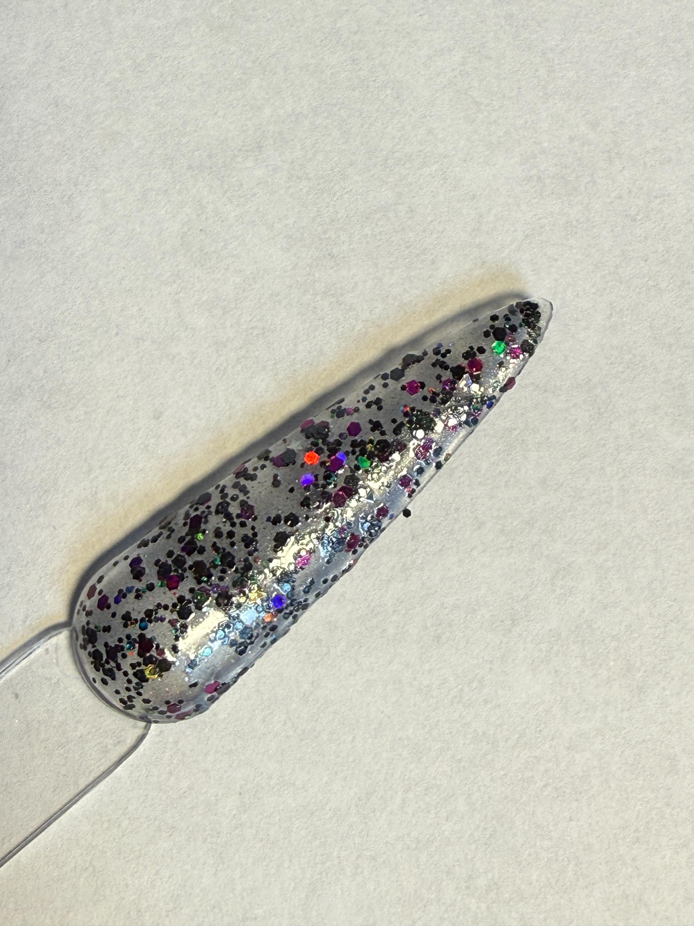 This nail polish comes in either 5 or 15ml bottles and its a black holographic with pink chameleon glitter.