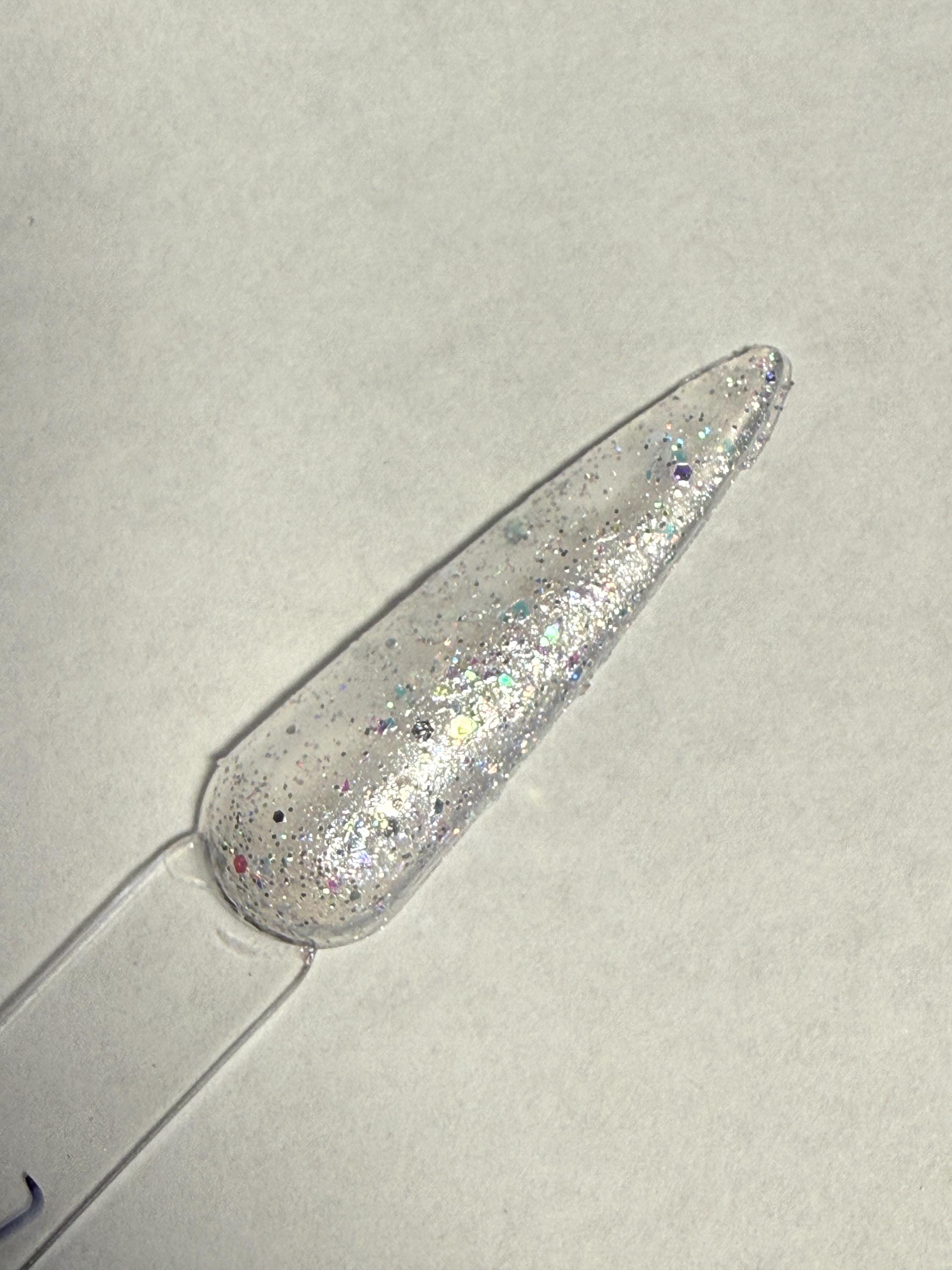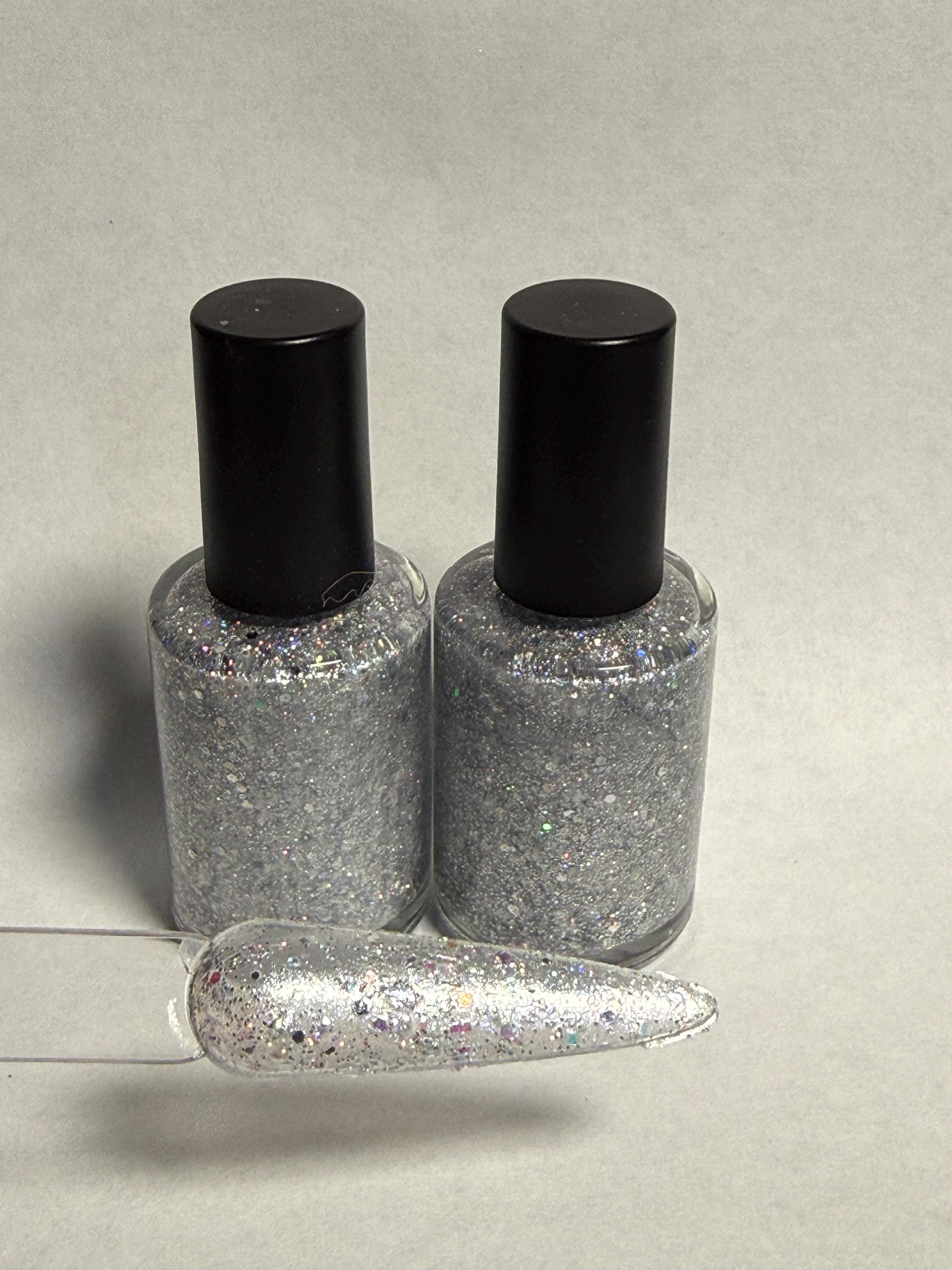 This nail polish comes in either 5 or 15ml bottles and is loaded with holographic flakes and stars with a white shimmery base.