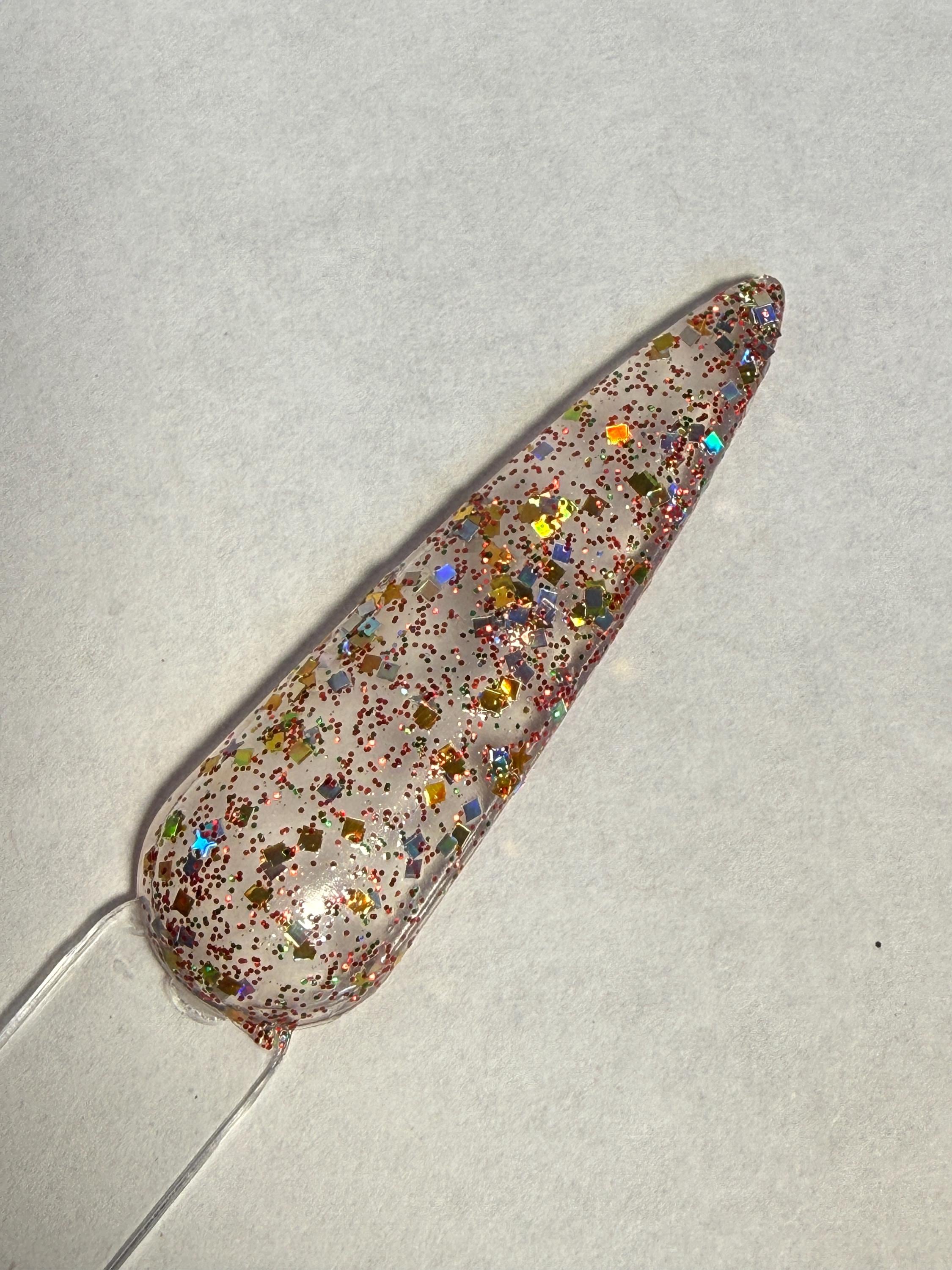 This nail polish comes in either 5 or 15ml bottles and has Christmas red fine holographic glitter with gold holographic squares and the occasional silver and gold holographic star.