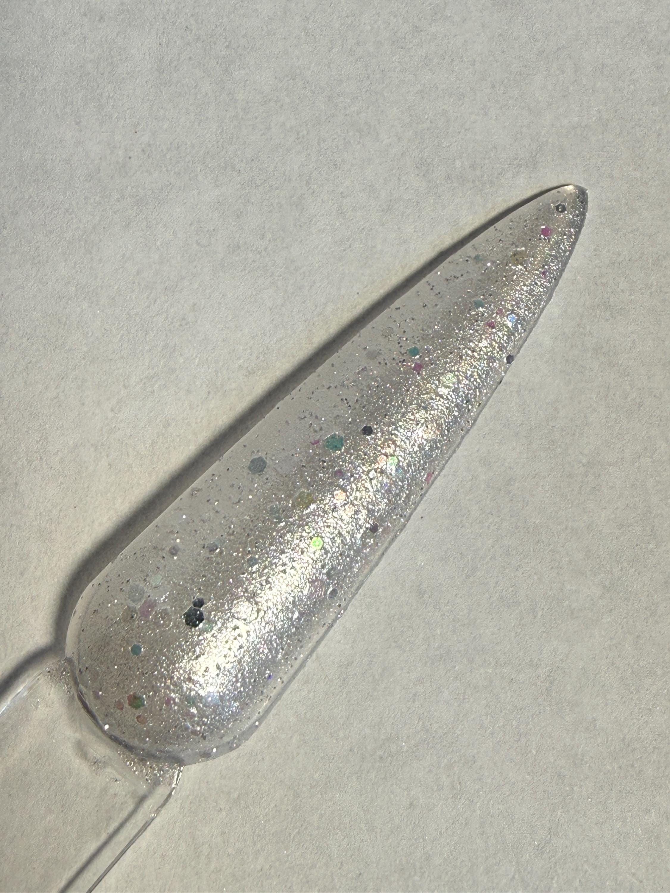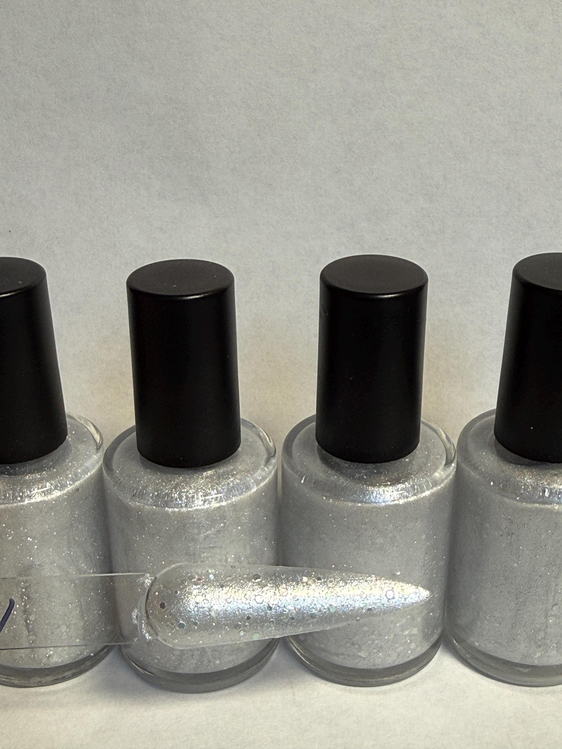 This nail polish comes in either 5 or 15ml bottles and has a white shimmer base and iridescent glitter.