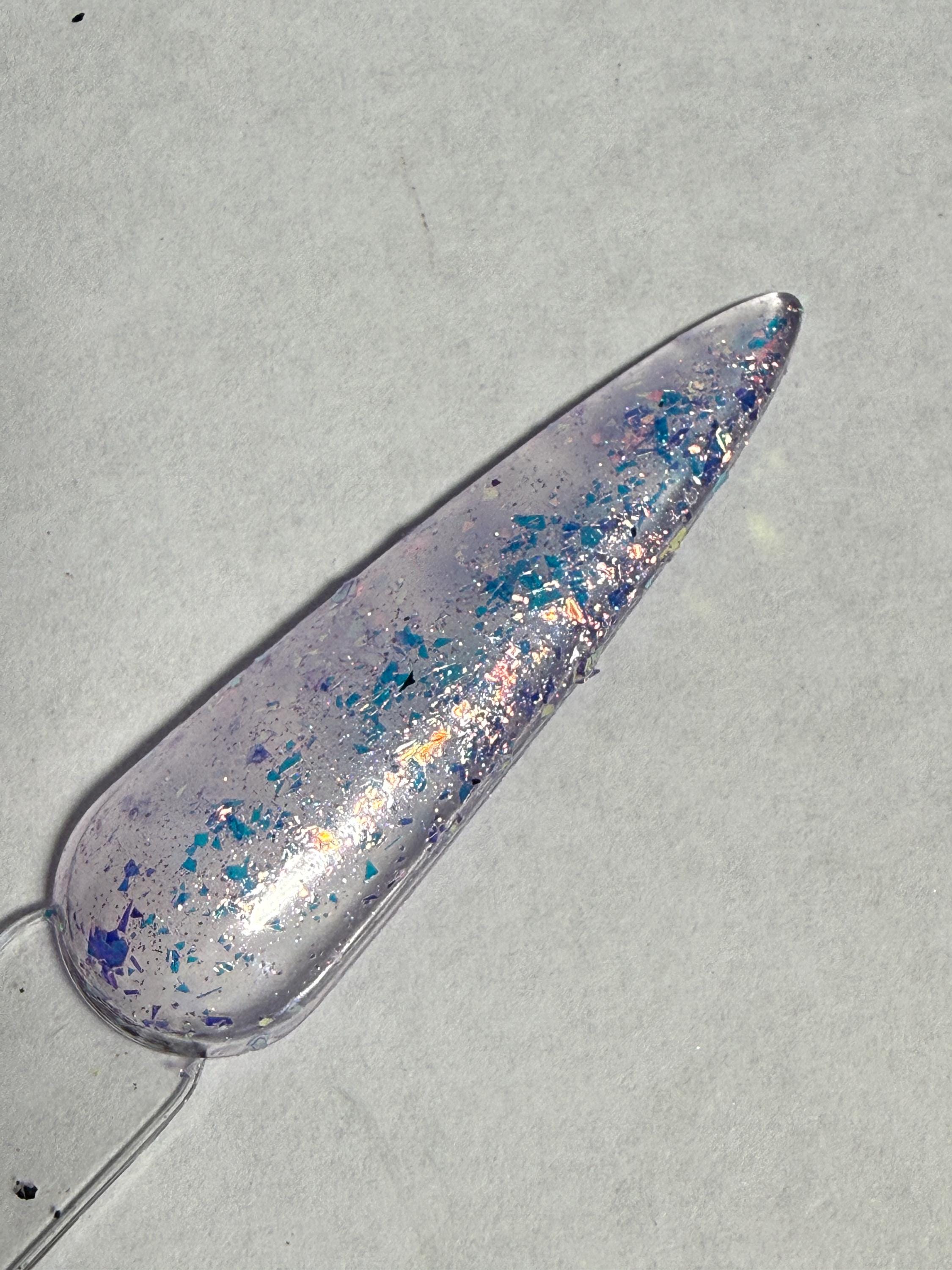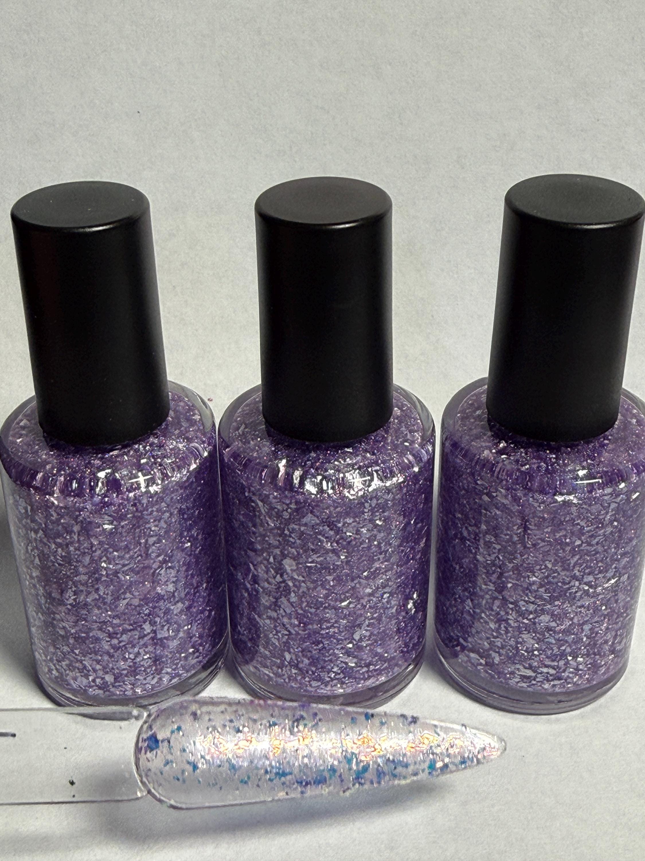 This nail polish comes in either 5 or 15ml bottles and has purple iridescent flakes in a barely-there purple holographic shimmery base.