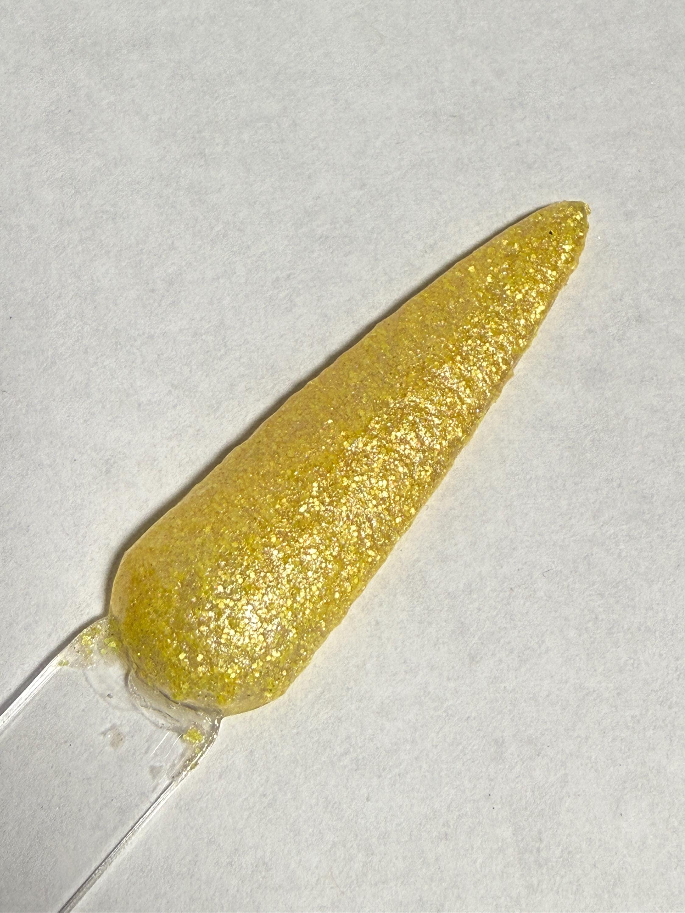 This nail polish comes in either 5 or 15ml bottles and has yellow matte glitter with a touch of very fine gold holographic glitter mixed in.