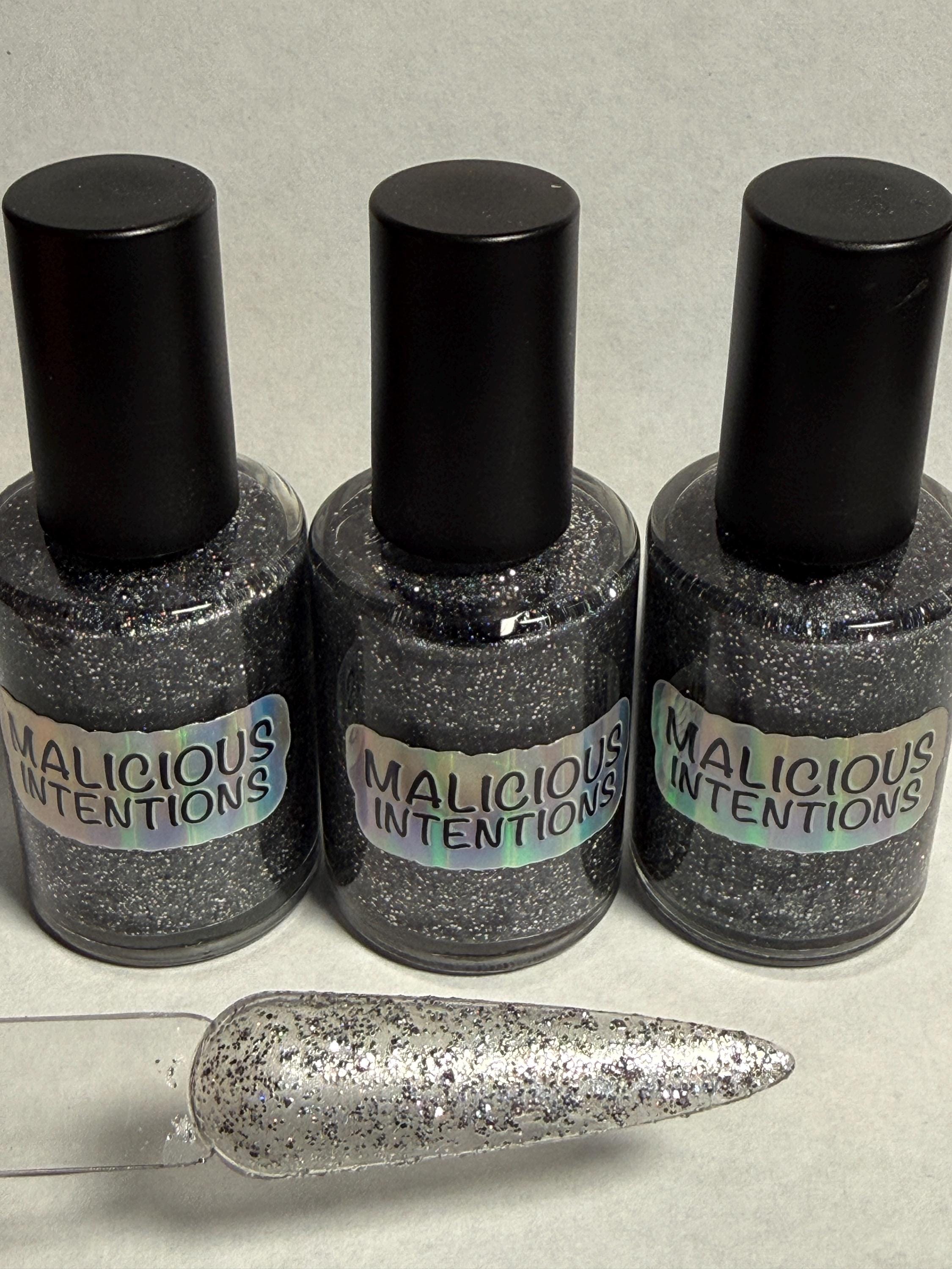This nail polish comes in either 5 or 15ml bottles and is a dark silver with fine holographic and reflective glitter.