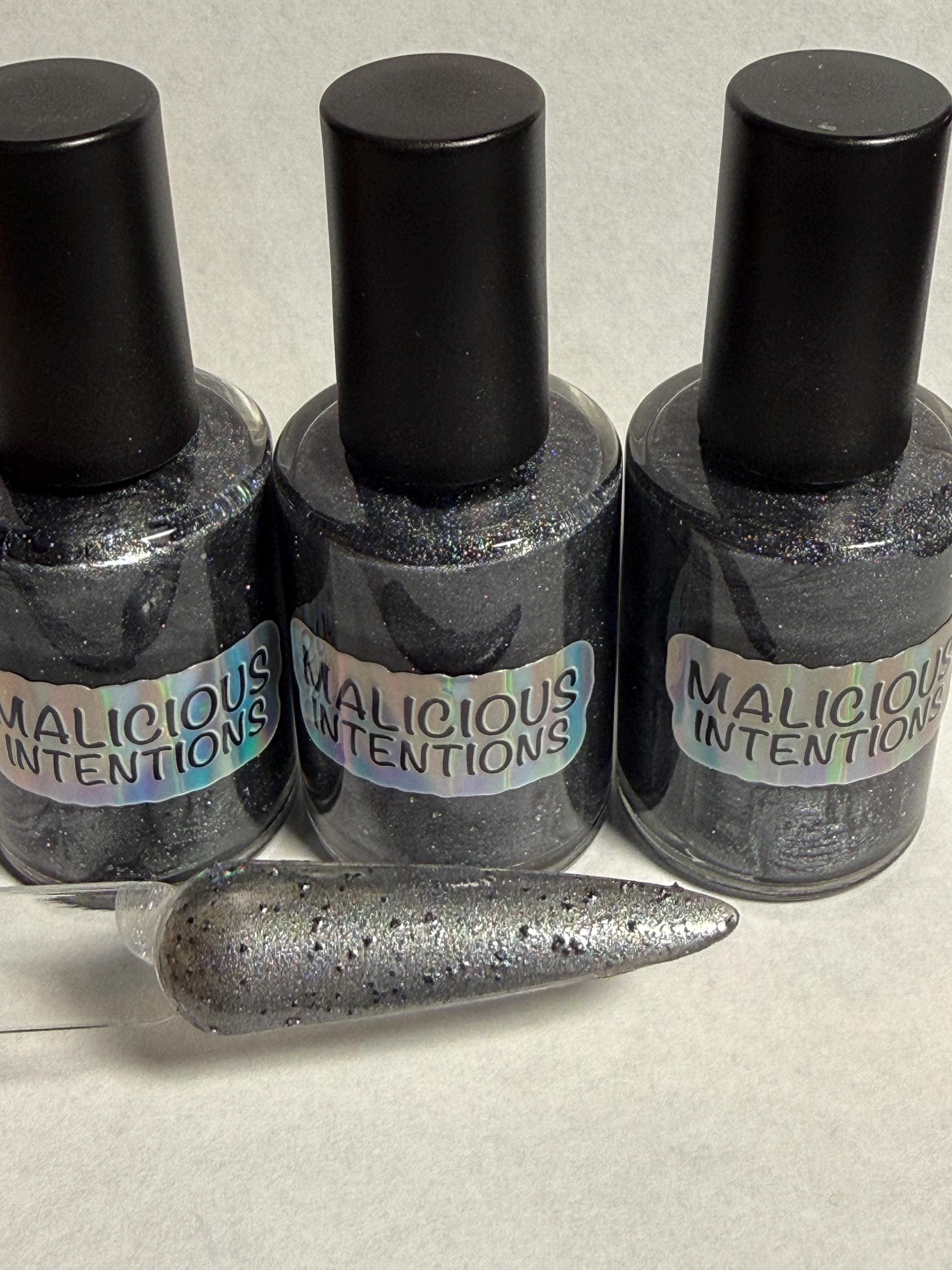 This nail polish comes in either 5 or 15ml bottles and is a shimmery gunmetal polish with XL reflective glitter.
