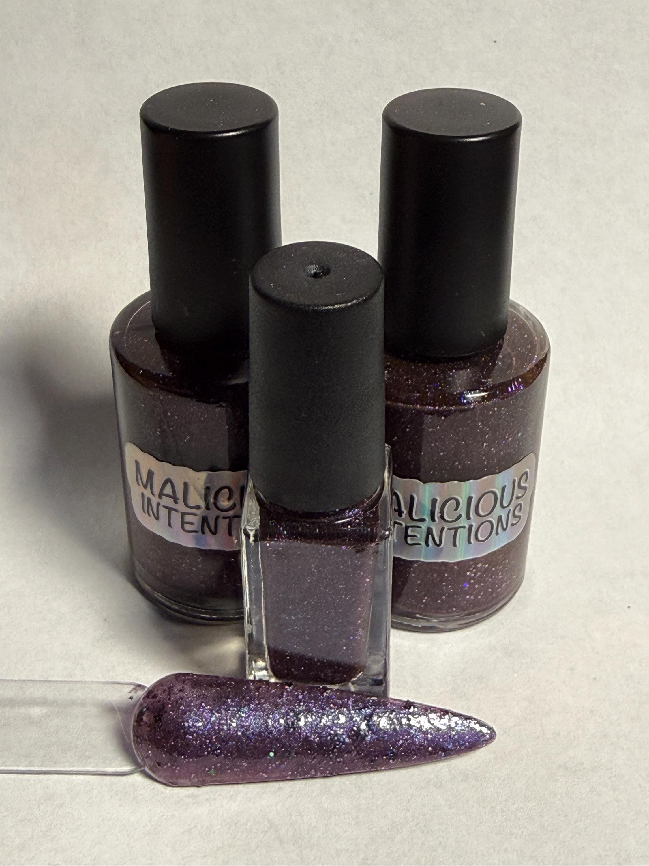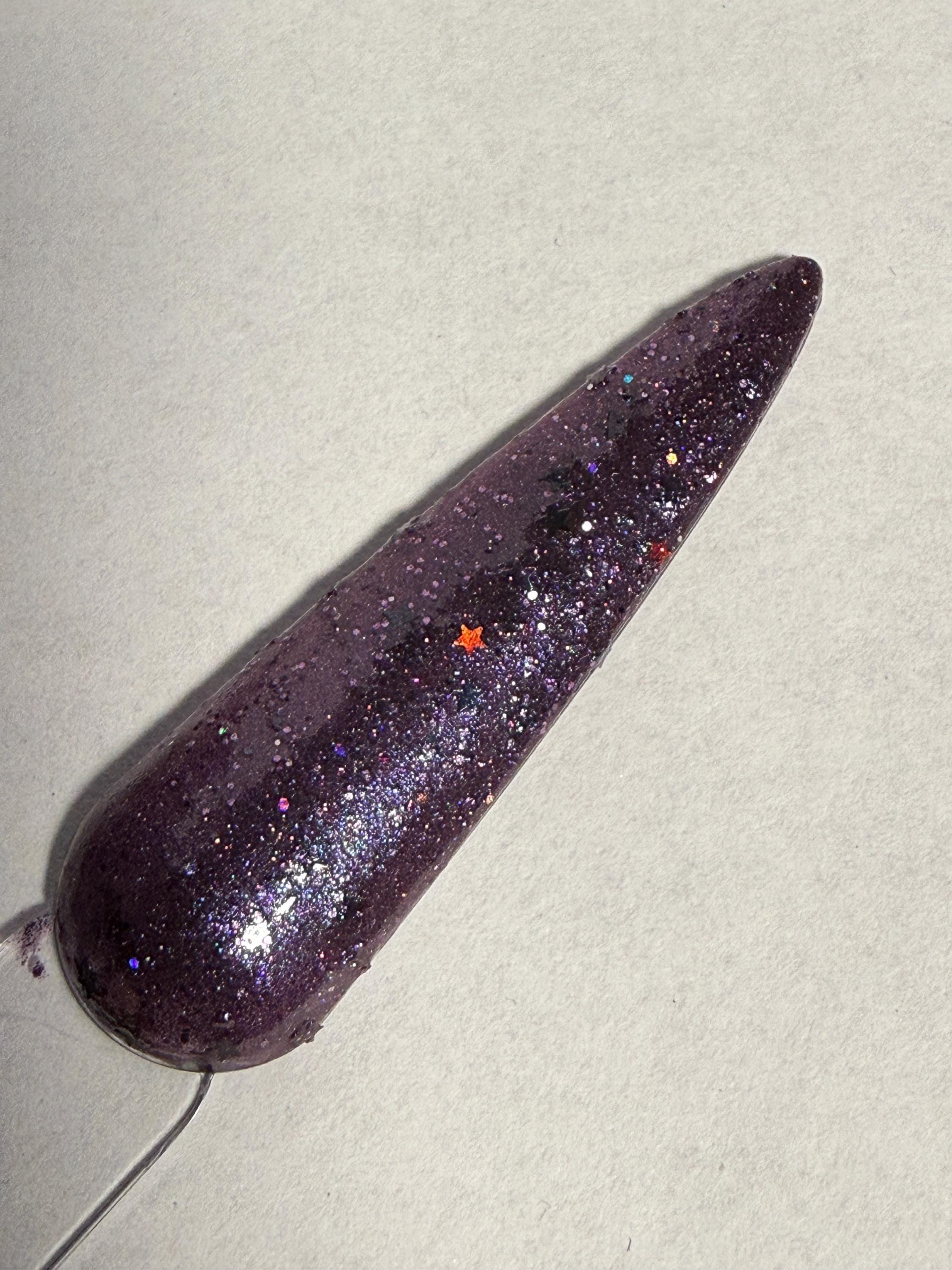 This nail polish comes in either 5 or 15ml bottles and has a plummy purple shimmery base with black holographic stars and glitter.