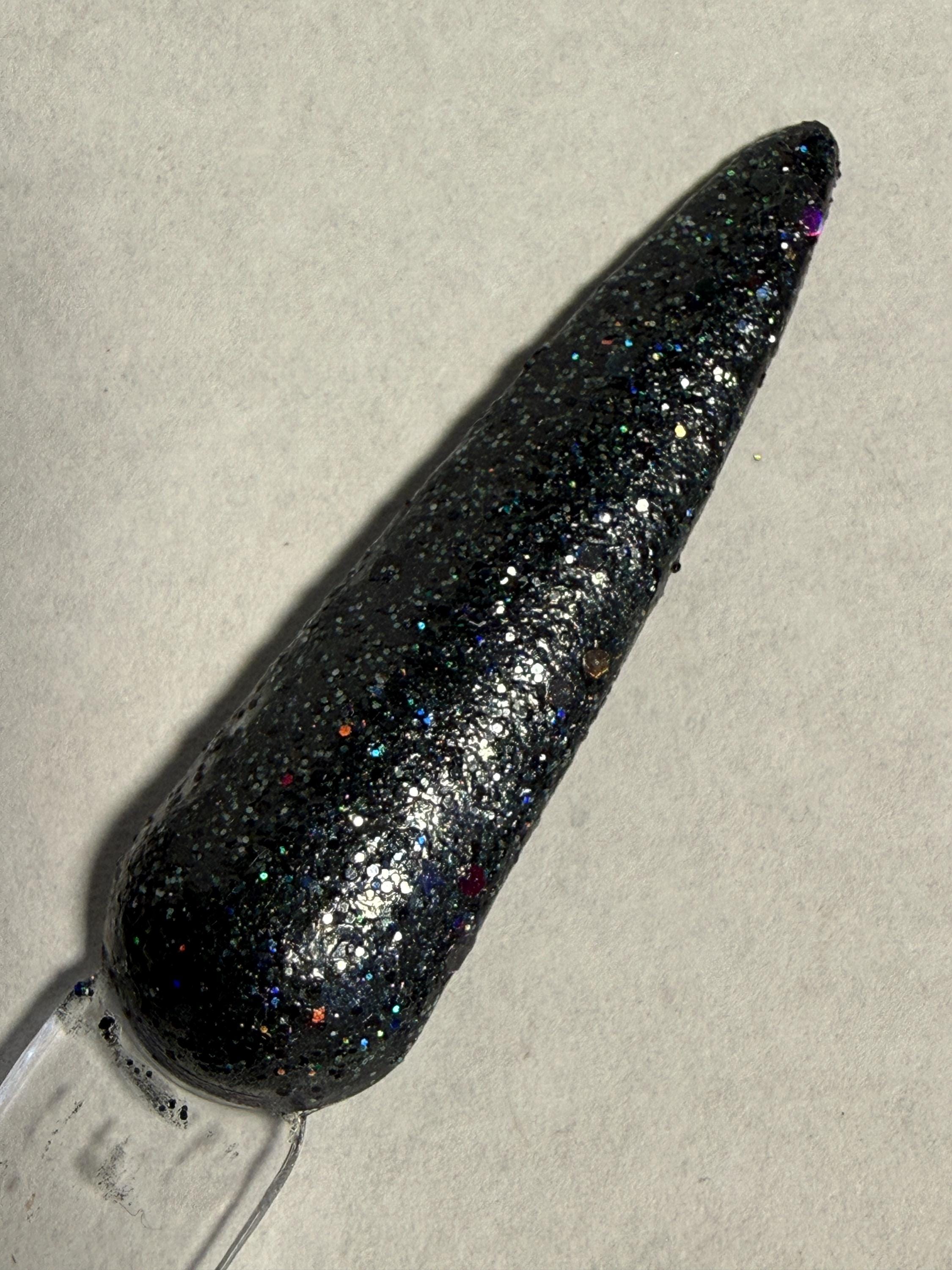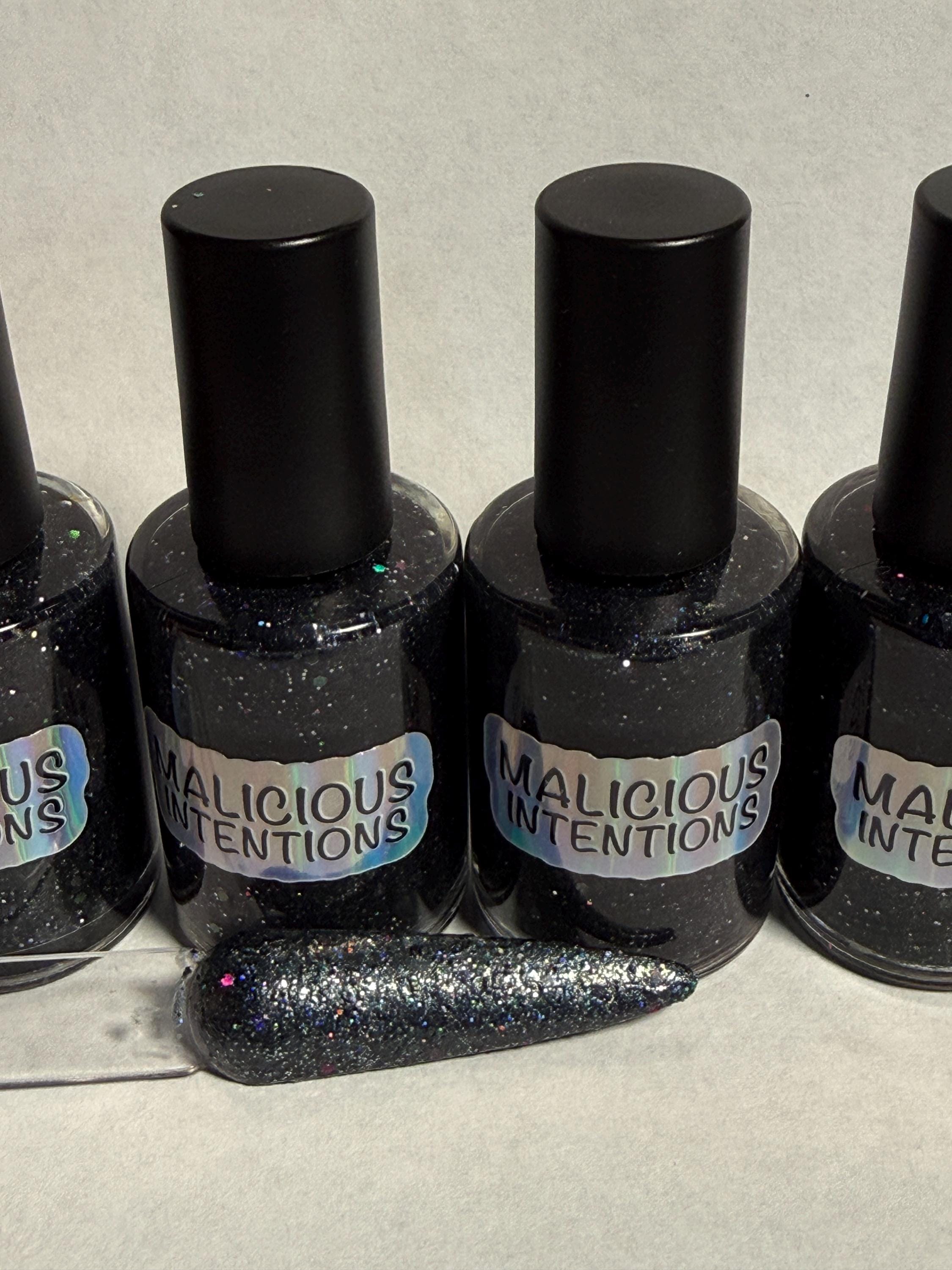This nail polish comes in either 5 or 15ml bottles and is a shimmery gunmetal polish with holographic black and pink duochrome glitter.