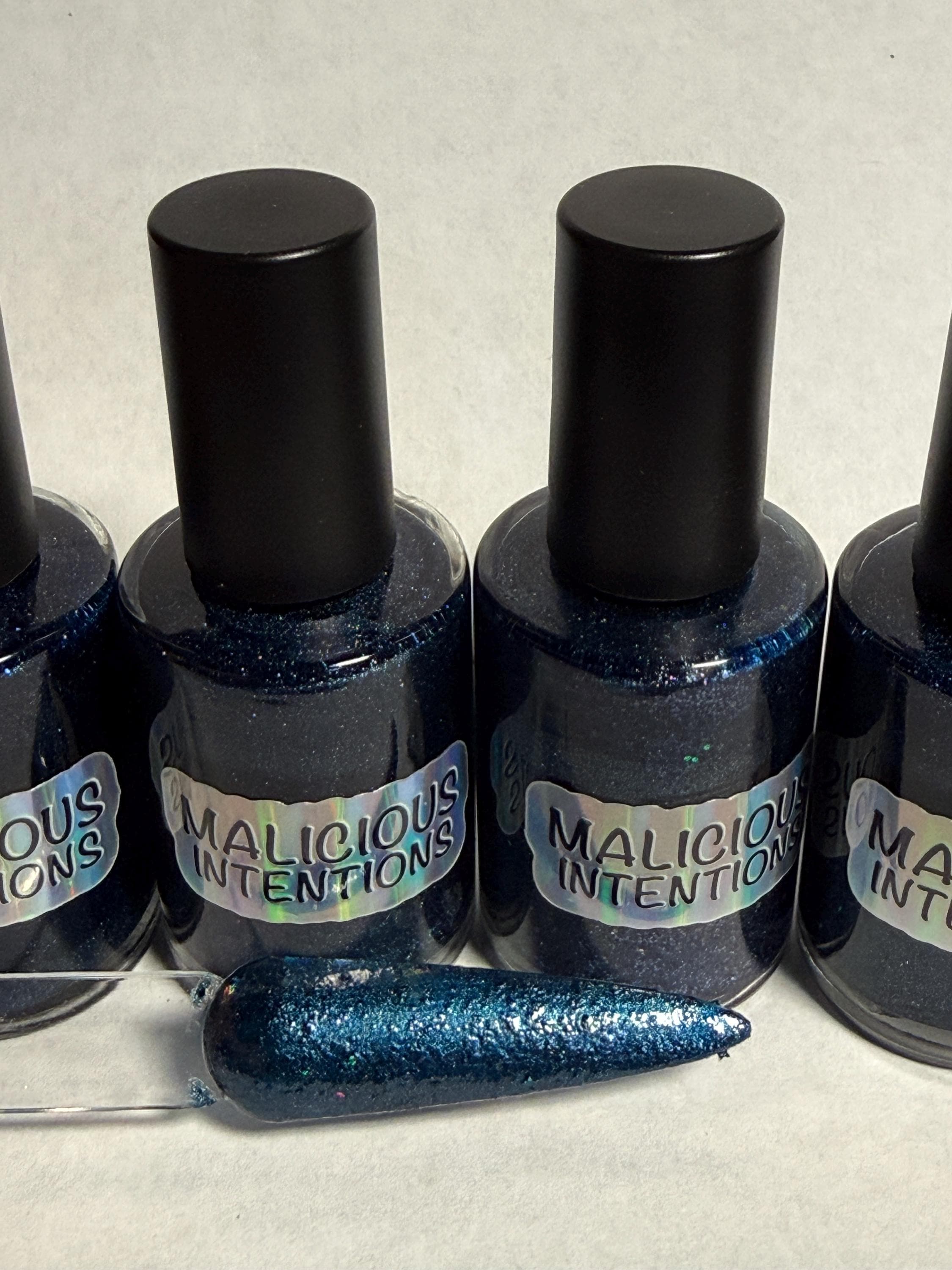 This nail polish comes in either 5 or 15ml bottles and is a very dark teal with silver holographic specks.