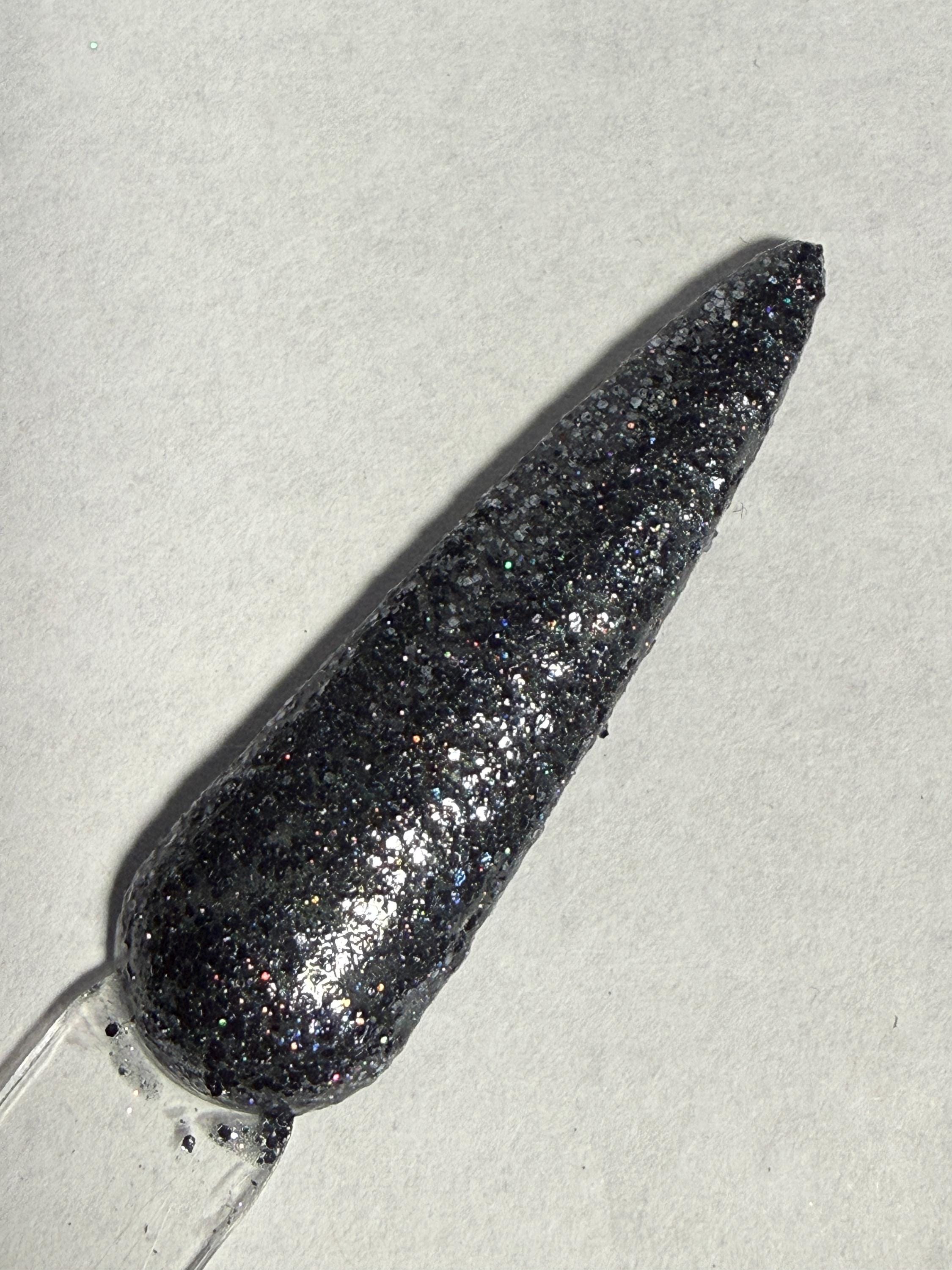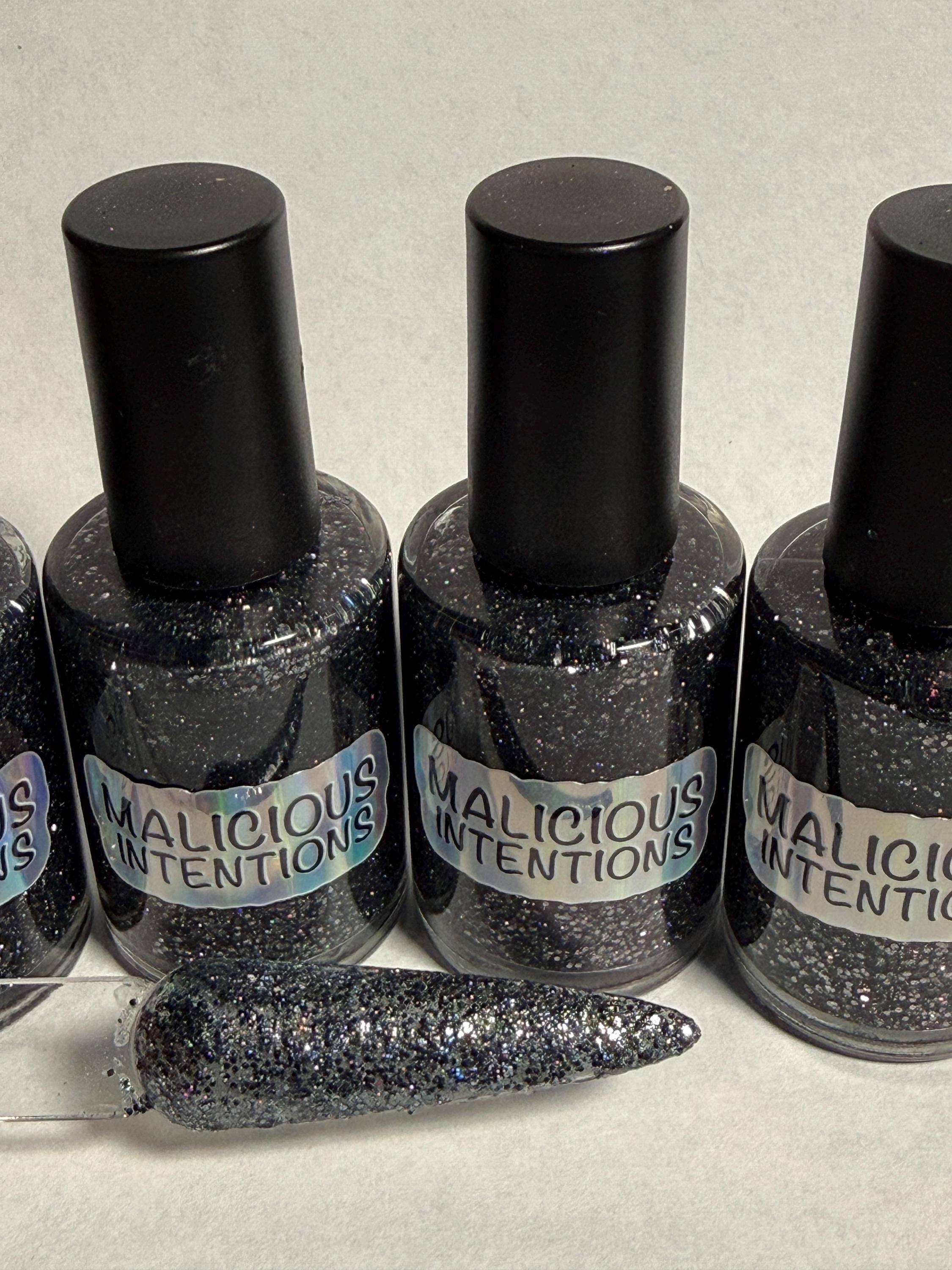This nail polish comes in either 5 or 15ml bottles and is a shimmery gunmetal polish with holographic and XL reflective glitter.