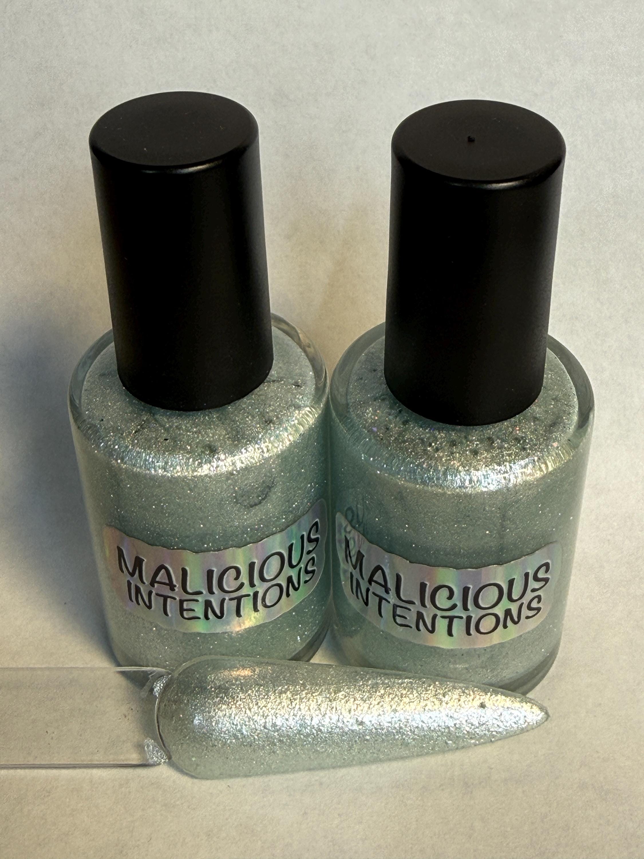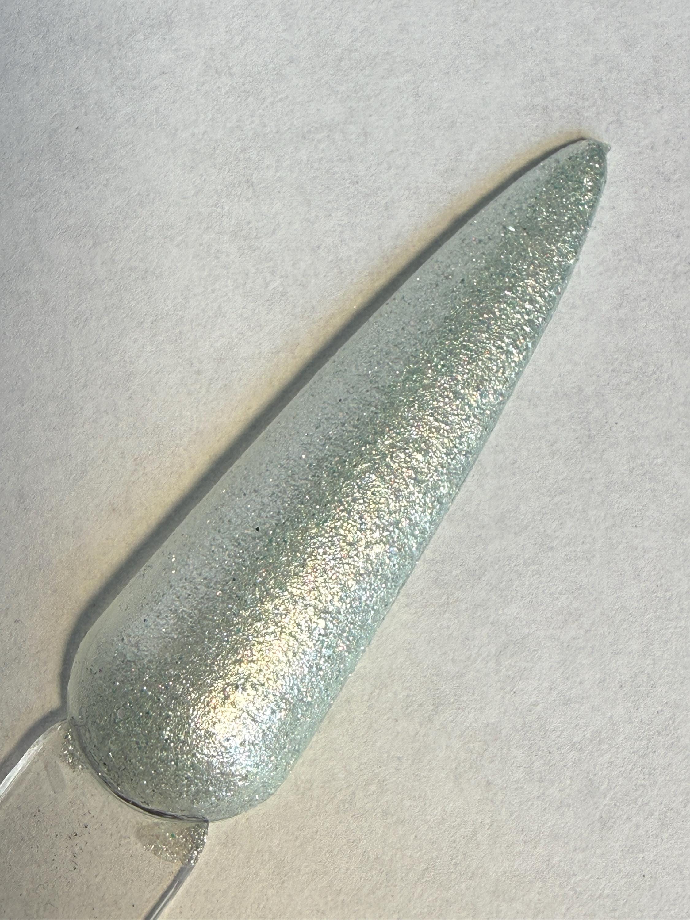 This nail polish comes in either 5 or 15ml bottles and is a mint green shimmer with fine holographic glitter and reflective glitter mixed in.