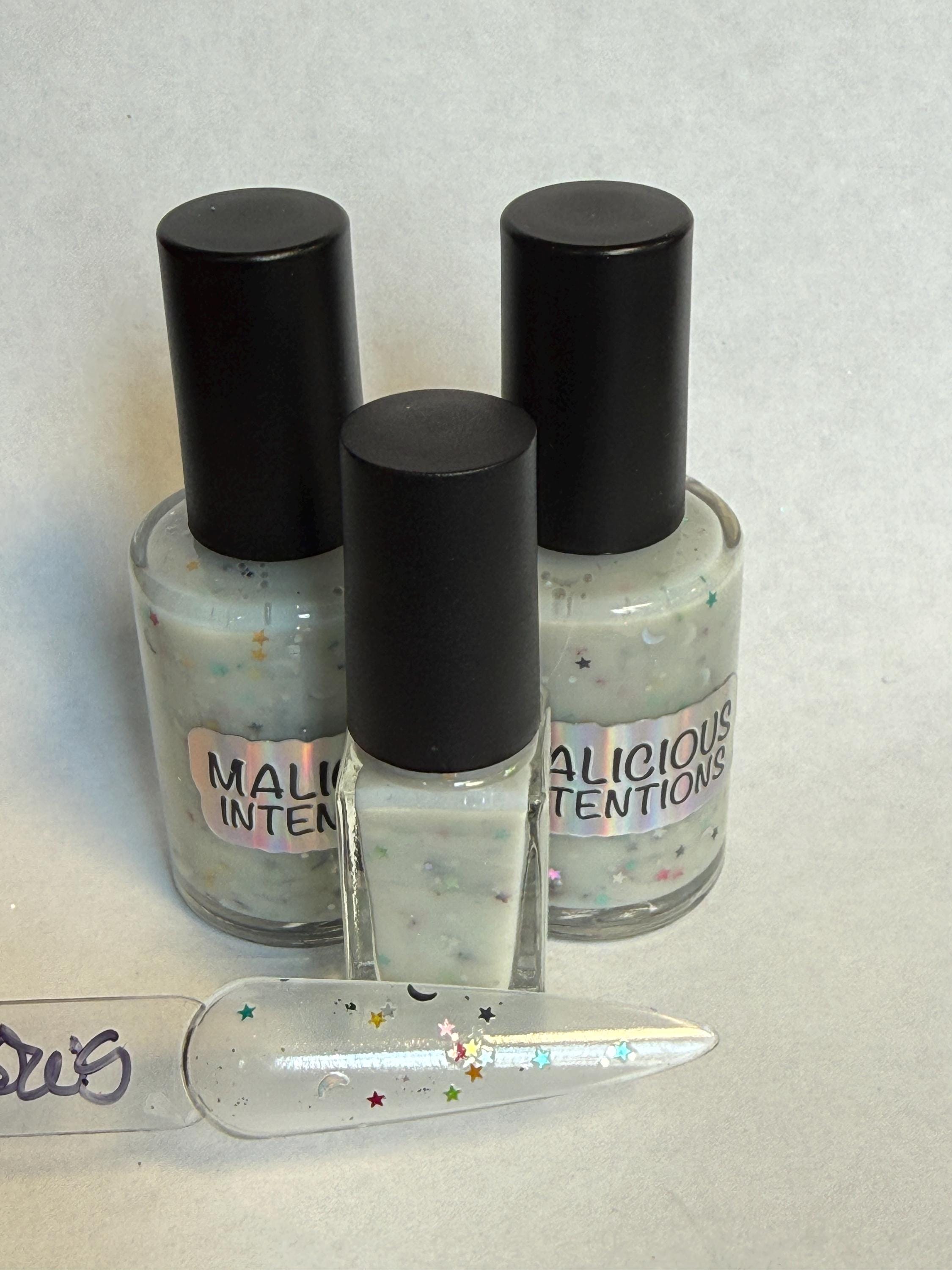 This is a gorgeous topper with a slightly milky white background. The stars and crescent moons are shiny and beautiful.