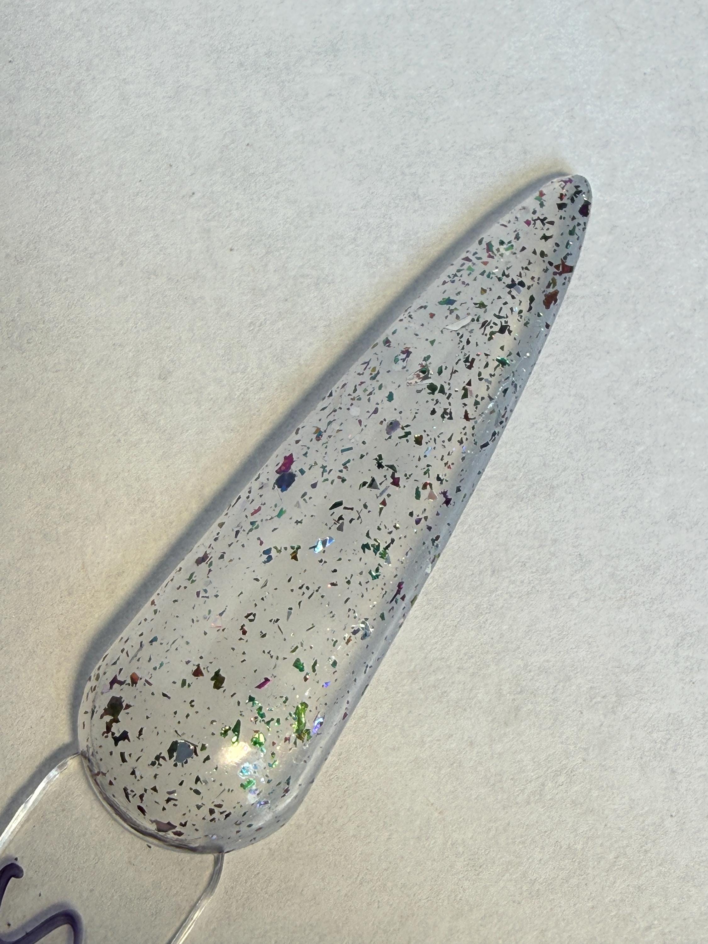 This nail polish comes in either 5 or 15ml bottles and is a shimmery white polish with chameleon and holographic flakes.