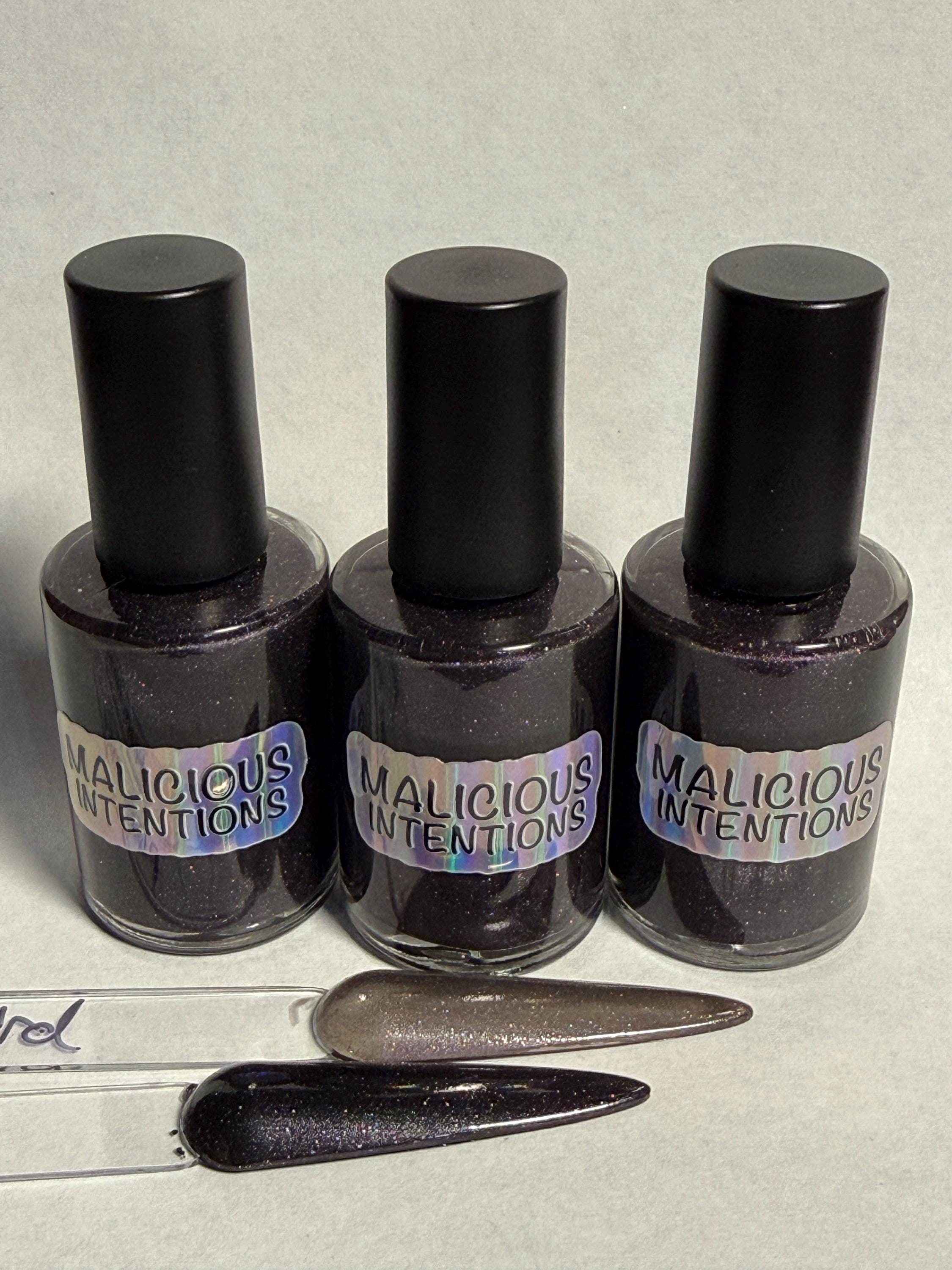 This nail polish comes in either 5 or 15ml bottles and is a deep purple holographic magnetic. You will need a magnet to take advantage of the magnetic properties within. It does not come with a magnet but if you'd like me to include one for $1, please check my other listings.