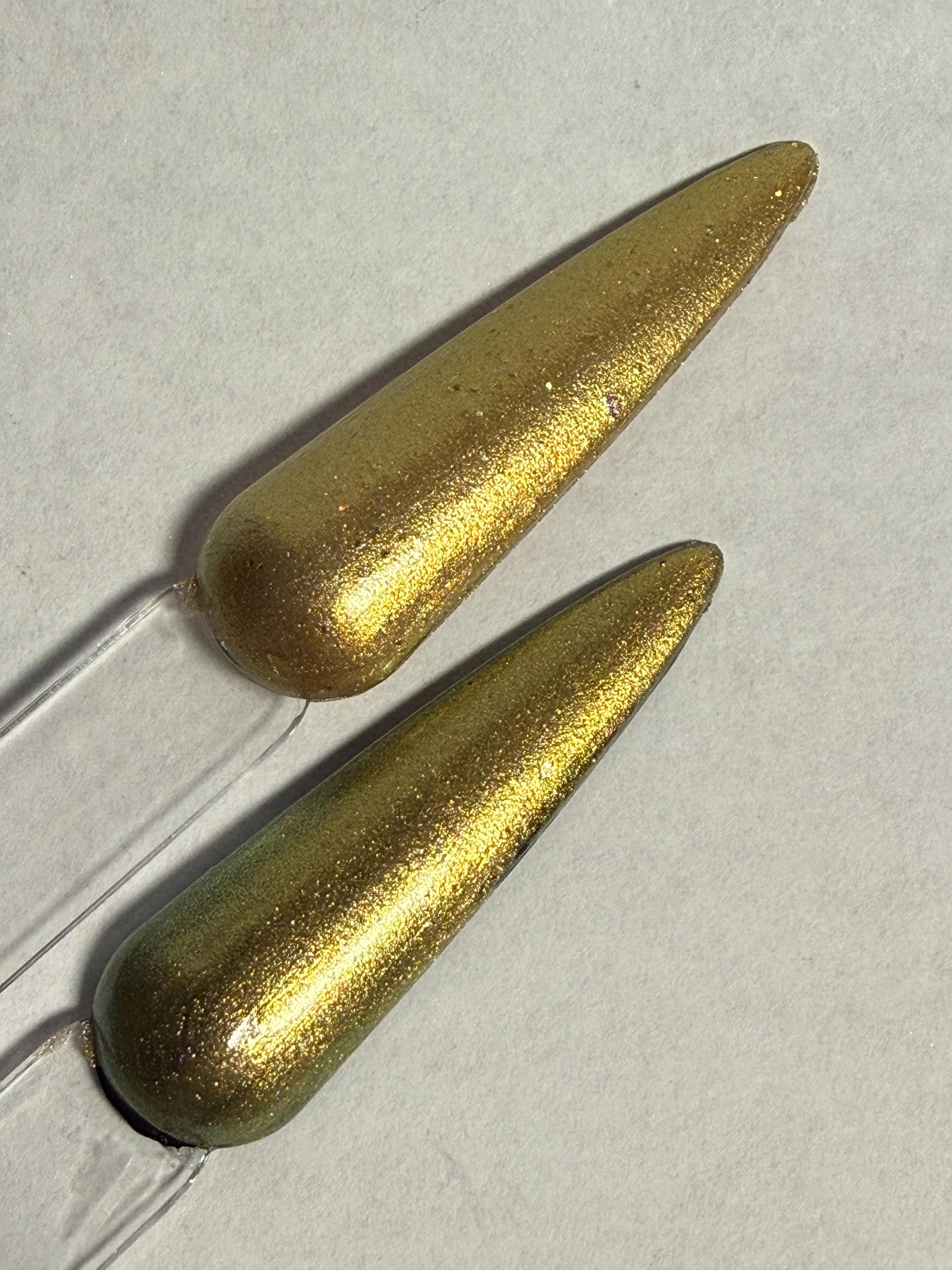 This nail polish comes in either 5 or 15ml bottles and is a magnetic green-leaning gold with holographic flakes. You will need a magnet to take advantage of the magnetic properties within. It does not come with a magnet but if you'd like me to include one for $1, please check my other listings.