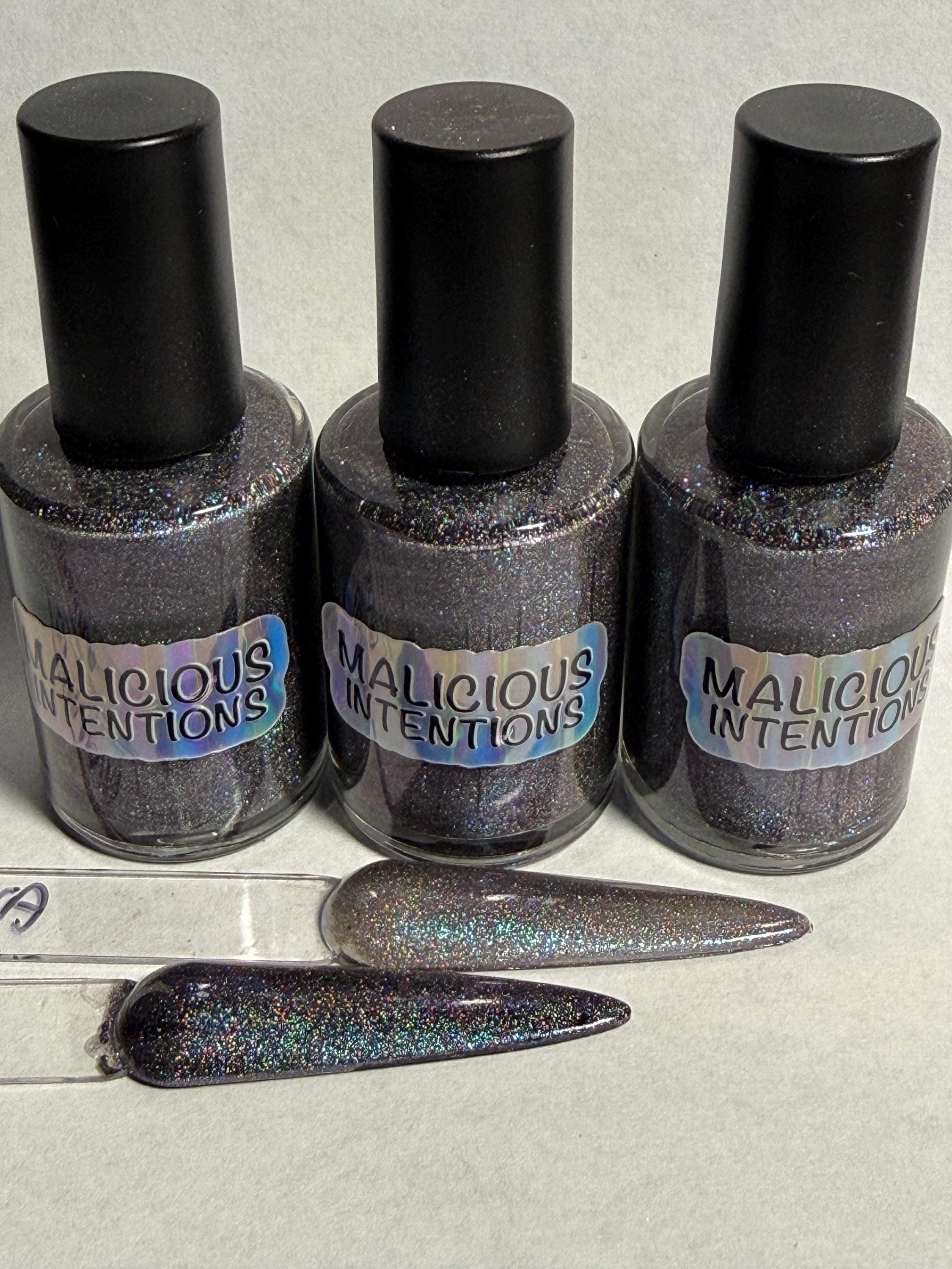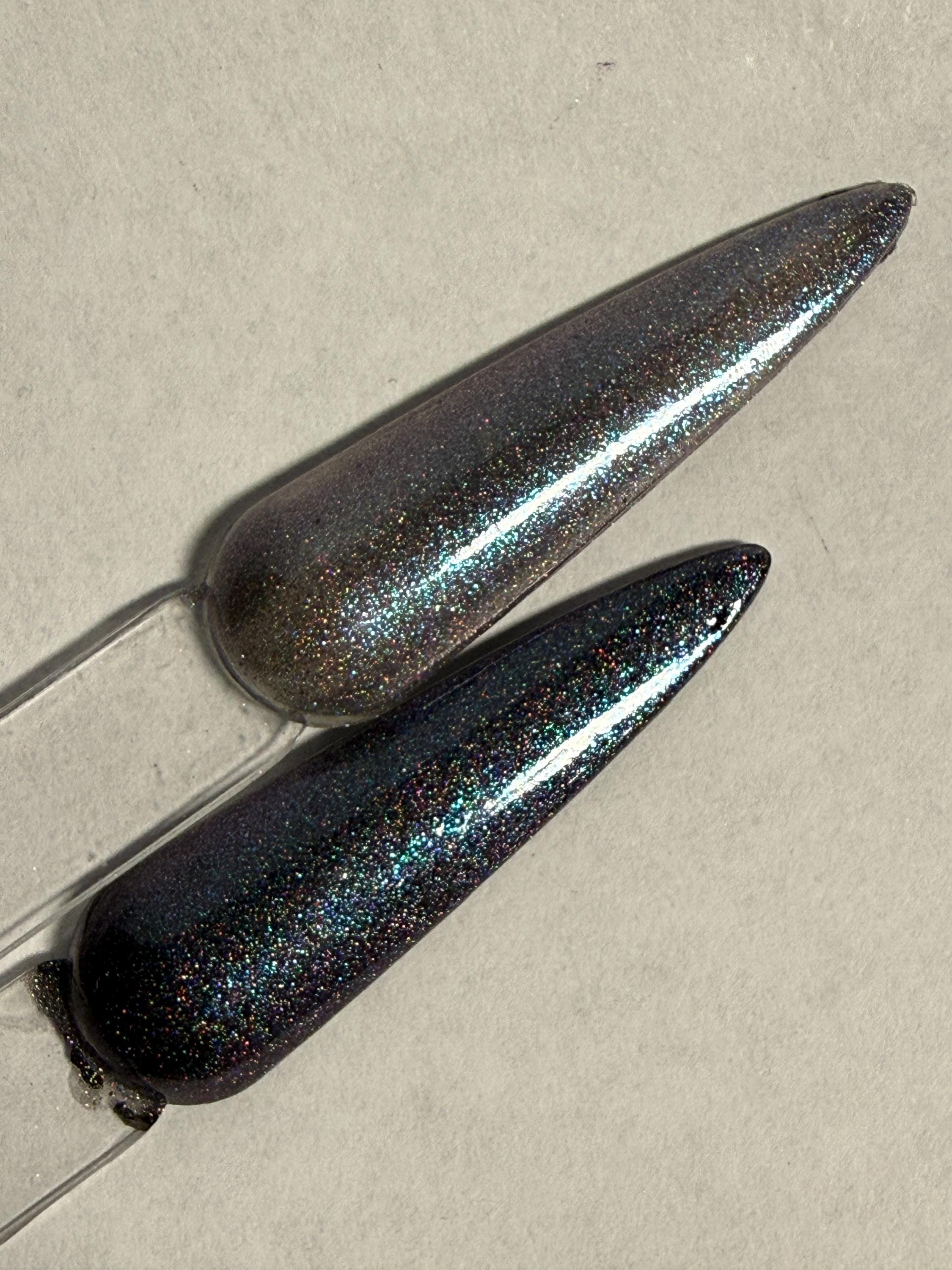 This nail polish comes in either 5 or 15ml bottles and is a magnetic silver holo with flashes of blue. You will need a magnet to take advantage of the magnetic properties within. It does not come with a magnet but if you'd like me to include one for $1, please check my other listings.