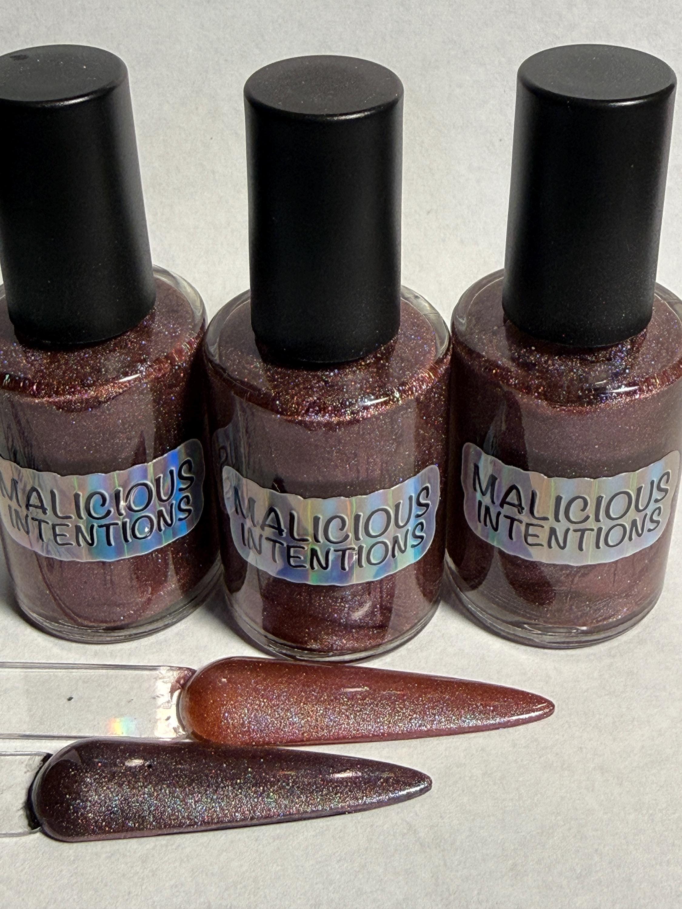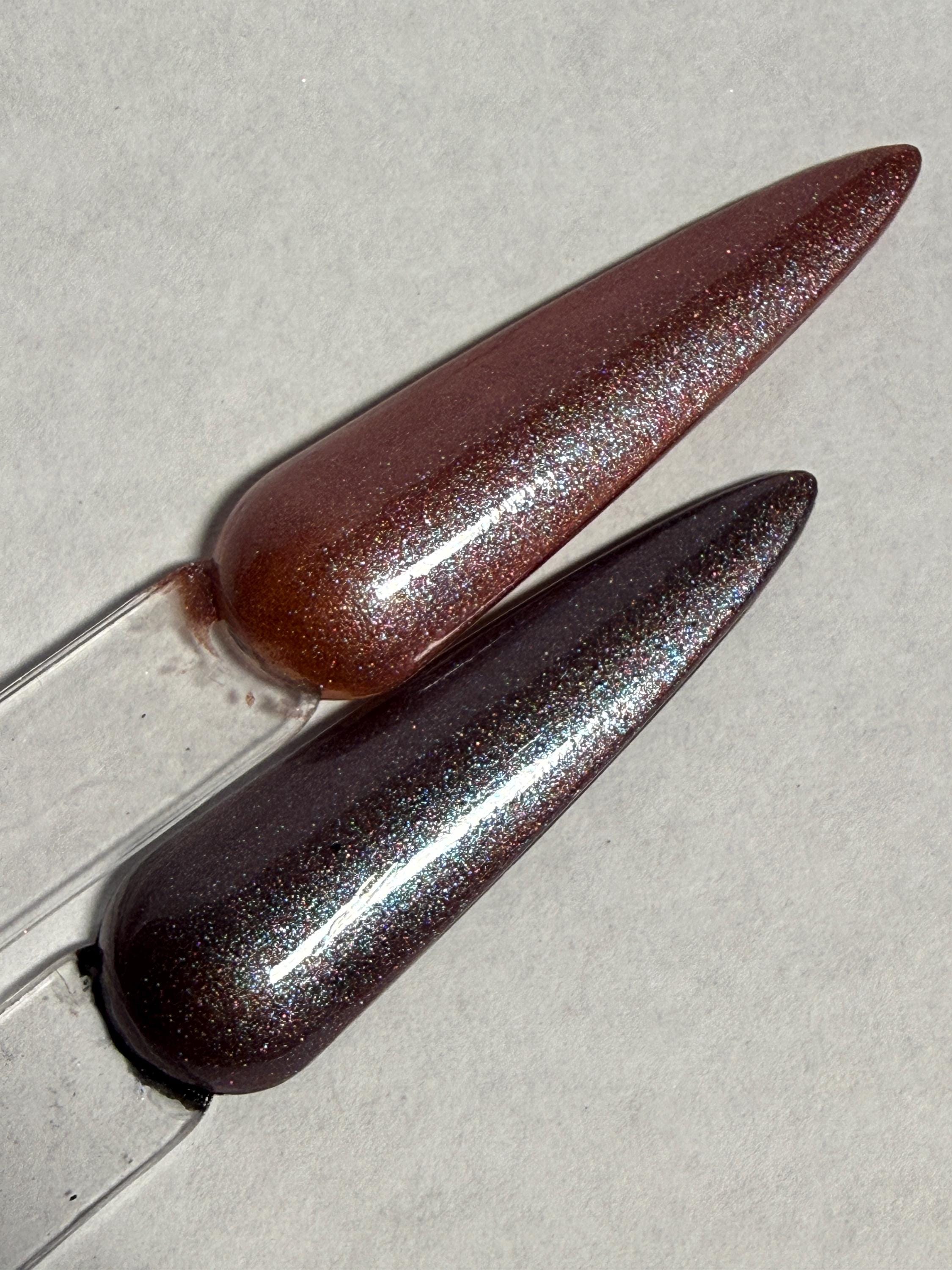 This nail polish comes in either 5 or 15ml bottles and is a magnetic dark bronze with silver holo mixed in. You will need a magnet to take advantage of the magnetic properties within. It does not come with a magnet but if you'd like me to include one for $1, please check my other listings.